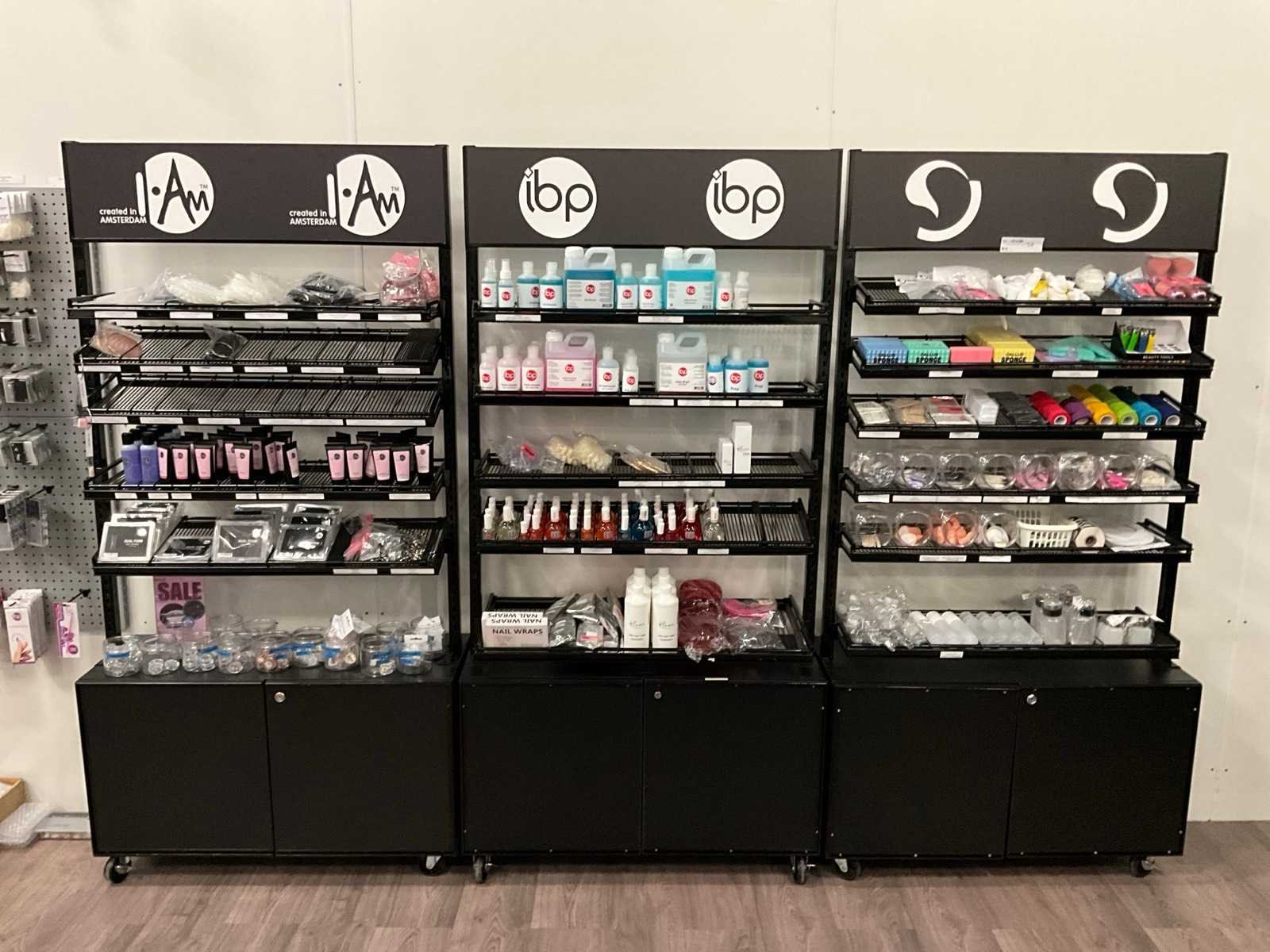 Inclusief 3x verrijdbare stelling H192xB95xD34cm Bestaande uit: 3x verrijdbare stelling met inhoud 1e: Callus sponge 2e: The Gel Bottle 3e: Rhinestones 4e: Color Pops 5e: Tip cutter 6e: Manicure borstel 7e: Liquid pumps 8e: IBP UV cleanser 9e: Oils 10e: Acetone 11e: Nail Wraps 12e: Etc