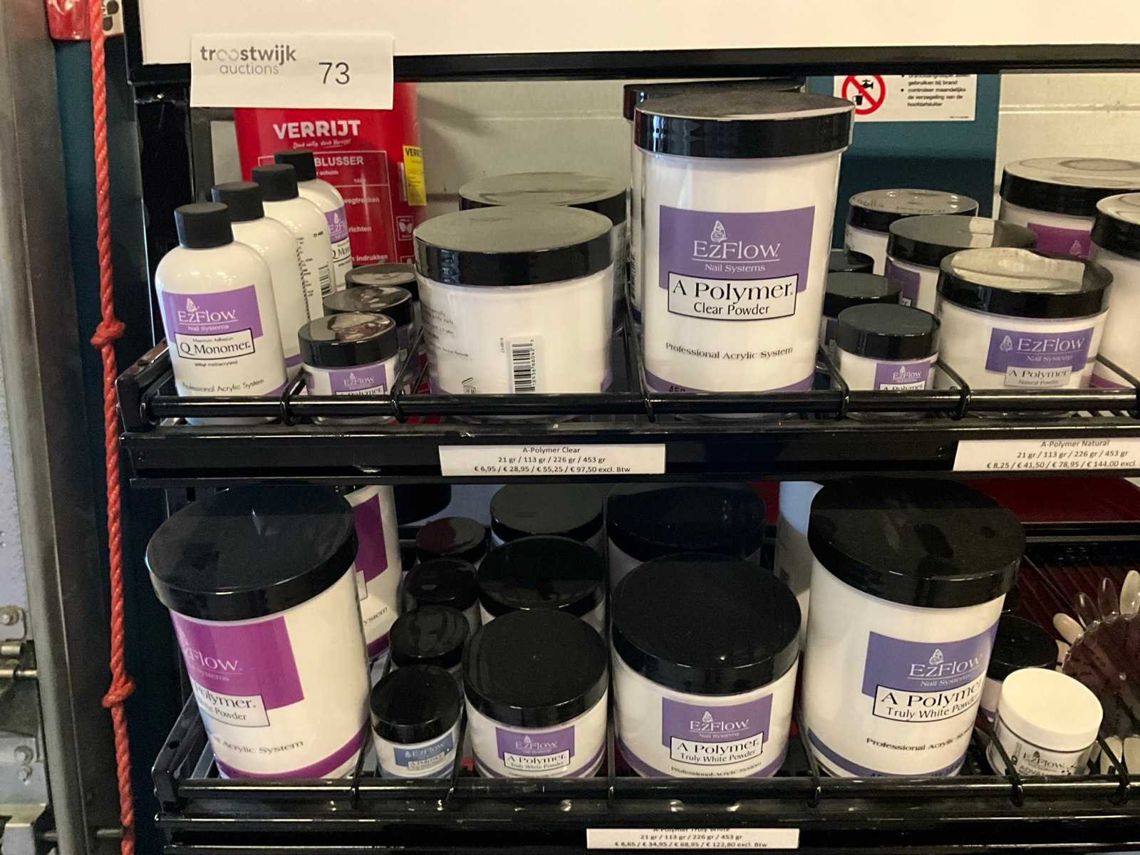 Bestaande uit onder andere: A polymer clear powder, brush cleaner, tips, olie, gel remover, soft gel tips, etc; Inclusief verrijdbare stelling H192xB95xD34cm Merk: EzFlow/IBD Kleur: Diverse