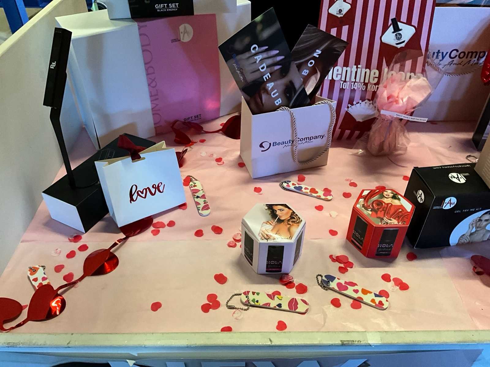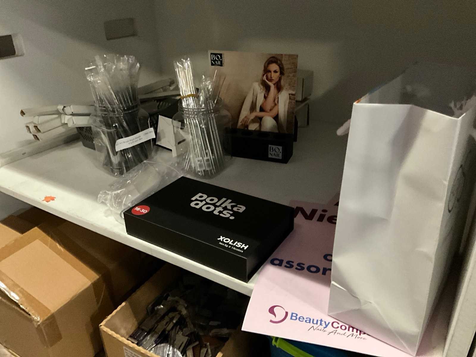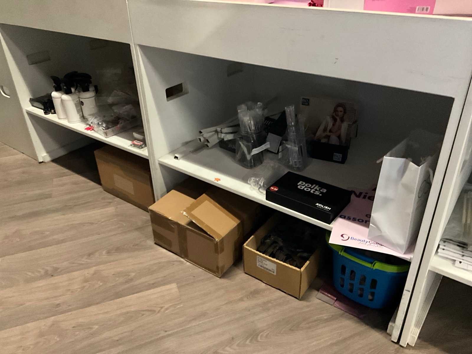 Bestaande uit: alles op balie en vakken erachter 1e: I.Am giftset Black Energy 2e: I.Am gift set Blushing bloom 3e: I.Am treatment kits 4e: I.Am acrylgel 5e: Candy Coat lamp 6e: Nail stuff Paraffine bad 7e: Kwasten 8e: Nagelschaartjes/knippers 9e: Etc