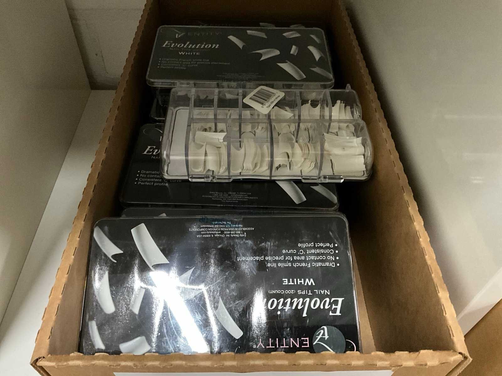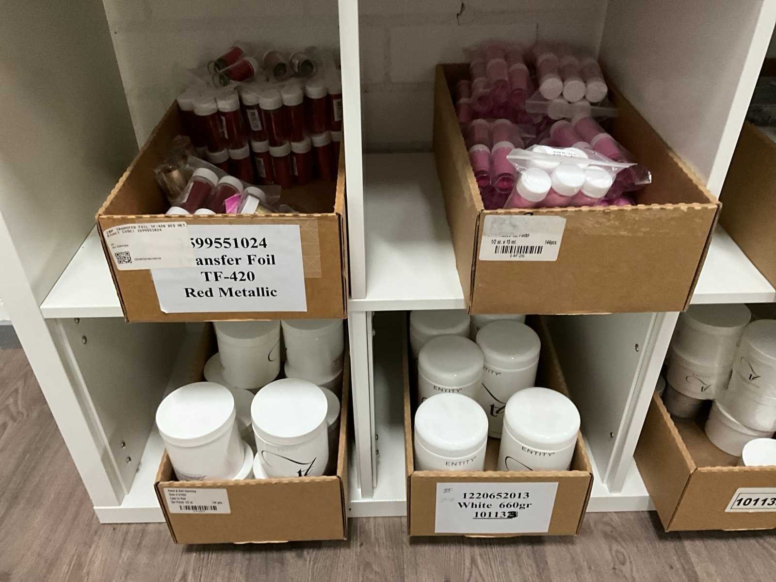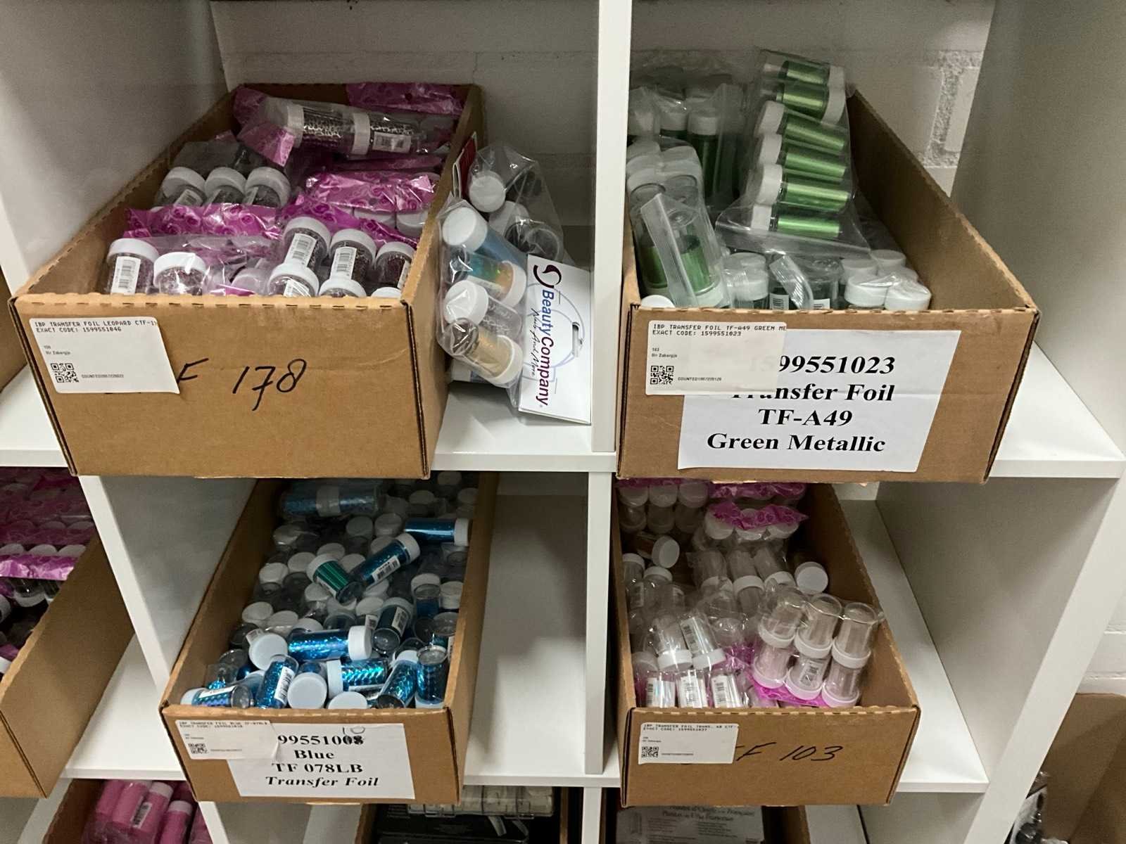 Betreft de inhoud van vakkenkast, bestaande uit onder andere: nail decorations, water transfer tattoos, transfer foil, nail tips, acrylpoeder en Ardell wenkbrauw pomade