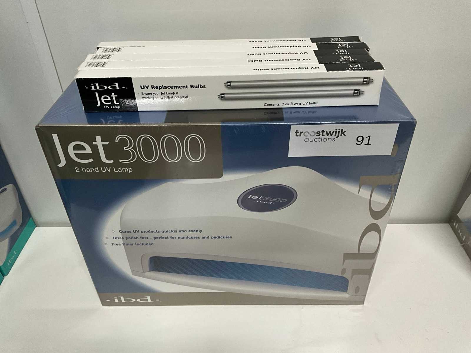Geschikt voor 2 handen; met timer en UV replacement bulbs; ongebruikt Merk: IBD Model: Jet 3000 Kleur: wit