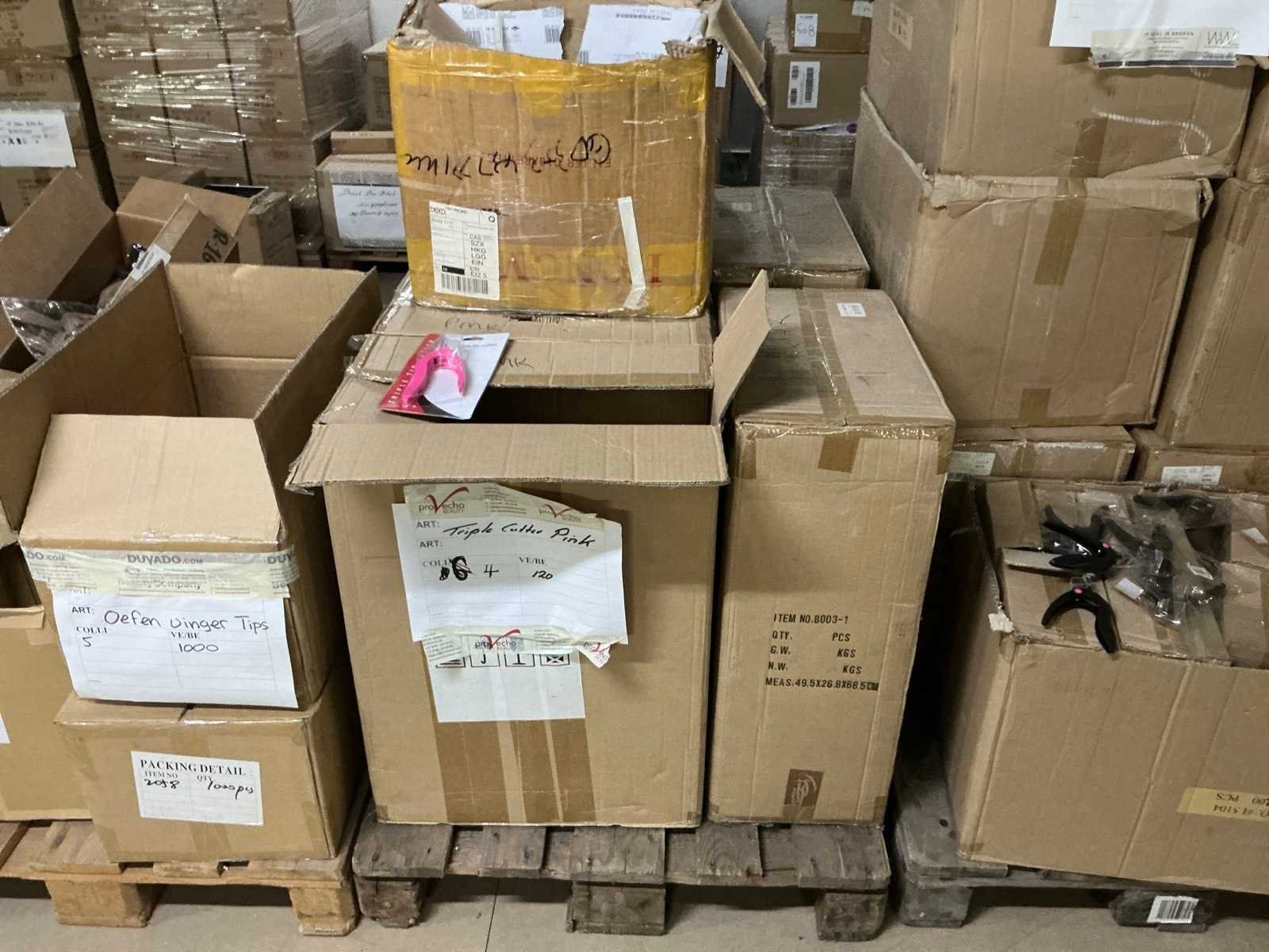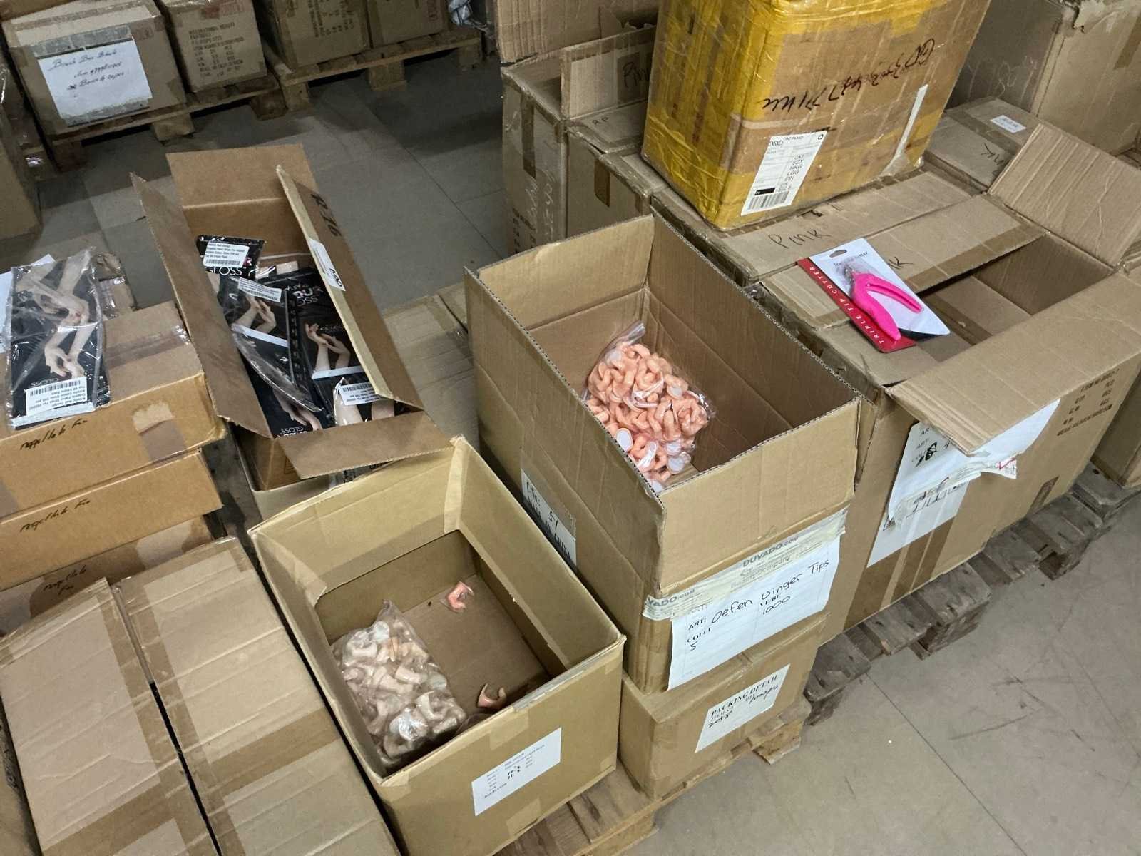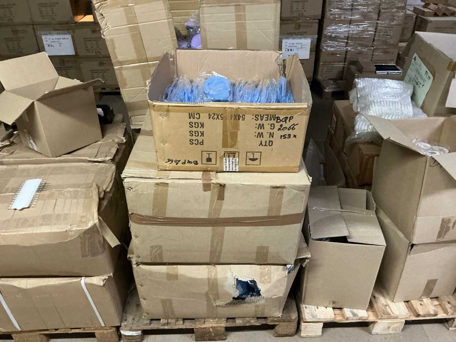 W.o.: cutters, oefenvingers, slippers, handschoenen en werkmaterialen. Op 16 pallets.