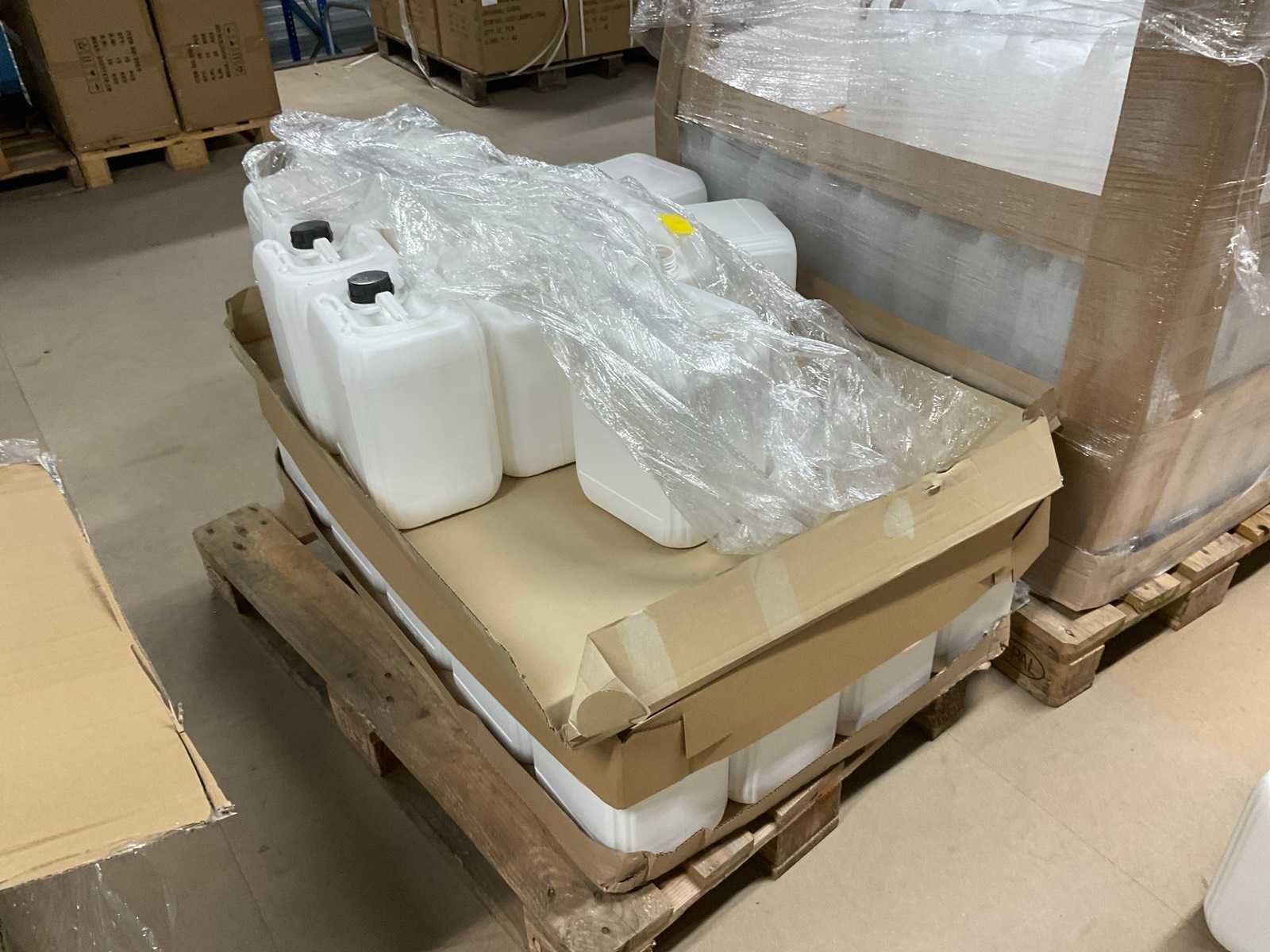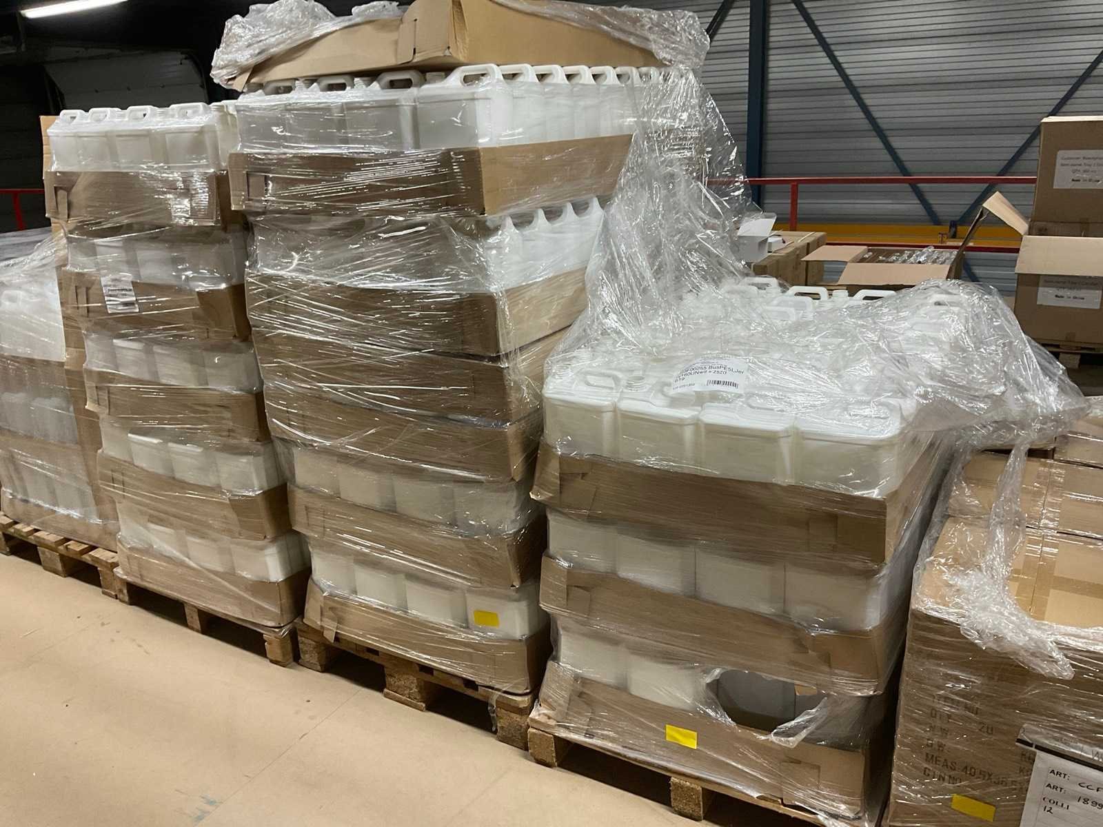 Bestaande uit: 30x wit 10 liter zonder dop, 100 x doorzichtig 5 liter zonder dop, 580x wit 5 liter zonder dop, op 3 europallets en 2 wegwerp.