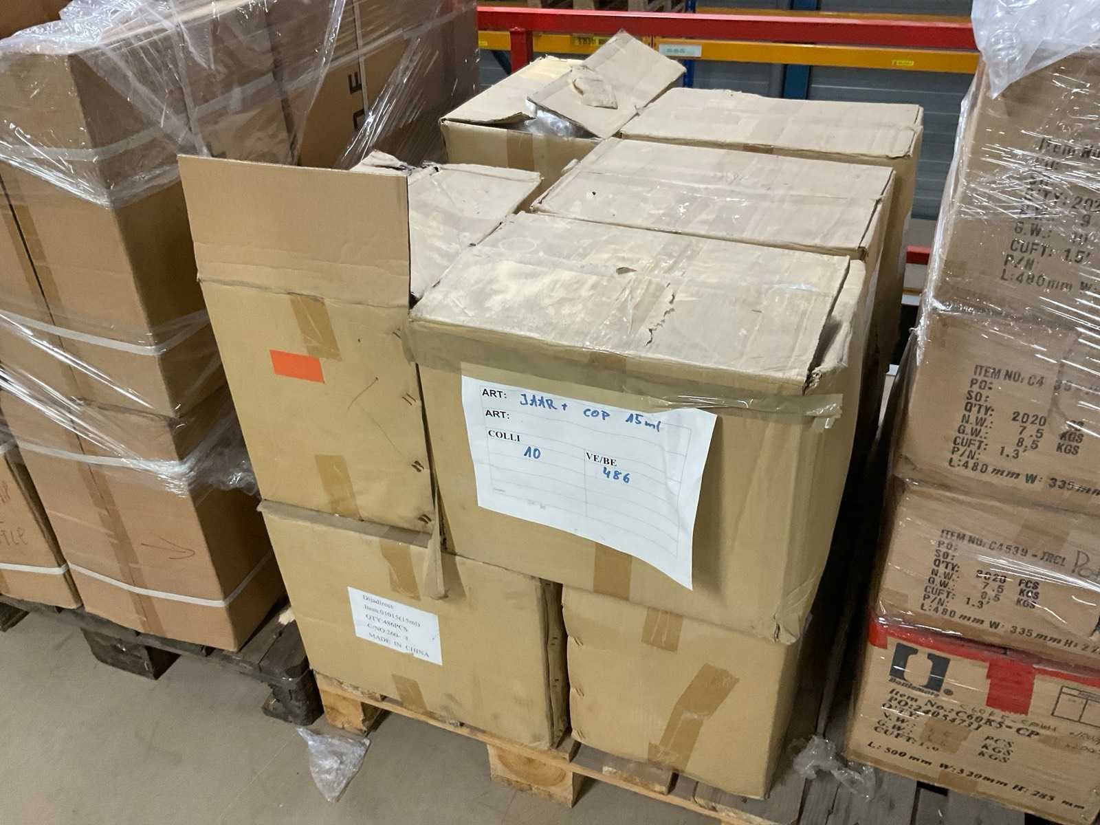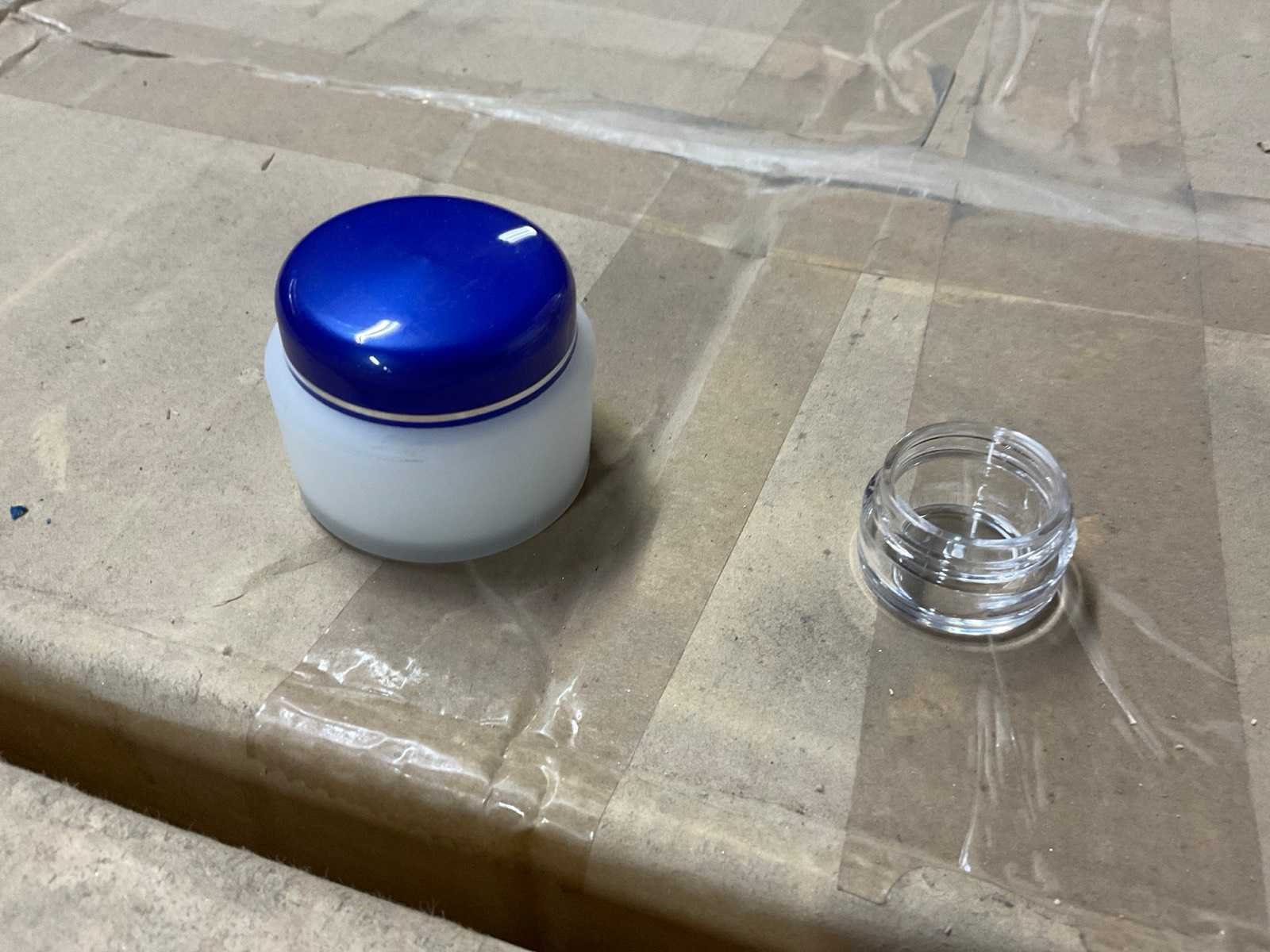 Inhoud potje met blauw deksel 15 ml. Op 2 europallets.
