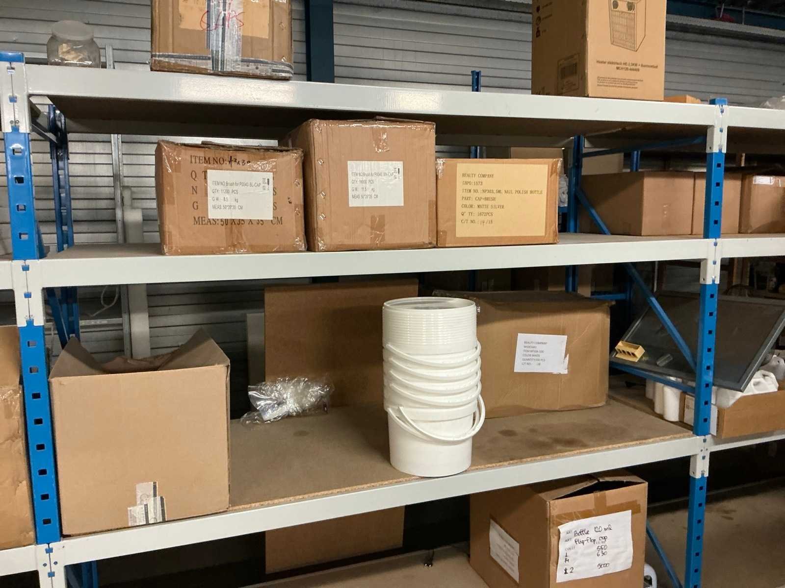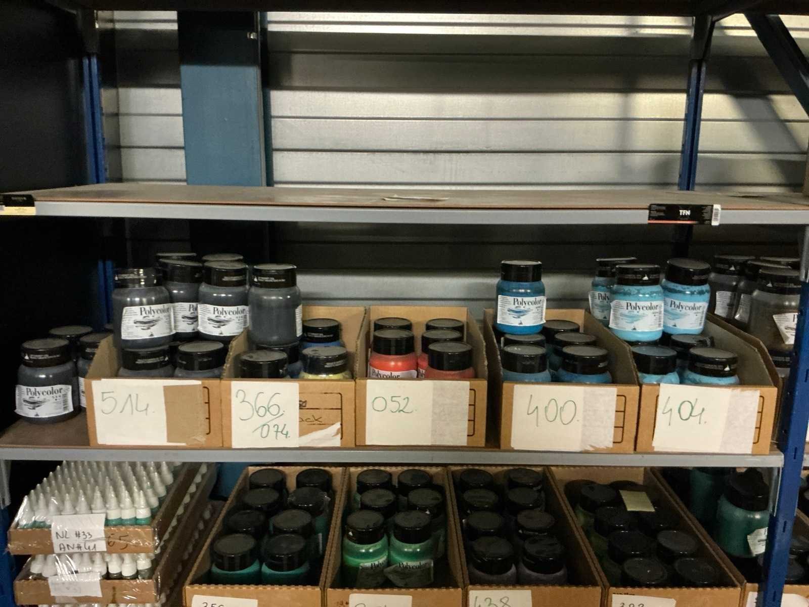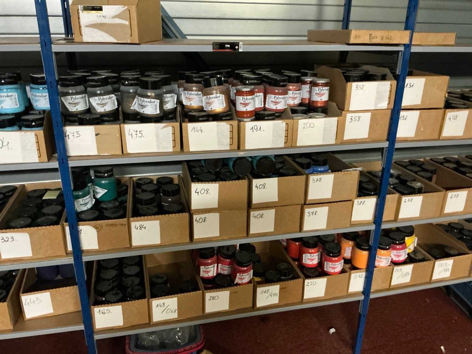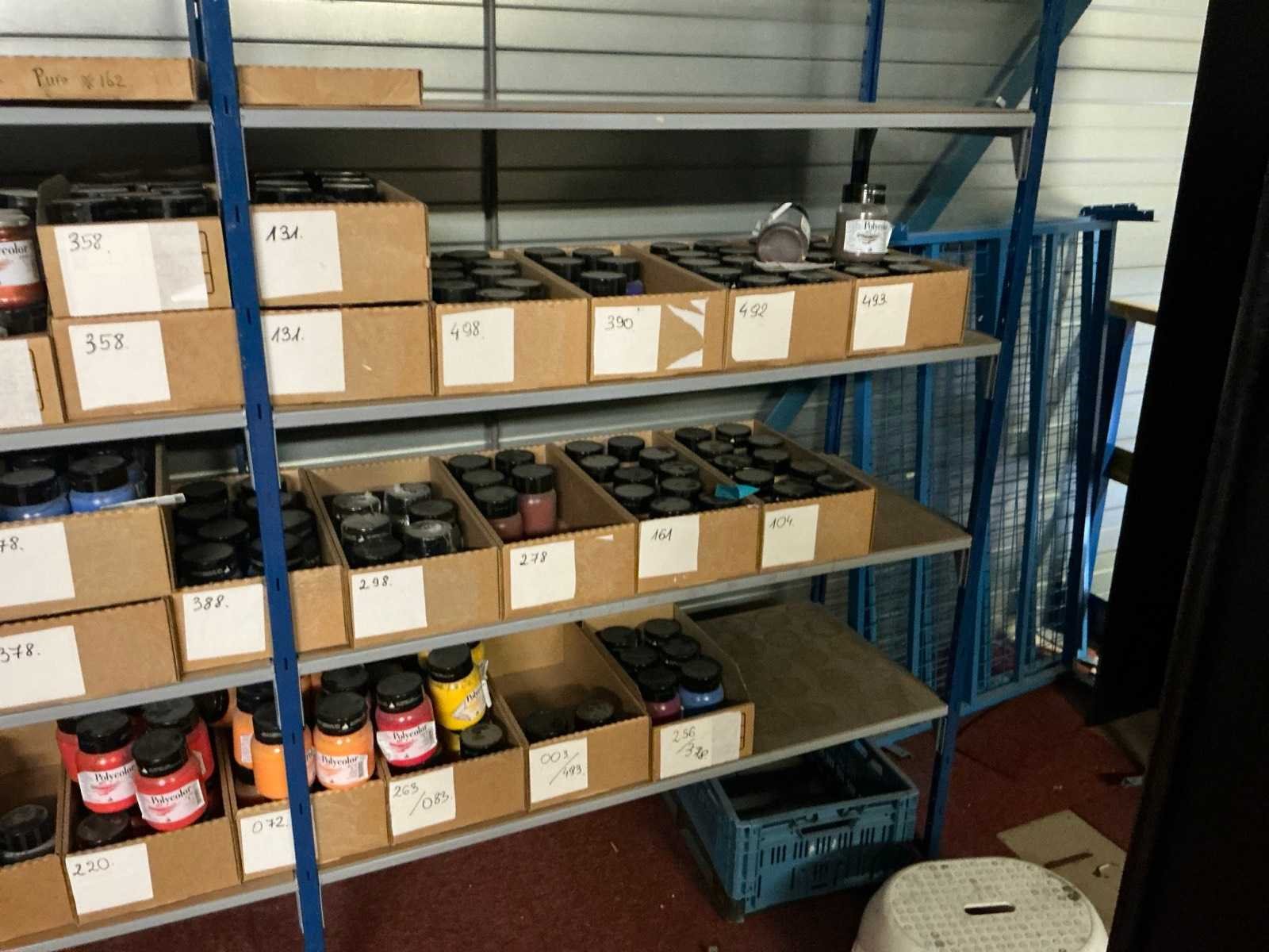 Dit kavel bevind zich op de eerste verdieping bereikbaar middels een vaste trap. Bestaande uit: Diverse kleurstoffen 1e: Flessen en potten 2e: Cosmetica verpakkingsmaterialen 3e: Potten met Acryl kleuren 4e: Rollen met product labels en stickers 5e: Decoratiematerialen