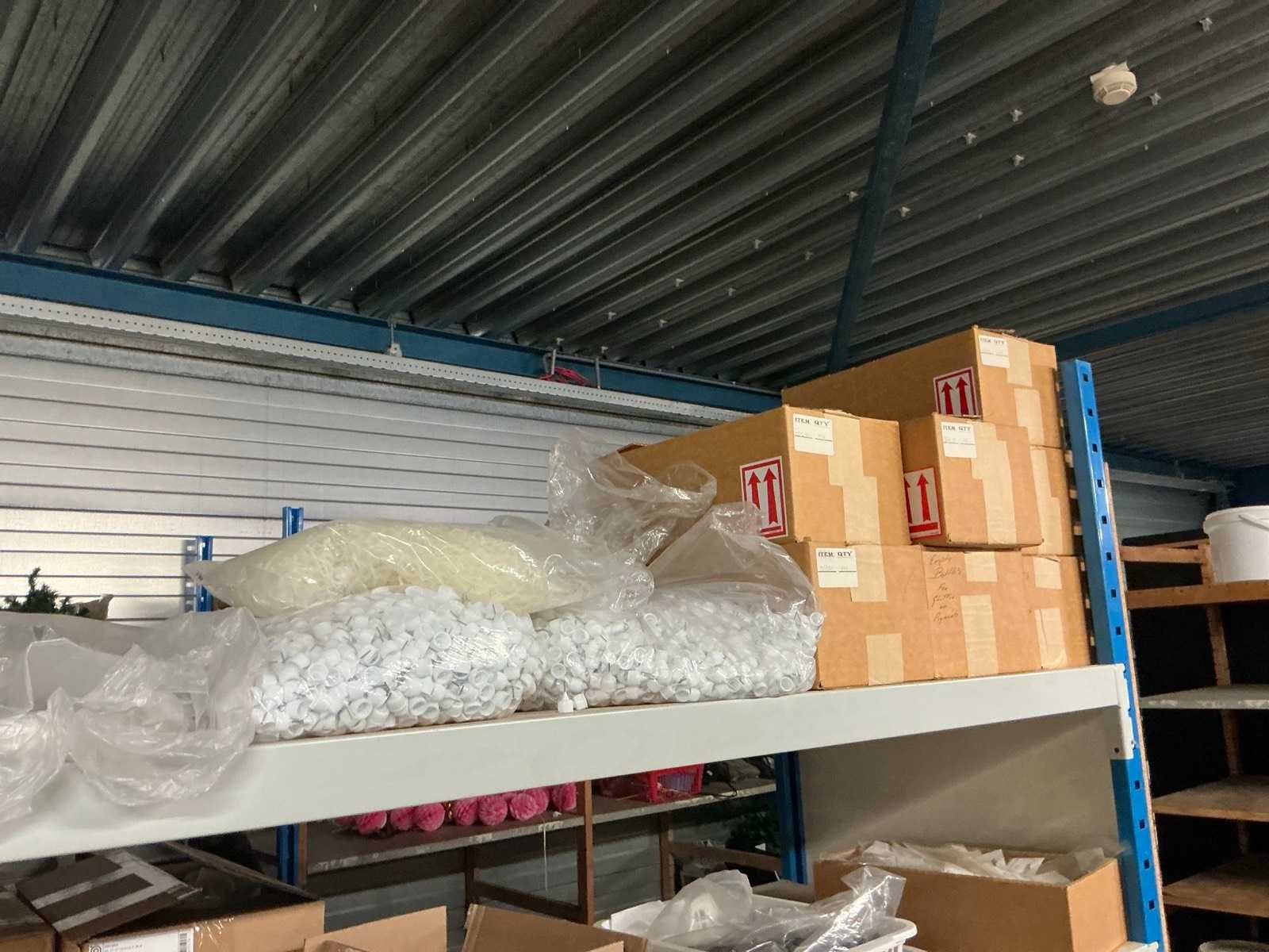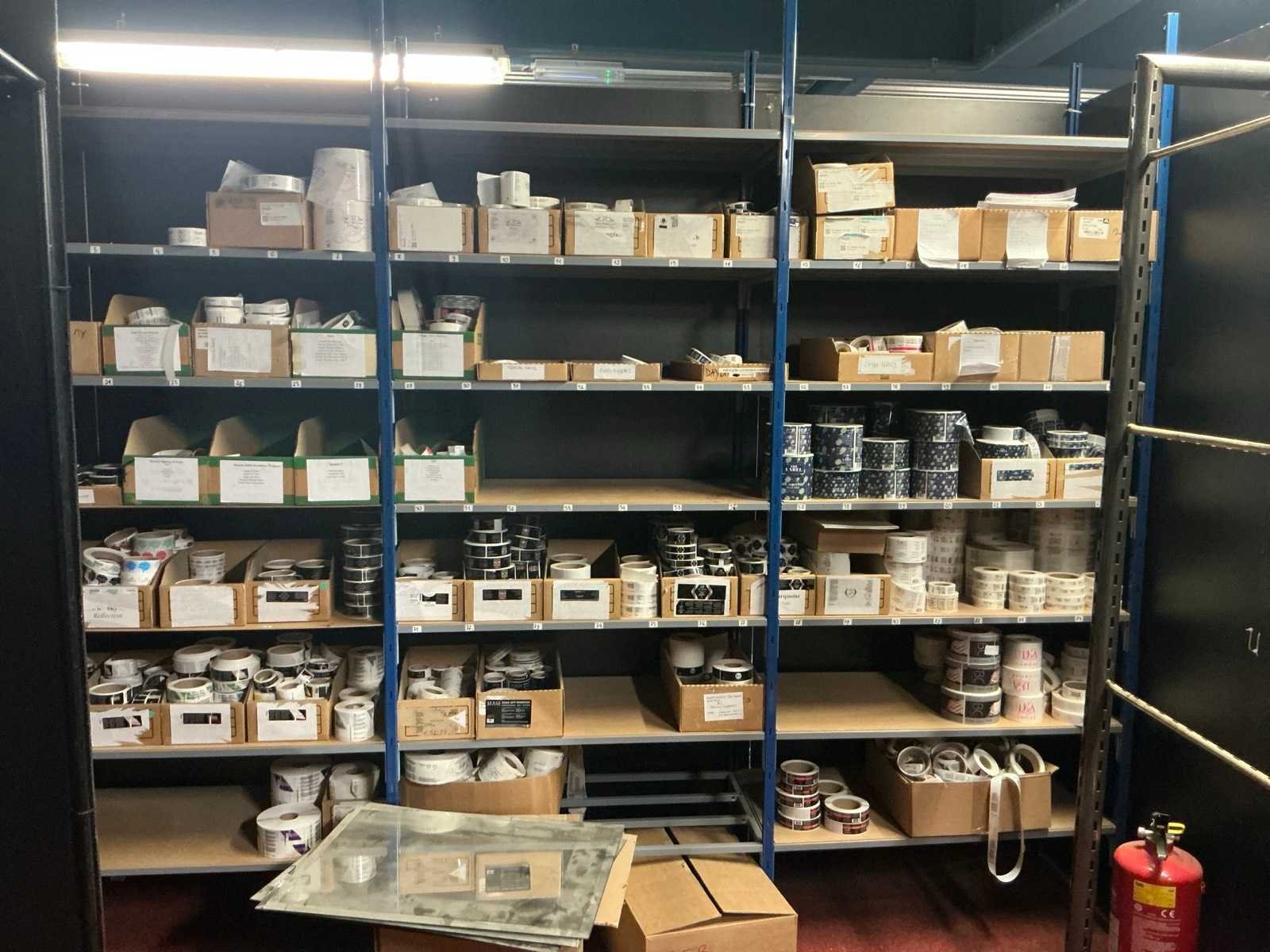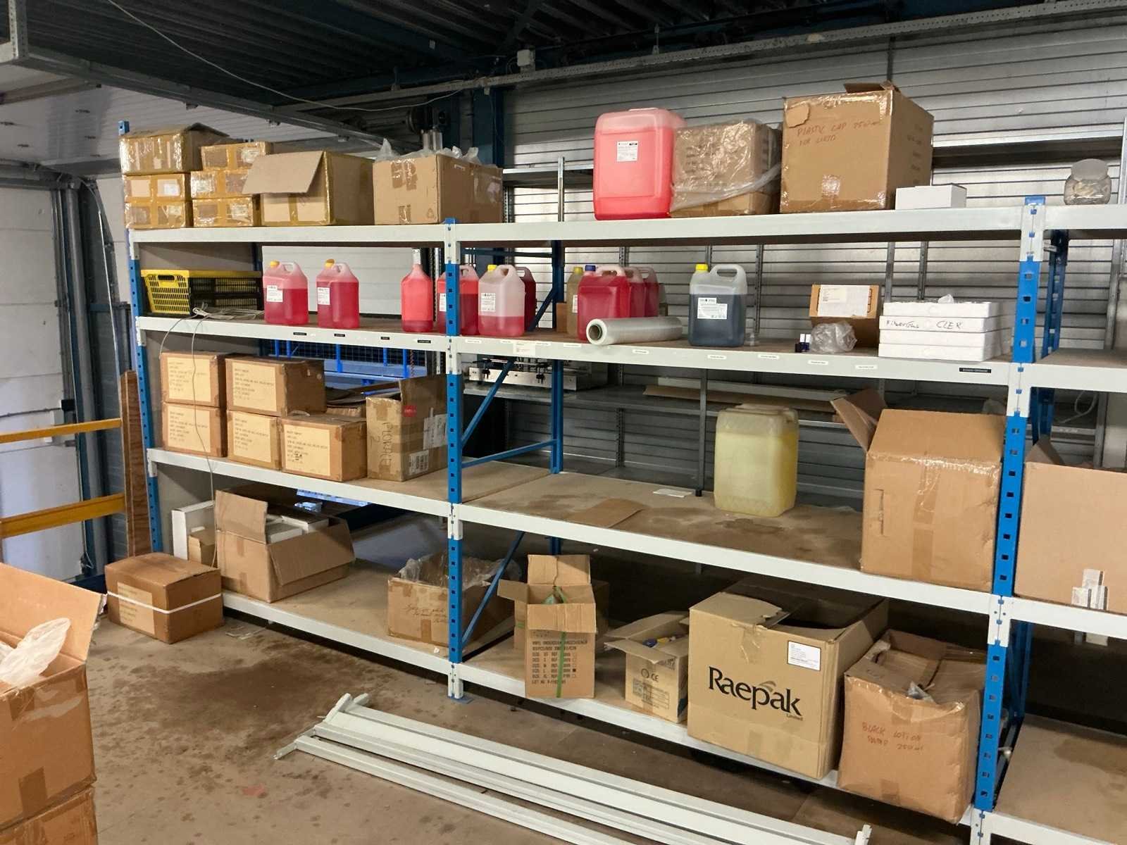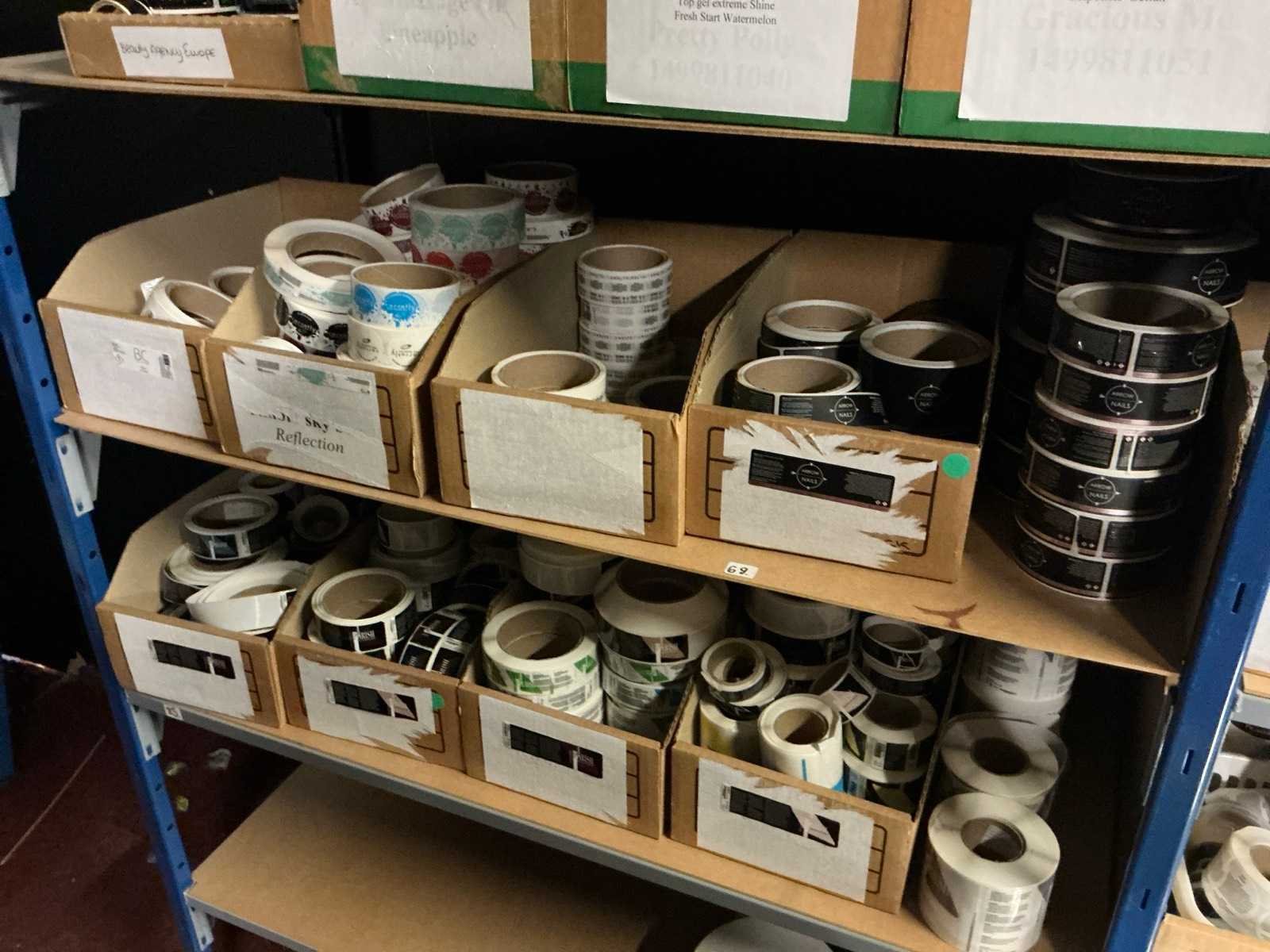 Dit kavel bevind zich op de eerste verdieping bereikbaar middels een vaste trap. Bestaande uit: Diverse kleurstoffen 1e: Flessen en potten 2e: Cosmetica verpakkingsmaterialen 3e: Potten met Acryl kleuren 4e: Rollen met product labels en stickers 5e: Decoratiematerialen