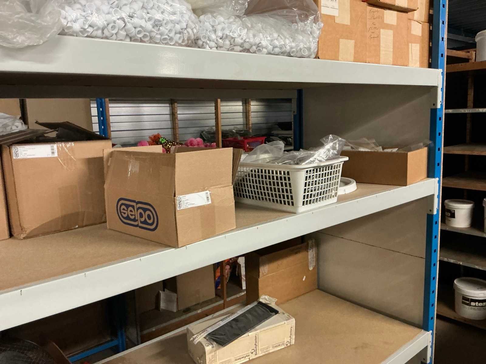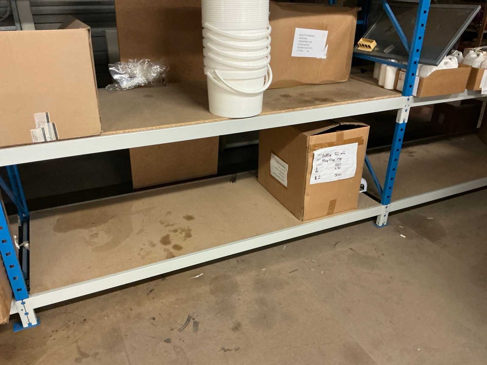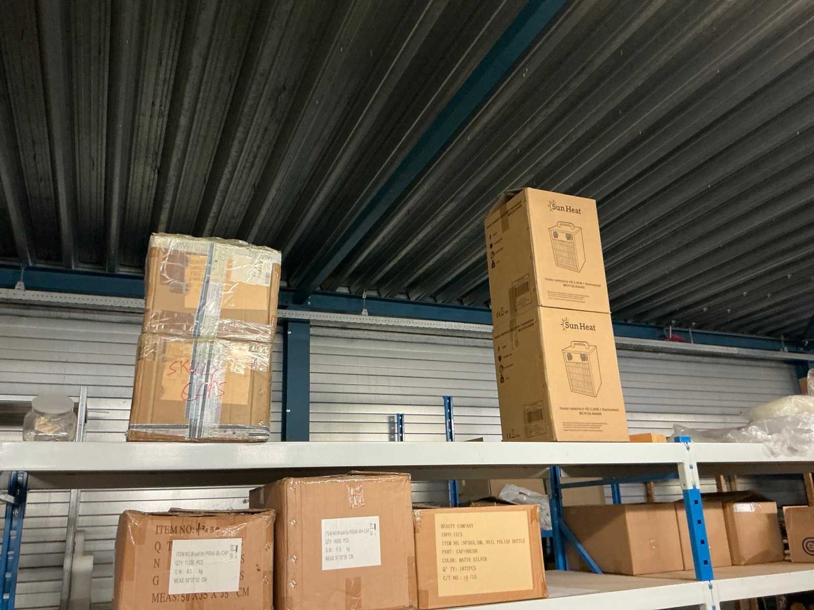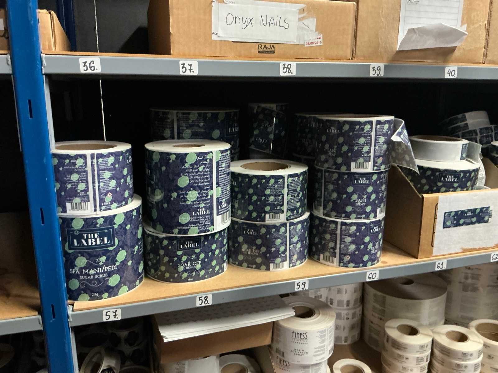 Dit kavel bevind zich op de eerste verdieping bereikbaar middels een vaste trap. Bestaande uit: Diverse kleurstoffen 1e: Flessen en potten 2e: Cosmetica verpakkingsmaterialen 3e: Potten met Acryl kleuren 4e: Rollen met product labels en stickers 5e: Decoratiematerialen