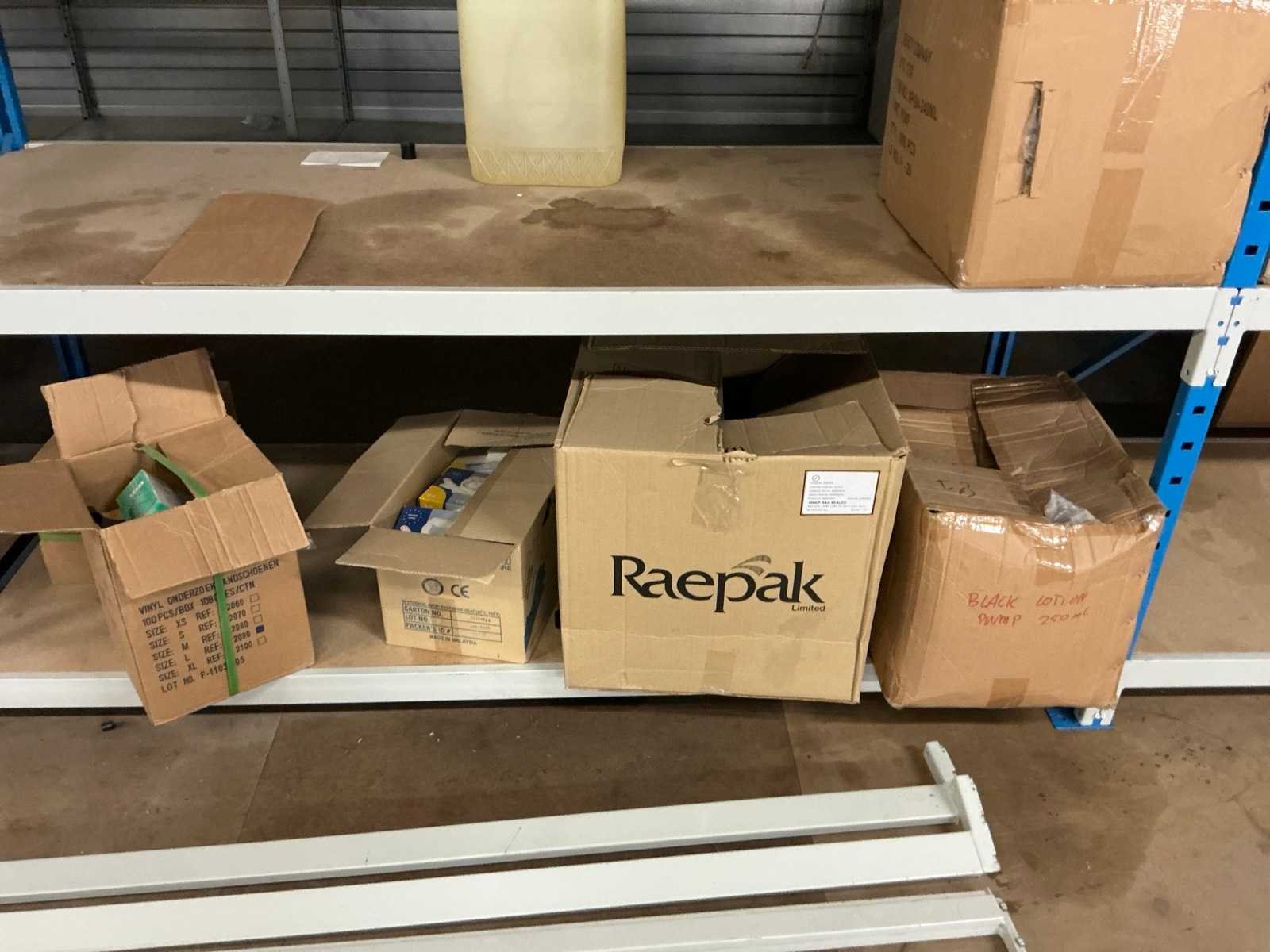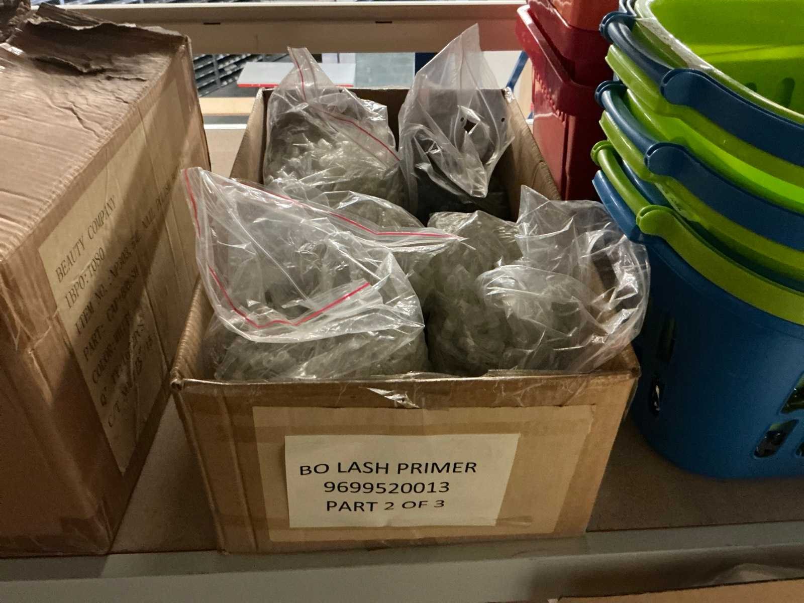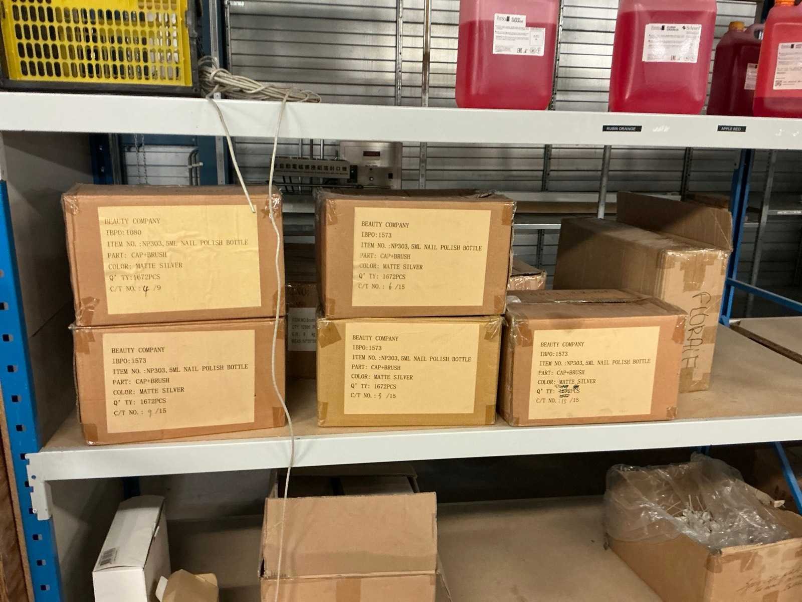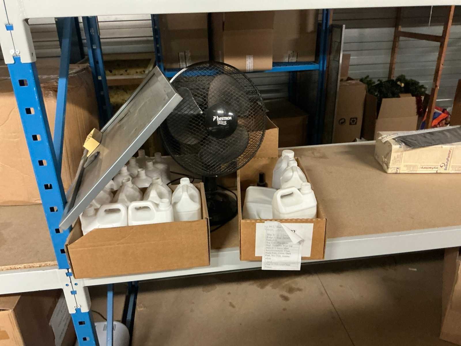 Dit kavel bevind zich op de eerste verdieping bereikbaar middels een vaste trap. Bestaande uit: Diverse kleurstoffen 1e: Flessen en potten 2e: Cosmetica verpakkingsmaterialen 3e: Potten met Acryl kleuren 4e: Rollen met product labels en stickers 5e: Decoratiematerialen