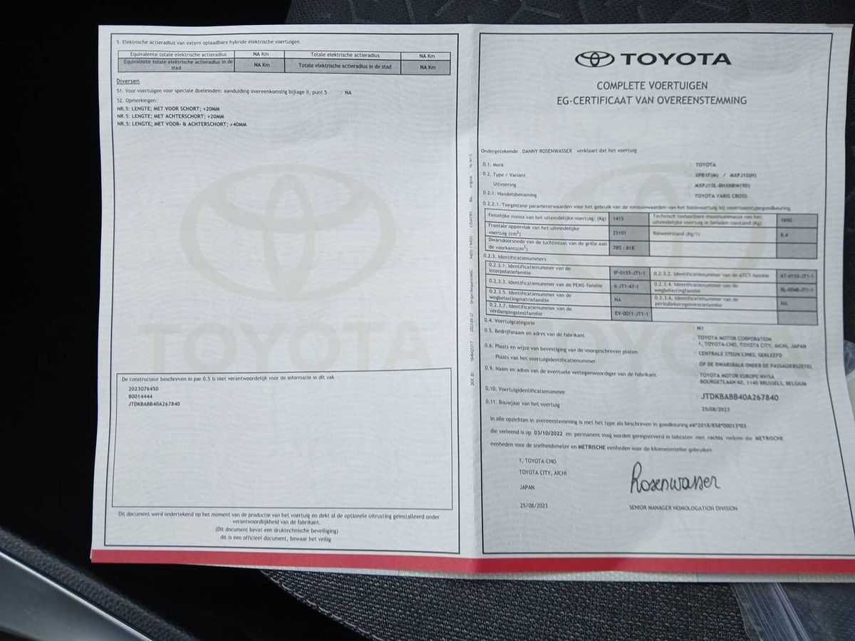 |CLIMA|ADAPT CRUISE|PARKEERSENSOREN+CAMERA|MULTIMEDIA Merk: Toyota Model: Yaris Cross Type: 1.5 Hybrid 2WD Business Edition Bouwjaar: 2023 Afgelezen kilometerstand: 87663km Cilinderinhoud: 1490cc Vermogen (kW): 85kW Brandstof: Hybride Benzine Chassisnummer: JTDKBABB40A267840 NAP status: Logisch Datum eerste toelating: 12-2023 APK vervaldatum: 12-2027 Vermogen (pk): 116hp Aandrijving: FWD Aantal zitplaatsen: 5 Kleur: Grijs Transmissie: Automaat Aantal deuren: 5 Aantal sleutels: 2 Aantal cilinders: 4 Carrosserie: SUV Nationaliteit documenten: België Onderhoudshistorie: Aanwezig danwel digitaal Start en rijdt: Start and drive startinformatie : Start en rijdt Self drive export possible : true Airconditioning: true Navigatie: false LED-koplampen: false