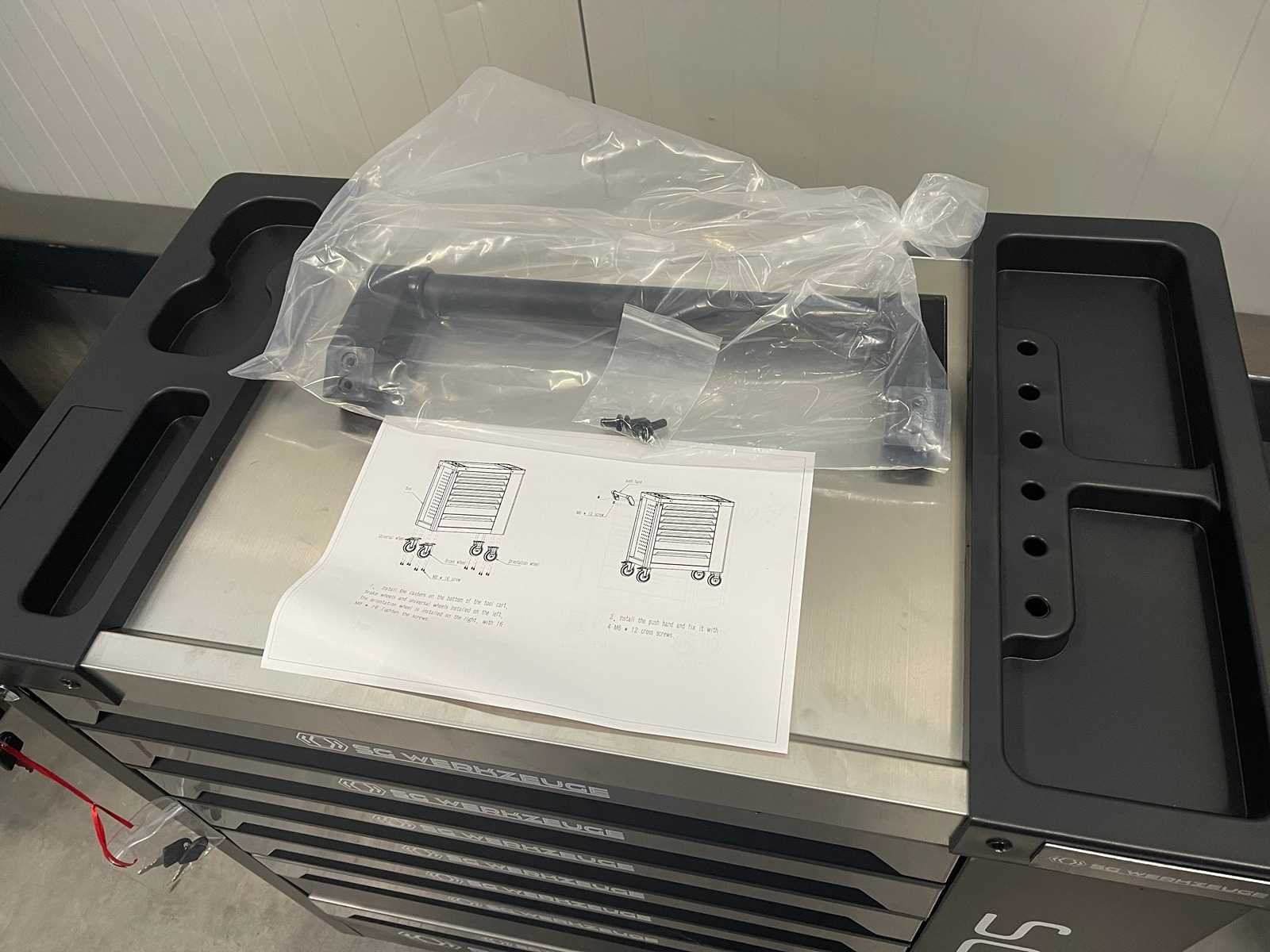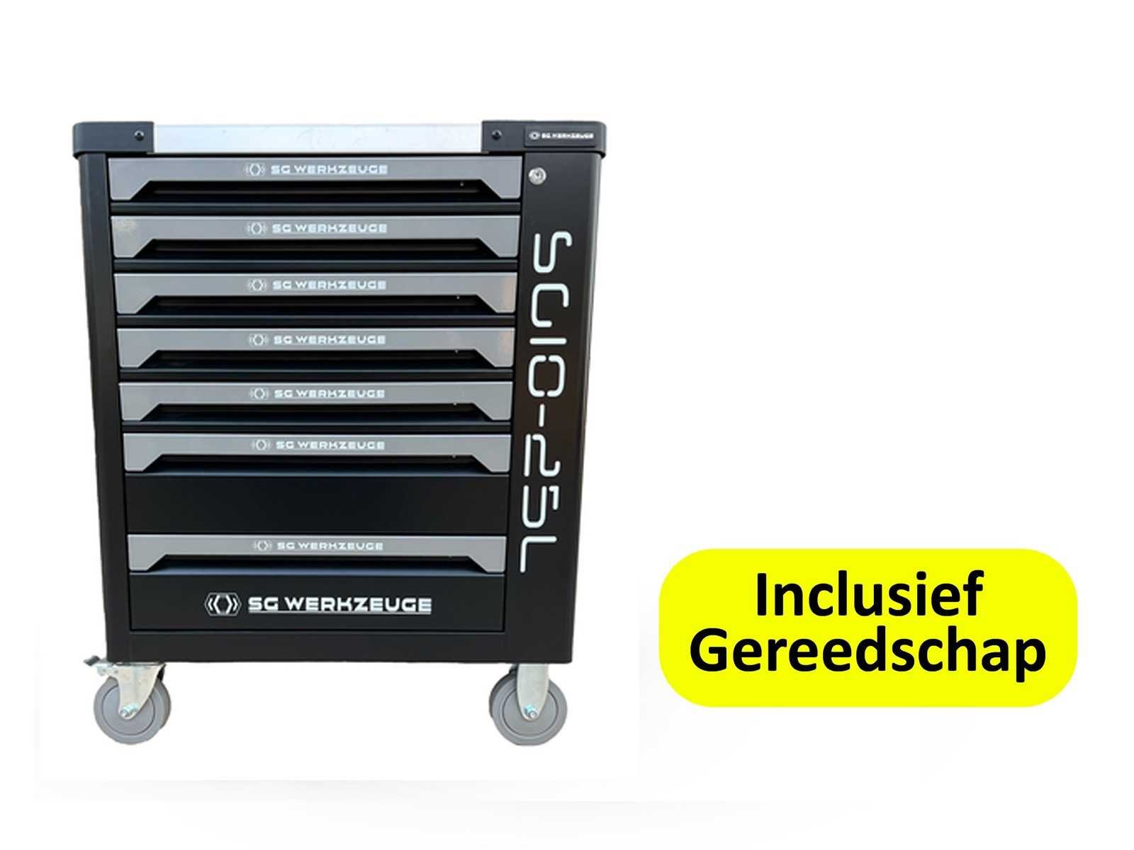 SG WERKZEUGE SG10-25L - Gereedschapswagen - <b>Inclusief gereedschap</b> 7 Laden - 7 Gevuld 258 stuks gereedschap Zwarte kar met zilveren grepen afgewerkt 2 zwenkwielen geremd Inclusief bezorging in heel Nederland en België, met uitzondering van de Waddeneilanden. Bezorgtermijn 7 dagen Merk: SG Werkzeuge Type: SG10-25 Aantal laden: 7 Met inhoud: true