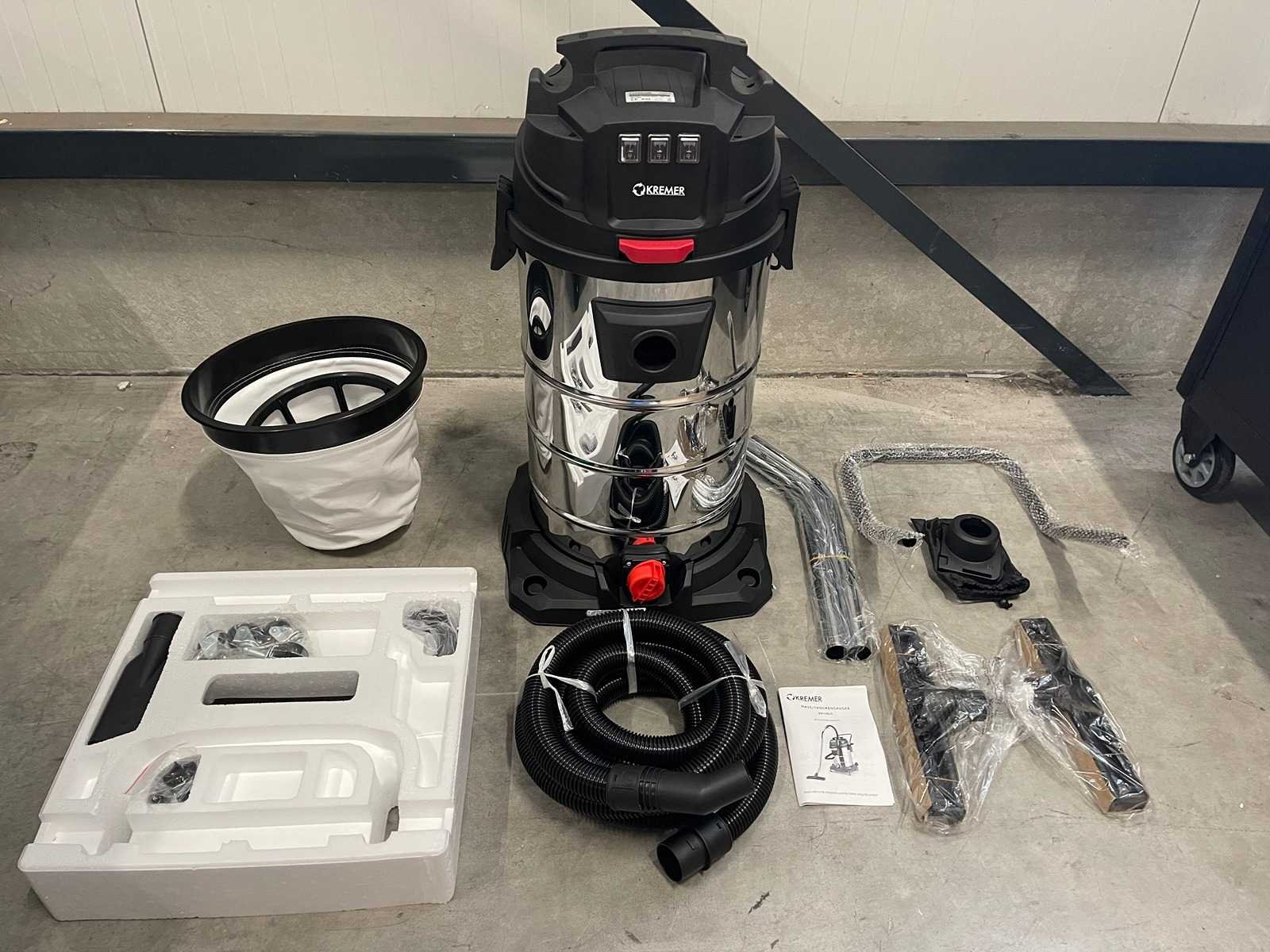 Industriële nat/droog stofzuiger Merk: Kremer Inhoud: 100 liter Behuizing: RVS (Roestvrij staal) Aantal motoren: 3 motoren Vermogen: 3 x 1000 watt Aansluiting: 230 volt Eigenschappen: Zakloos Filter: Uitneembare filter met klopfunctie Stroomkabel: 4,5 meter stroomkabel Staat: Ongebruikt, in de originele verpakking Bezorgtermijn 7 dagen Merk: Kremer Type: KR100LS Zakloos: true Nat/droog zuiger: true
