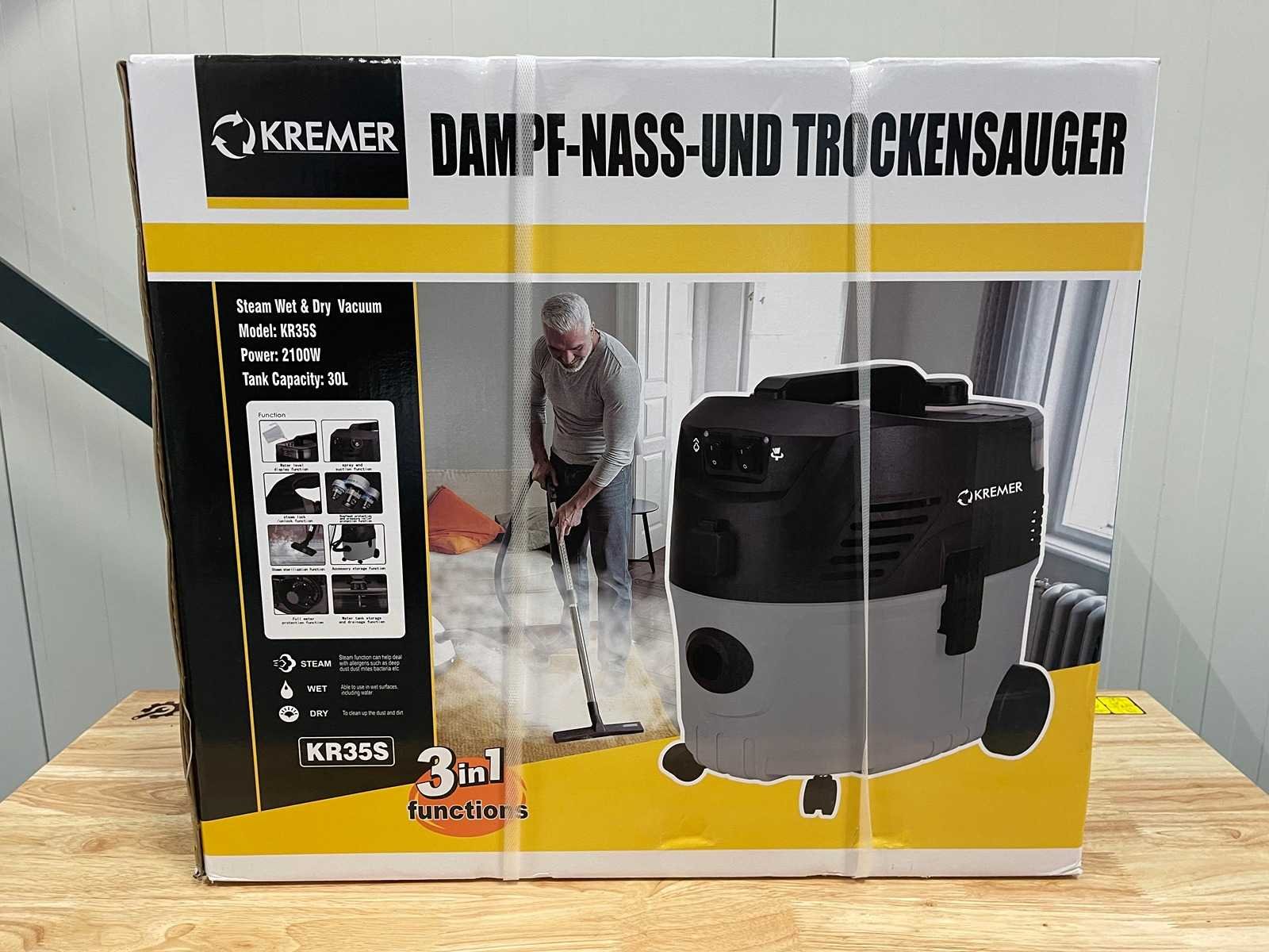 Nat & droog stofzuiger & stoomreiniger Vermogen: 2100 watt Stoomdruk: 2 bar Temperatuur: 100 °C Tankinhoud: 30 liter tank Aansluiting: 230 volt Bezorgtermijn 7 dagen Merk: Kremer Type: KR35S