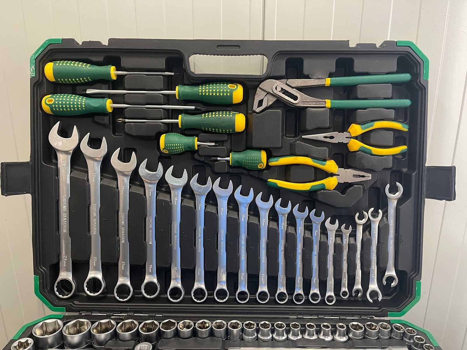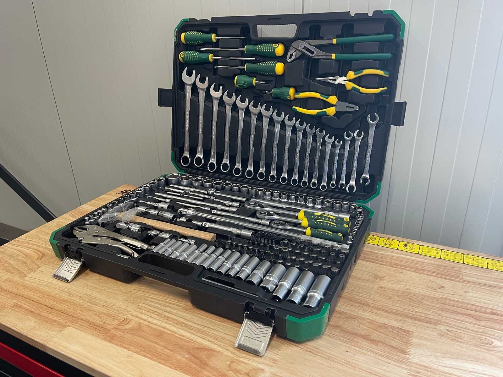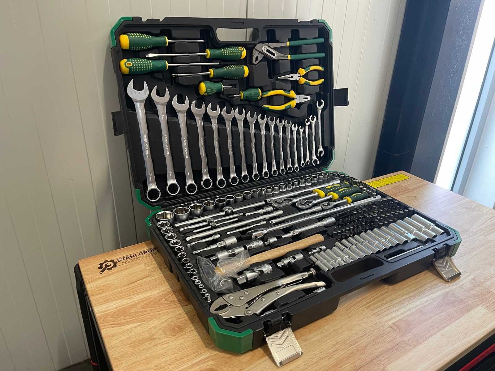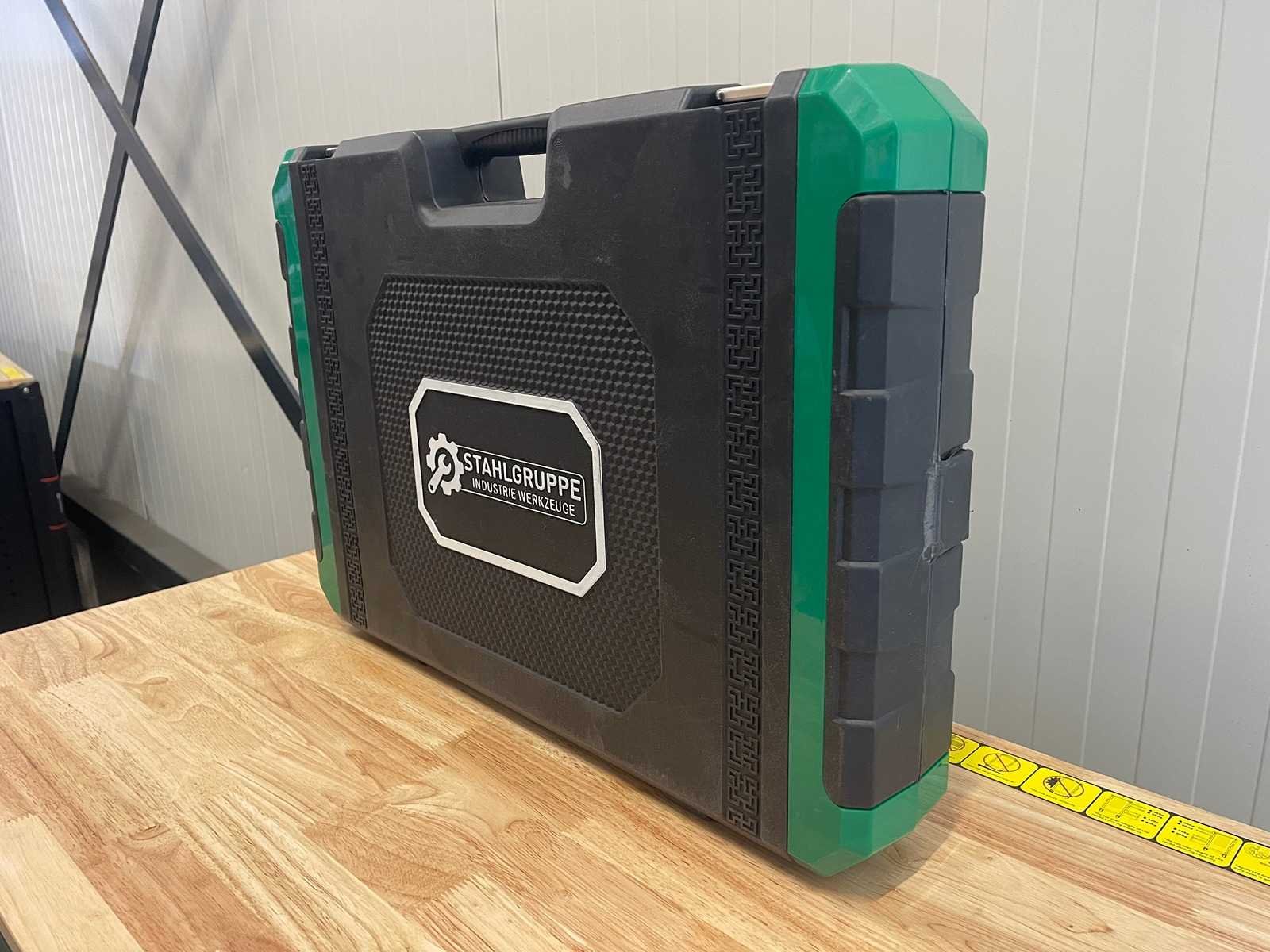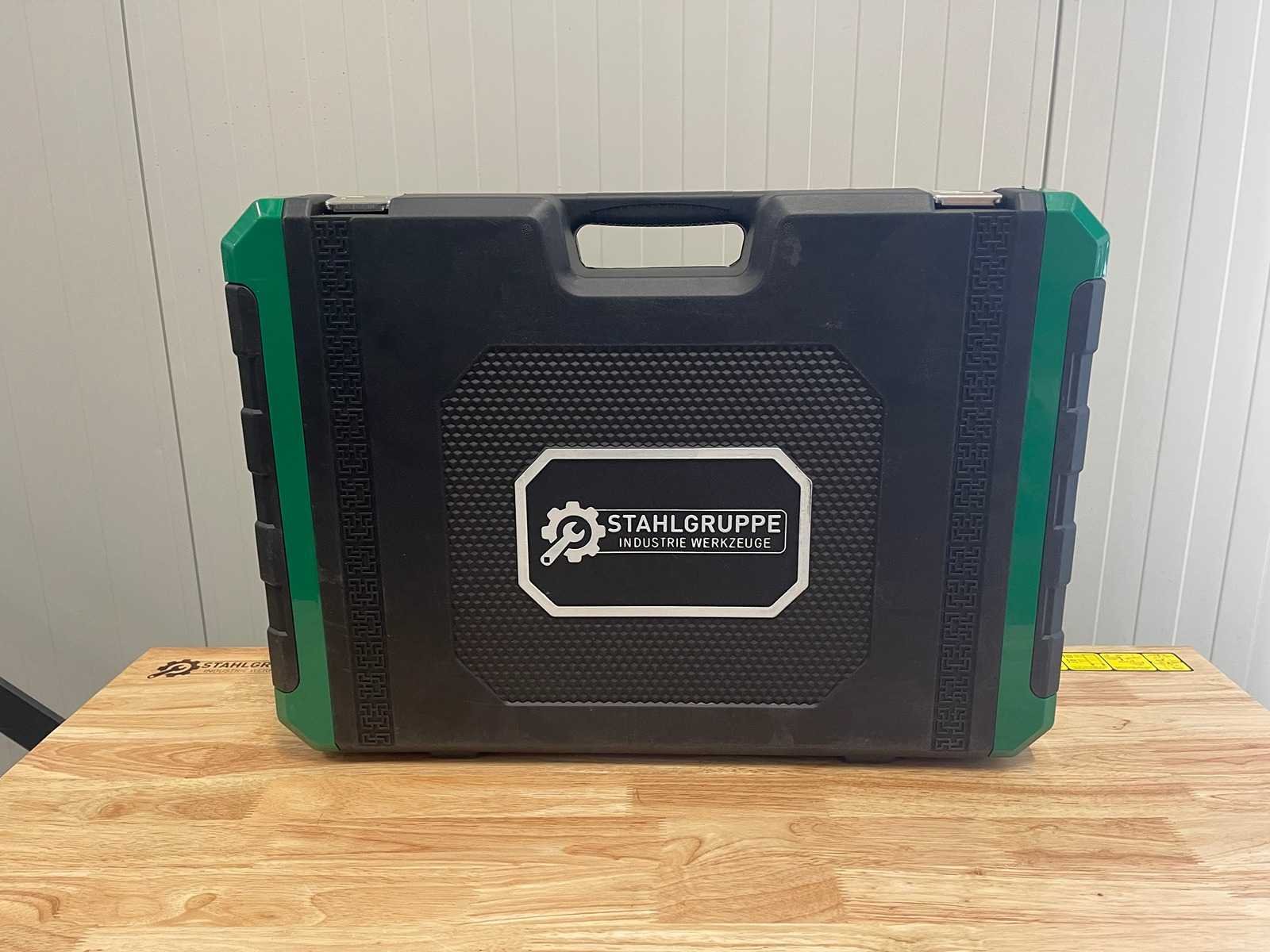 Inhoud 180-delige gereedschapsset: • 9 stuks 1/4" Dr. Dopsleutels: 4-4,5-5-5,5-6-7-8-9-10 mm • 6 stuks 3/8" Dr. Dopsleutels: 10-11-12-13-14-15 mm • 17 stuks 1/2" Dr. Dopsleutels: 8-9-10-11-12-13-14-15-16-17-18-19-22-24-27-30-32 mm • 5 stuks 1/4" Dr. Diepe dopsleutels: 6-8-10-12-13 mm • 7 stuks 3/8" Dr. Diepe dopsleutels: 8-9-10-11-12-13-14 mm • 3 stuks 1/2" Dr. Diepe dopsleutels: 17-19-22 mm • 5 stuks 1/4" Dr. E-Socket: E4-E5-E6-E7-E8 • 4 stuks 3/8" Dr. E-Socket: E10-E11-E12-E14 • 5 stuks 1/2" Dr. E-Socket: E16-E18-E20-E22-E24 • 3 stuks 72T Ratel dopsleutel: 1/2" & 3/8" & 1/4" Dr • 1 stuk 1/4" Dr. Schuifbalk: 110 mm • 1 stuk 3/8" Dr. Schuifbalk: 160 mm • 1 stuk 1/2" Dr. Schuifbalk: 250 mm • 3 stuks Universele koppeling: 1/4"-3/8"-1/2" • 1 stuk Flexibele verlengstang: 1/4" • 3 stuks 1/4" Dr. Verlengstang: 50-75-100 mm • 3 stuks 3/8" Dr. Verlengstang: 75-150-250 mm • 2 stuks 1/2" Dr. Verlengstang: 125-250 mm • 2 stuks 1/2" Dr. Bougiesleutel: 16-21 mm • 1 stuk 1/2" Dr. F-handvat: 430 mm • 1 stuk 3-weg adapter: 3/8"(F)*1/2"(M) Bezorgtermijn 7 dagen Merk: Stahlgruppe Met koffer: true Delig: 180