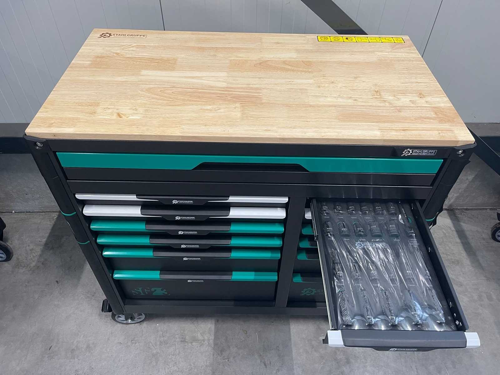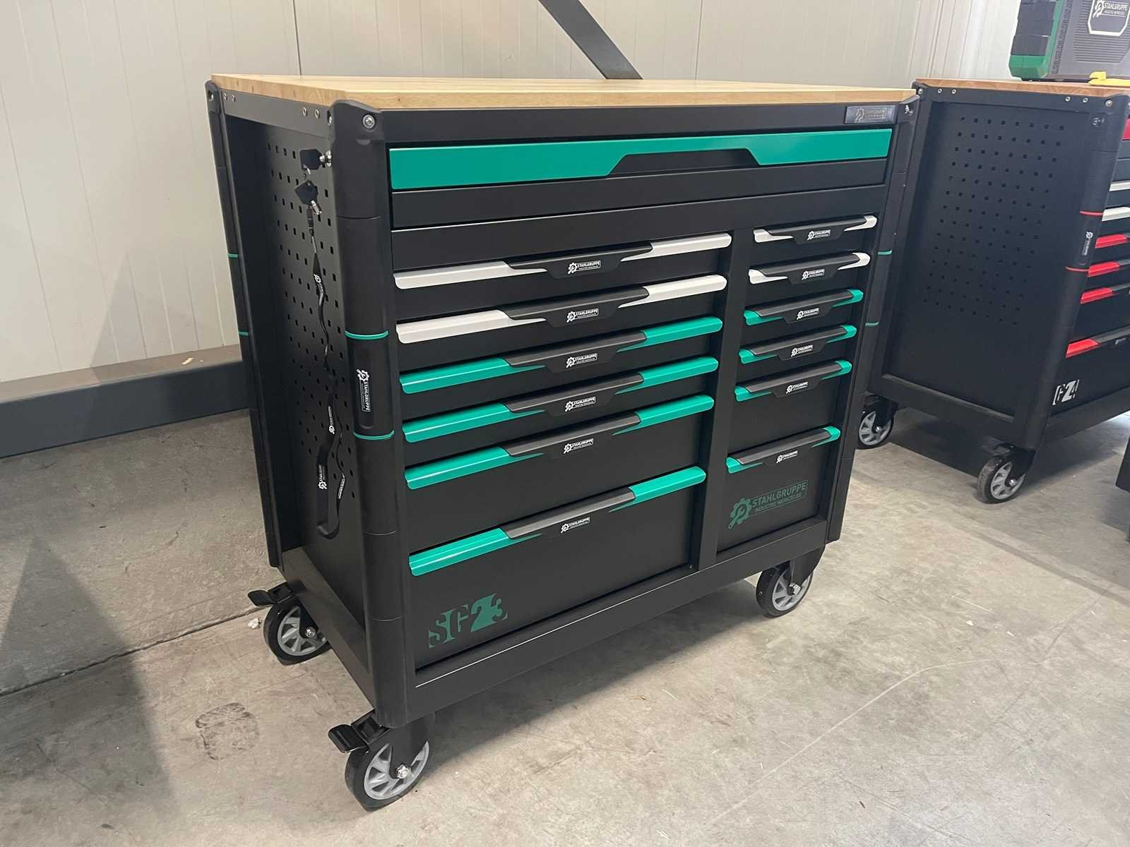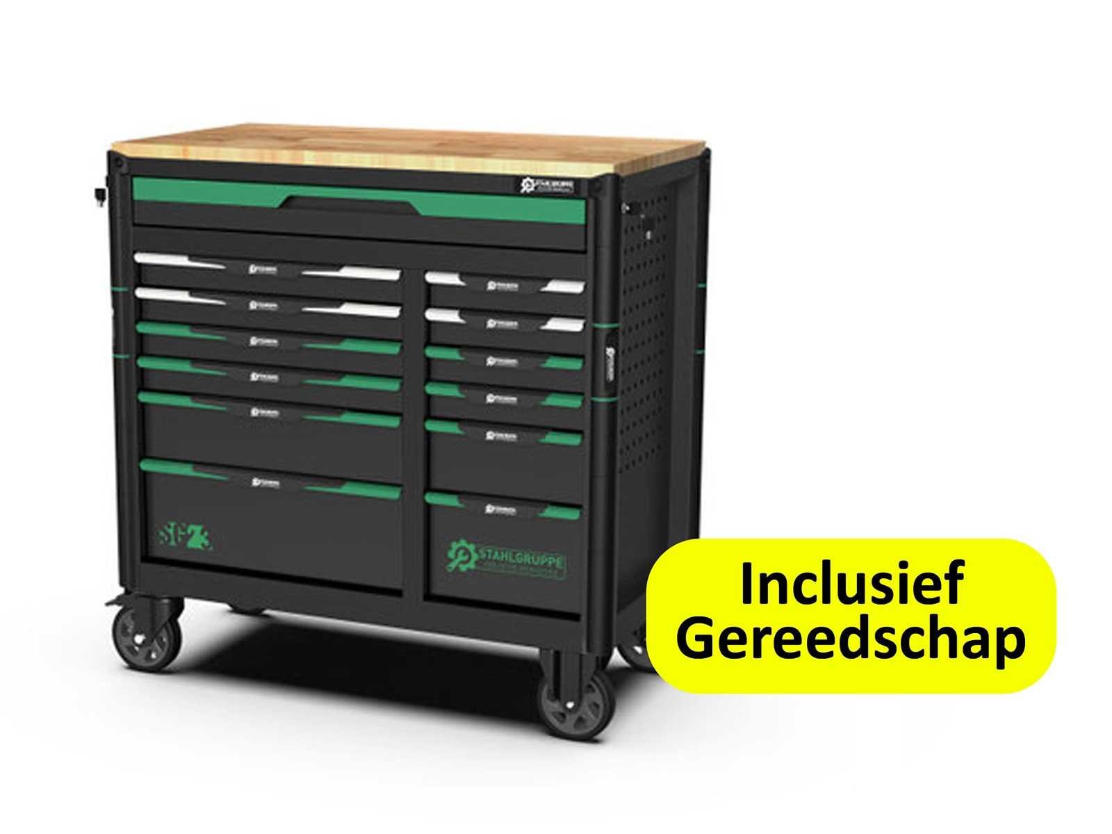 Stahlgruppe SG23 - Gereedschapswagen - <b>Inclusief gereedschap<b> 13 Laden - 11 Gevuld 448 pcs Gereedschap Lade grepen groen gespoten met kunststof greep 2 zwenkwielen geremd Mat zwart milieu vriendelijke poeder coating Inclusief bezorging in heel Nederland en Belgie, behalve de waddeneilanden</b></b> Bezorgtermijn 7 dagen Merk: Stahlgruppe Type: SG23 Aantal laden: 13 Met inhoud: true