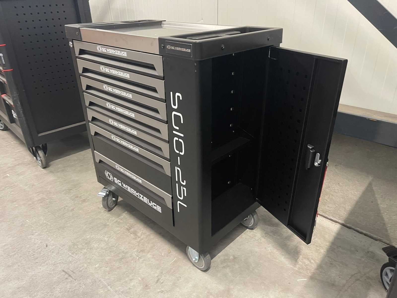 SG WERKZEUGE SG10-25L - Gereedschapswagen - <b>Inclusief gereedschap</b> 7 Laden - 7 Gevuld 258 stuks gereedschap Zwarte kar met zilveren grepen afgewerkt 2 zwenkwielen geremd Inclusief bezorging in heel Nederland en Belgie, behalve de waddeneilanden Bezorgtermijn 7 dagen Merk: SG Werkzeuge Type: SG10-25 Aantal laden: 7 Met inhoud: true