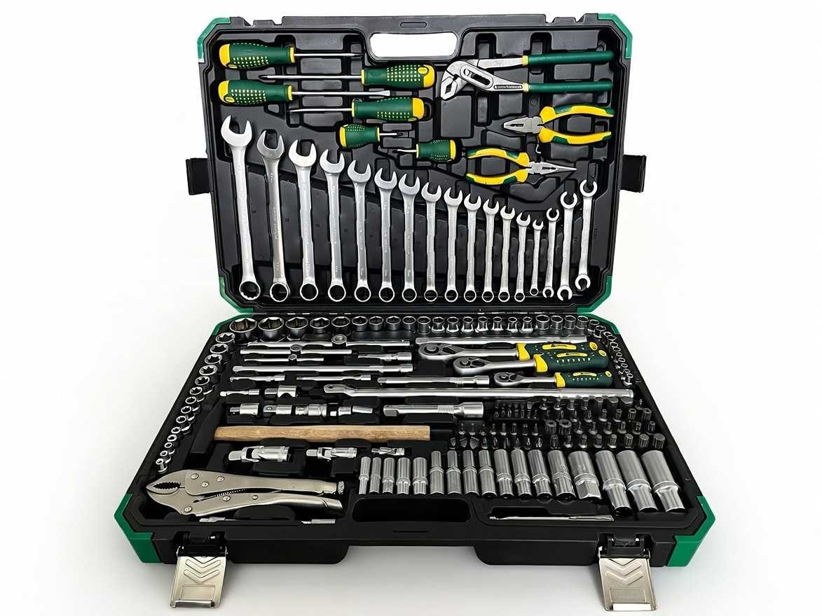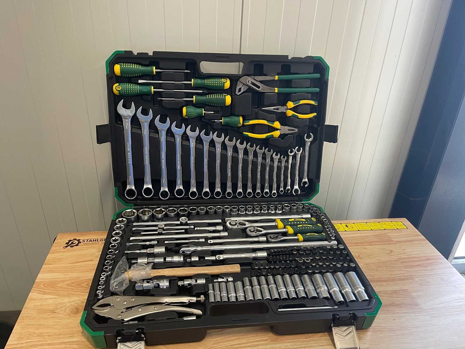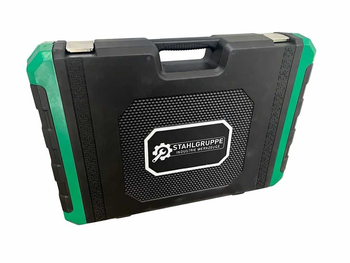 Inhoud 180-delige gereedschapsset: • 9 stuks 1/4" Dr. Dopsleutels: 4-4,5-5-5,5-6-7-8-9-10 mm • 6 stuks 3/8" Dr. Dopsleutels: 10-11-12-13-14-15 mm • 17 stuks 1/2" Dr. Dopsleutels: 8-9-10-11-12-13-14-15-16-17-18-19-22-24-27-30-32 mm • 5 stuks 1/4" Dr. Diepe dopsleutels: 6-8-10-12-13 mm • 7 stuks 3/8" Dr. Diepe dopsleutels: 8-9-10-11-12-13-14 mm • 3 stuks 1/2" Dr. Diepe dopsleutels: 17-19-22 mm • 5 stuks 1/4" Dr. E-Socket: E4-E5-E6-E7-E8 • 4 stuks 3/8" Dr. E-Socket: E10-E11-E12-E14 • 5 stuks 1/2" Dr. E-Socket: E16-E18-E20-E22-E24 • 3 stuks 72T Ratel dopsleutel: 1/2" & 3/8" & 1/4" Dr • 1 stuk 1/4" Dr. Schuifbalk: 110 mm • 1 stuk 3/8" Dr. Schuifbalk: 160 mm • 1 stuk 1/2" Dr. Schuifbalk: 250 mm • 3 stuks Universele koppeling: 1/4"-3/8"-1/2" • 1 stuk Flexibele verlengstang: 1/4" • 3 stuks 1/4" Dr. Verlengstang: 50-75-100 mm • 3 stuks 3/8" Dr. Verlengstang: 75-150-250 mm • 2 stuks 1/2" Dr. Verlengstang: 125-250 mm • 2 stuks 1/2" Dr. Bougiesleutel: 16-21 mm • 1 stuk 1/2" Dr. F-handvat: 430 mm • 1 stuk 3-weg adapter: 3/8"(F)*1/2"(M) Bezorgtermijn 7 dagen Merk: Stahlgruppe Met koffer: true Delig: 180