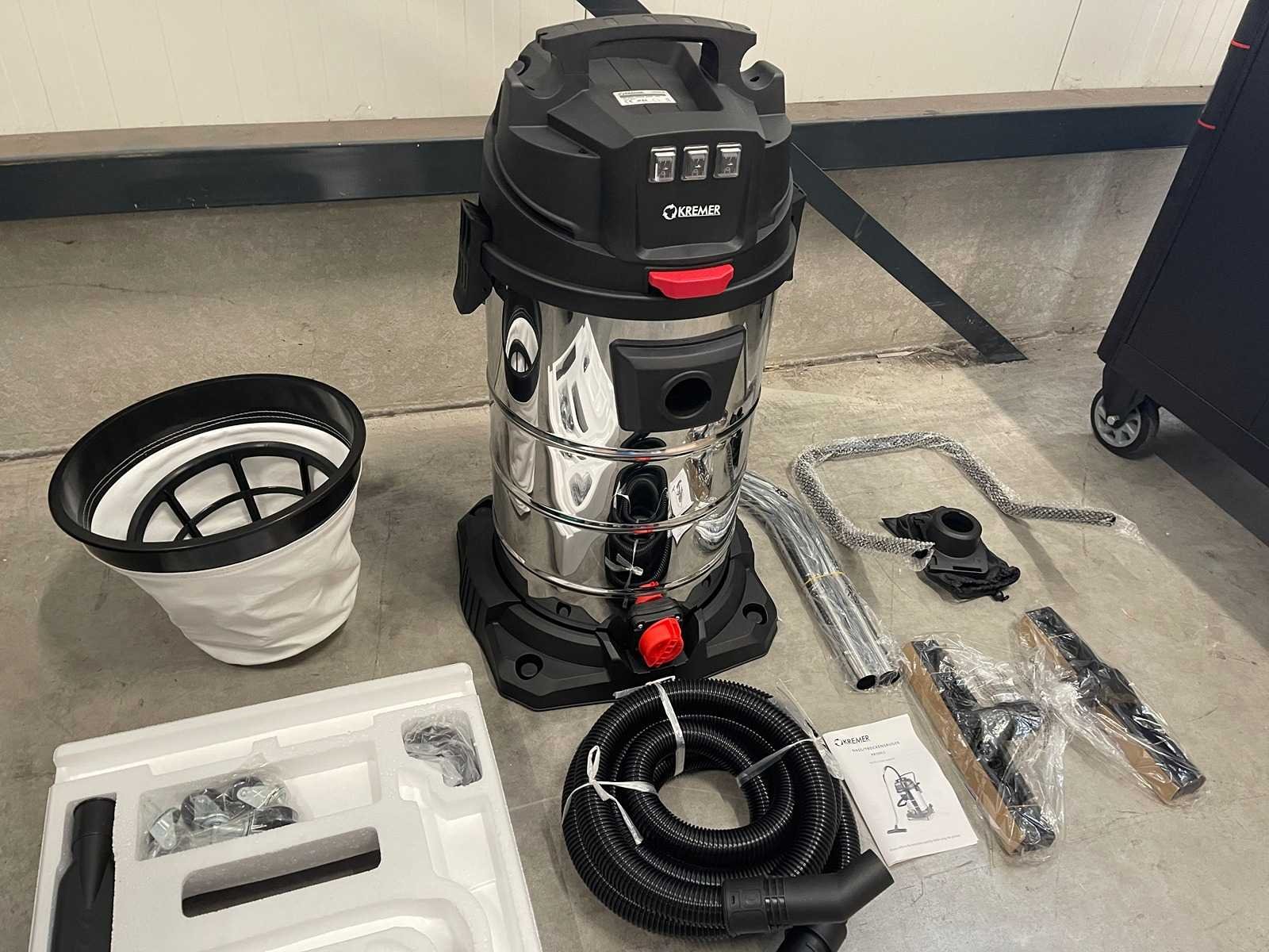 Industriële nat/droog stofzuiger Merk: Kremer Inhoud: 100 liter Behuizing: RVS (Roestvrij staal) Aantal motoren: 3 motoren Vermogen: 3 x 1000 watt Aansluiting: 230 volt Eigenschappen: Zakloos Filter: Uitneembare filter met klopfunctie Stroomkabel: 4,5 meter stroomkabel Staat: Ongebruikt, in de originele verpakking Bezorgtermijn 7 dagen Merk: Kremer Type: KR100LS Zakloos: true Nat/droog zuiger: true