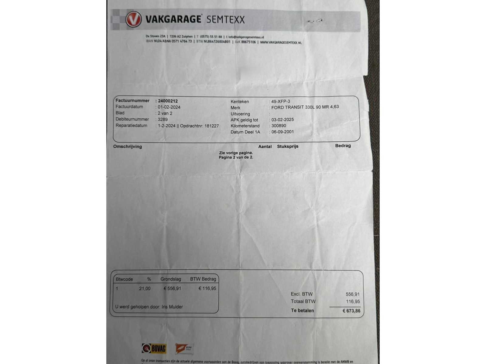 Omdat dit kavel niet in Spijkenisse staat moet u ons een mail sturen dan krijgt u van ons het adres. Vermeld wel het veilingnummer en kavel nummer zodat het voor ons makkelijker zoeken is. INFO@COLLECTCARS.NL Kenteken: 49-XFP-3 Merk: ford Model: TRANSIT Kampeerwagen 330L 90 MR 4,63 Type: Camper 49-XFP-3 Bouwjaar: 2001 Afgelezen kilometerstand: 309621km Cilinderinhoud: 2402cc Vermogen (kW): 66kW Brandstof: diesel Chassisnummer: WF0LXXGBFL1R22102 NAP status: Logical Datum eerste toelating: 2001-09-06 APK vervaldatum: 2026-03-26 Vermogen (pk): 89hp Aantal zitplaatsen: 3 Maximaal trekgewicht ongeremd: 2250kg Maximaal trekgewicht geremd: 750kg Kleur: rood Emissieklasse: 3 Aantal deuren: 4 Ledig gewicht: 2190kg Bruto BPM (NL): 7868€ Aantal cilinders: 4 Carrosserie: Kampeerwagen Carfax Link: https://was.carfax.eu/v0/api/ccdid/5100016408/svc/201/vinreg/49XFP3/checksum/eyJhbGciOiJIUzI1NiIsInR5cCI6IkpXVCJ9.eyJleHAiOjE3ODEzNjU0NzF9.gmm1IWKqa3rzDJIyabFUpHeNm8_FU8sk1l5oc6wFLb0 startinformatie : Start en rijdt