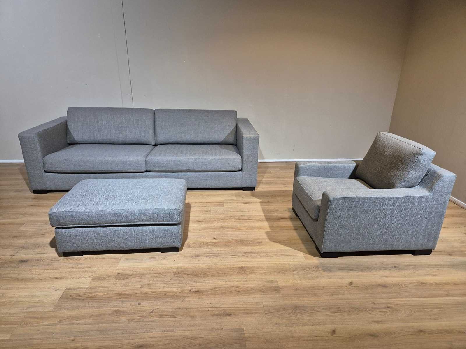 Afmetingen fauteuil: 85x90x80cm Afmetingen hocker: 95x60x43cm Jong gebruikt Merk: Bielefelder Werkstatte Model: Inspiration Product type: 3 zits Bank + Fauteuil + Hocker Kleur: Grijs Gewicht: 60kg Lengte: 245cm Breedte: 105cm Hoogte: 80cm Zithoogte: 44cm Diepte: 62cm Materiaal: Stof