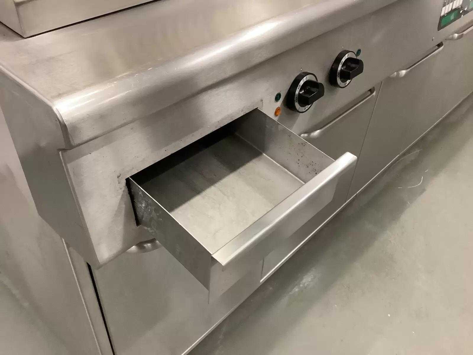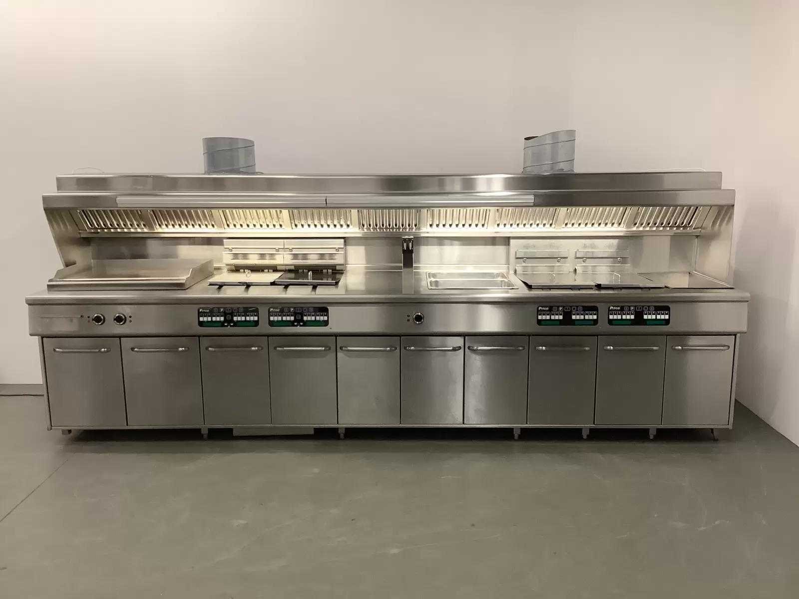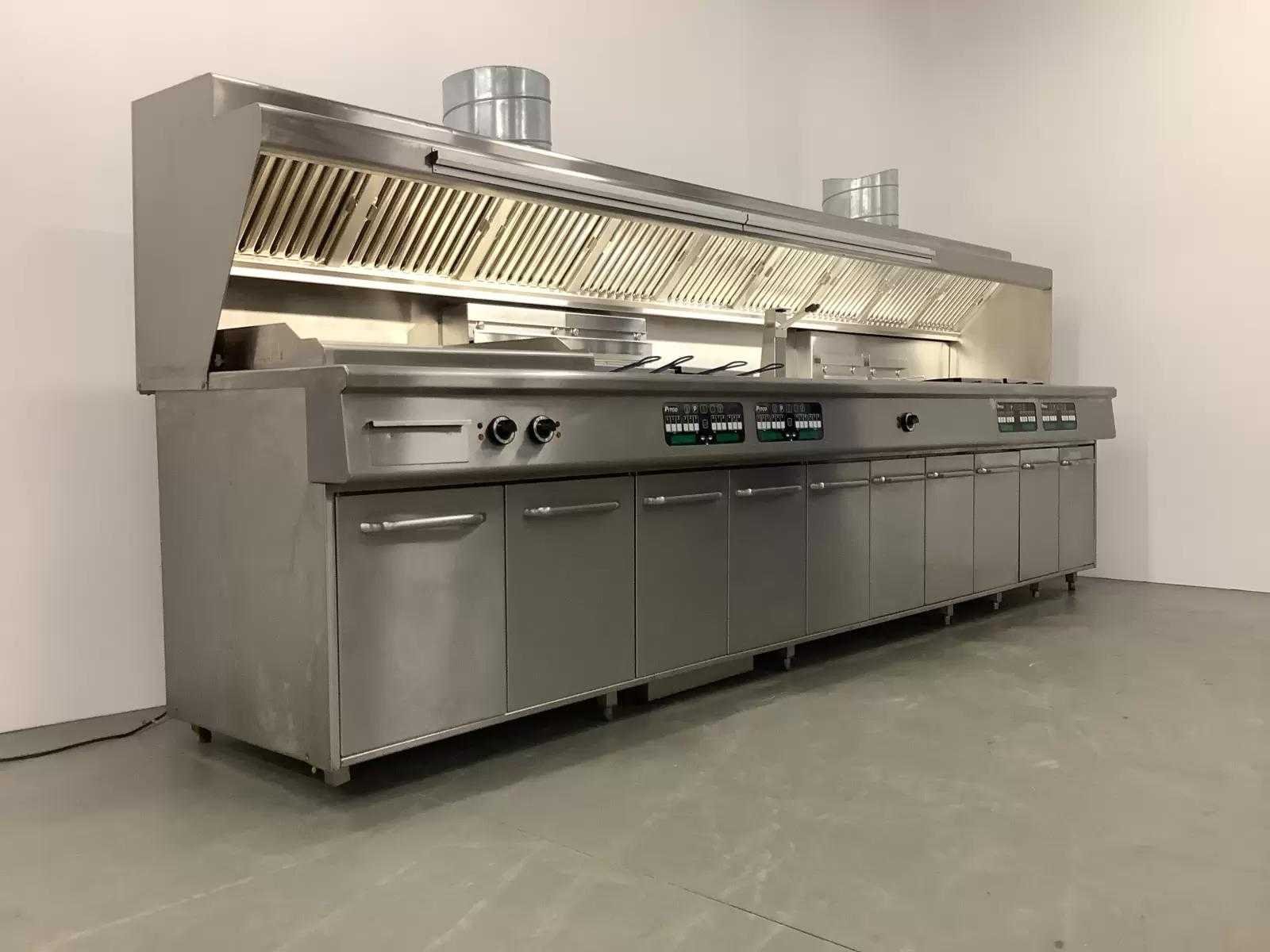 Voorzien van: 2x Pitco SELV14 Friteuse, 2x Pitco SE14S Friteuse, 1x Bakplaat (Bak oppervlakte LxB: 80x50 cm) aansluitwaarde 400V, 1x Bain Marie (Capaciteit 2x 1/1 GN), Elektrische dubbele Sausdispenser, Uitschepbak, Afzuiging (Zonder motor) en verlichting. Extra informatie: Bakcapaciteit 60 kg per uur per pan. Olie capaciteit 18-23 kg per pan. Elektronisch thermostaat, instelbaar van 120 tot 190 graden. Merk: Pitco Model: SELV14 / SE14S Type: SELV14 / SE14S Lengte: 405cm Breedte: 90cm Hoogte: 160cm Vermogen (kW): 81 Spanning: 400