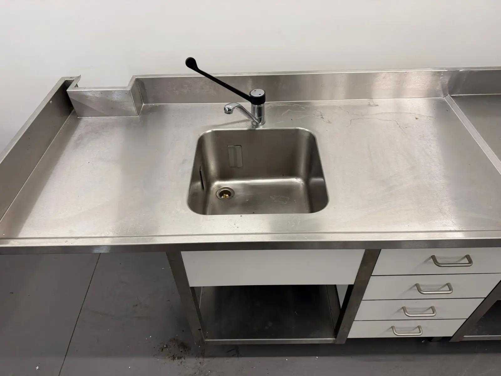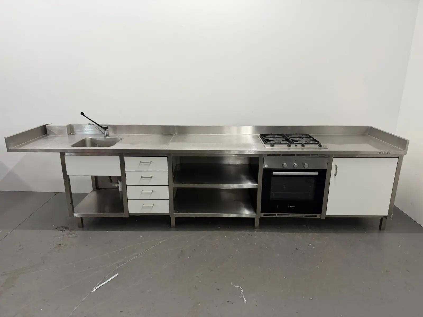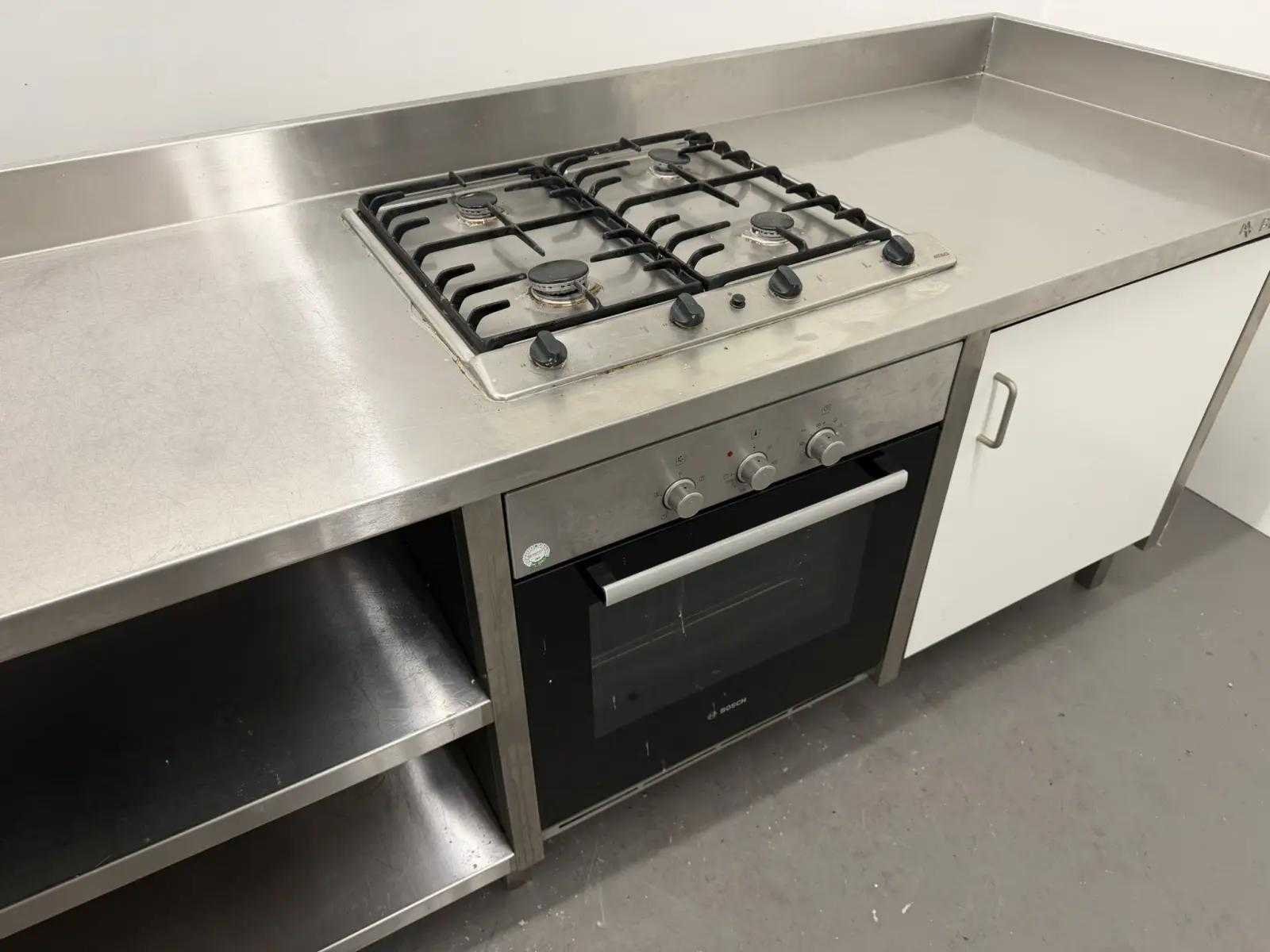 Voorzien van oven, spoelbak met kraan en 4 pits gasfornuis. Totale afmeting L: 3670mm Totale afmeting Breedte: 700mm Totale afmeting Hoogte: 900mm
