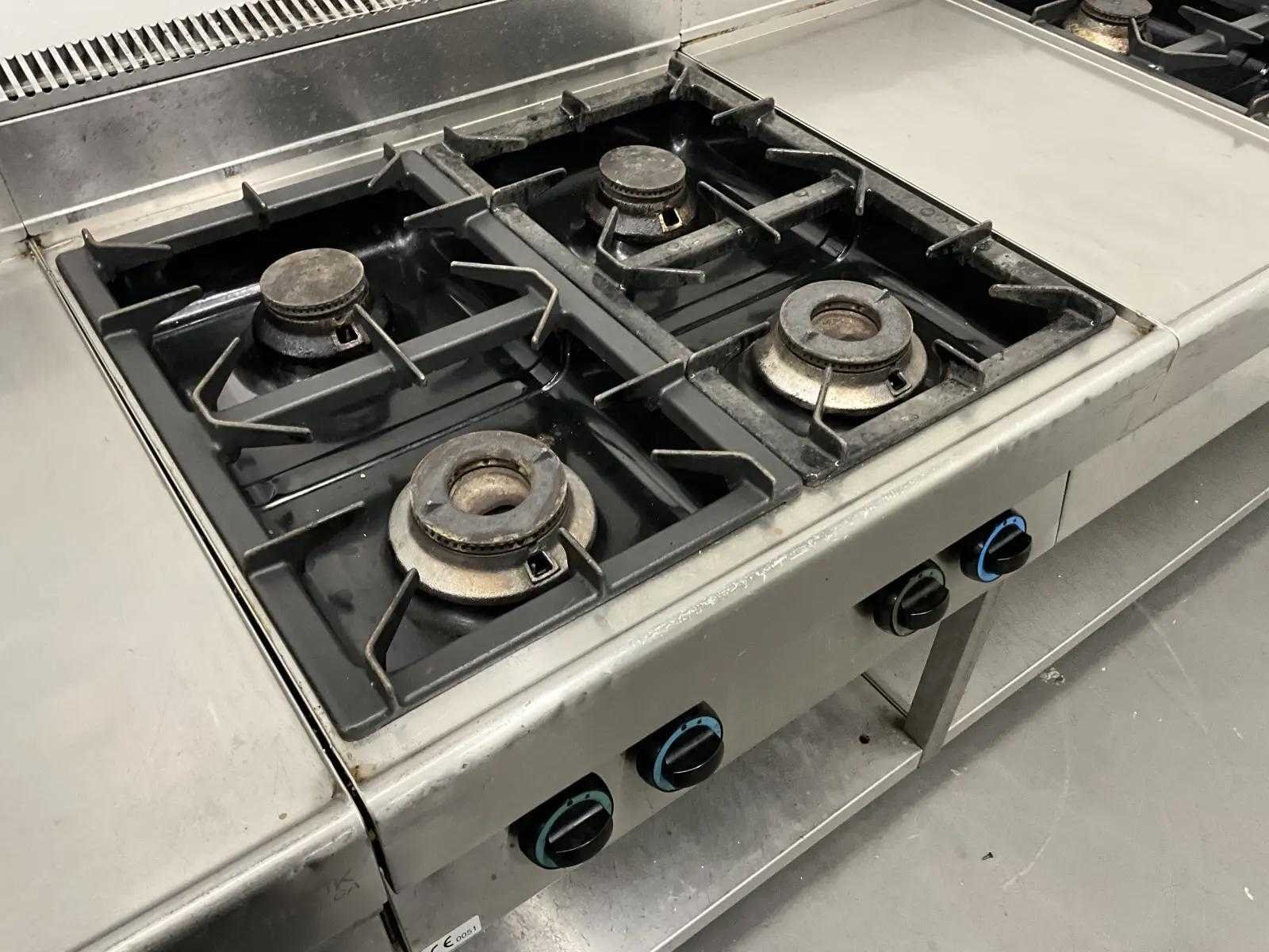 V.v. 3x 4-pits gasfornuis. Merk: Modular Lengte: 330cm Breedte: 70cm Hoogte: 105cm Totale afmeting Breedte: 700mm Totale afmeting L: 3300mm Totale afmeting Hoogte: 1050mm
