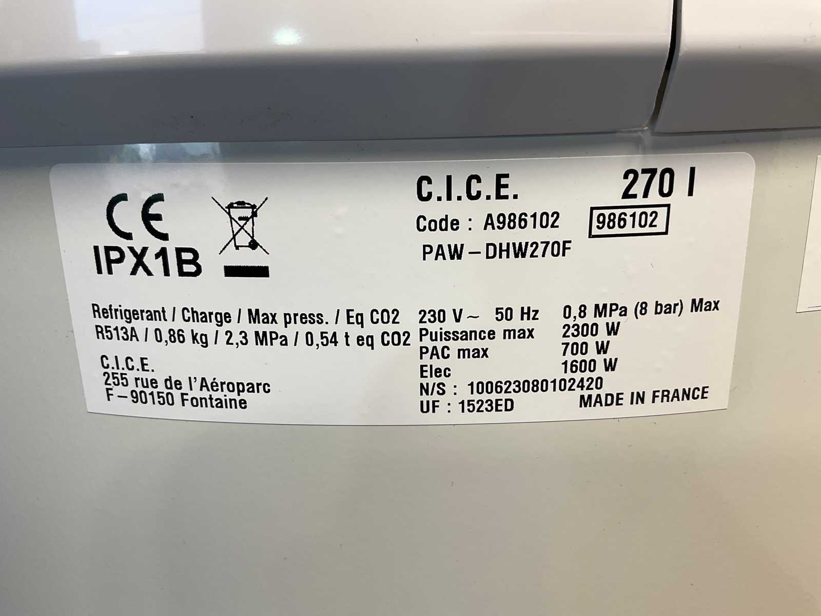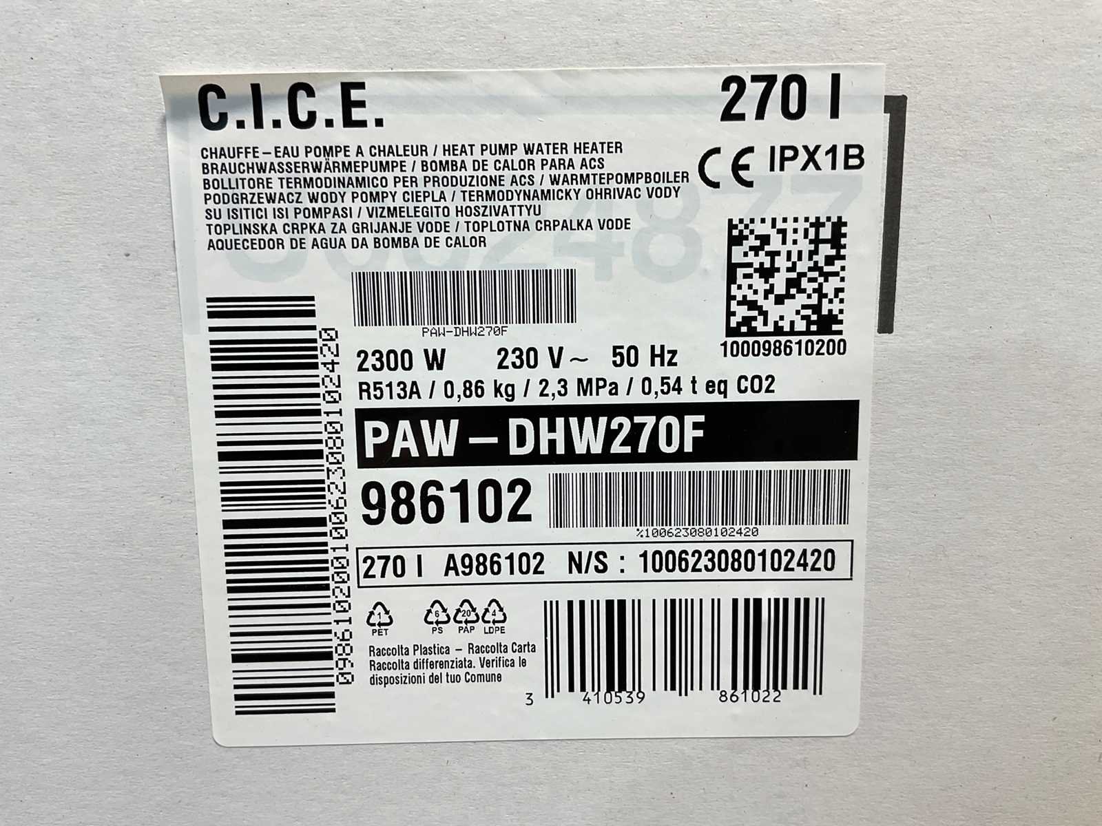 Panasonic PAW-DHW270F warmtepompboiler zonder installatie. Deze unit betreft een zelfstandige warmtepompboiler voor de productie van sanitair warm water. De boiler is uitgevoerd als vloermodel en werkt met koudemiddel R513A. De boiler heeft een opslagcapaciteit van 270 liter en is voorzien van een geïntegreerde warmtepomp. Het maximale opgenomen vermogen bedraagt circa 2,3 kW en de unit werkt op 230 V (1-fase). De boiler is geschikt voor toepassing in residentiële installaties als energiezuinig alternatief voor traditionele elektrische boilers en kan functioneren binnen een breed temperatuurbereik. Merk: Panasonic Model: PAW-DHW270F Product type: Warmtepompboiler Kleur: grijs, wit Gewicht: 92kg Lengte: 66,5cm Breedte: 62cm Hoogte: 195,7cm