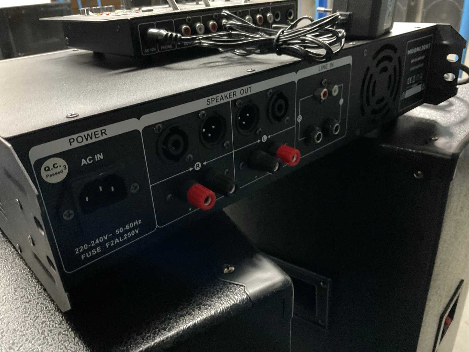 Bestaande uit: 2x Box 400 Watt, versterker, mixer USB en Bluetooth, 2x speakon kabels Merk: Moonlight