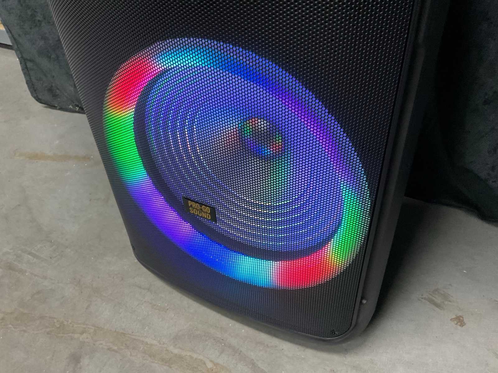 Ingebouwde accu, LED verlichting, Bluetooth, USB, 1 draadloze microphones, laadkabel, 15 inch woofer, 400 Watt. Merk: Pro-Go Sound Lengte: 30cm Breedte: 40cm Hoogte: 62cm