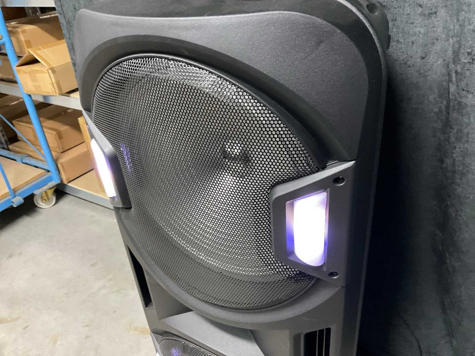 LED verlichting, Bluetooth, USB, laadkabel, 1x Microphone, 2x 15 inch woofer, 800 Watt. Merk: Pro-Go Sound Lengte: 37cm Breedte: 47cm Hoogte: 106cm