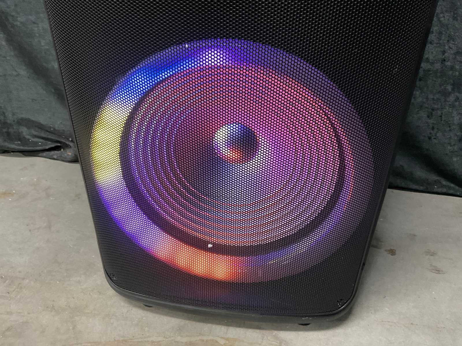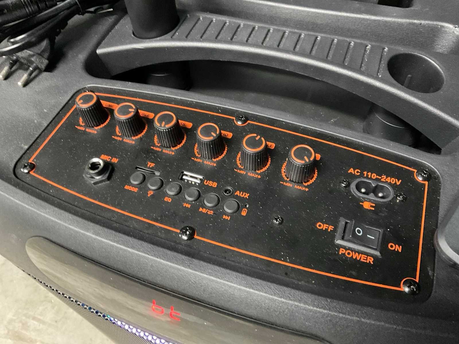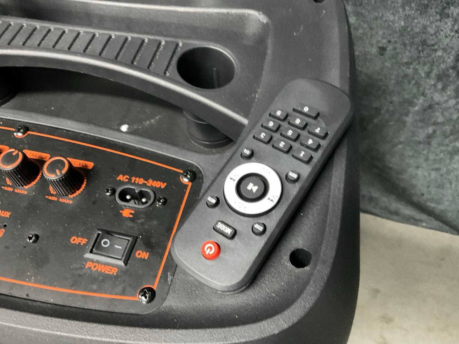 Ingebouwde accu, LED verlichting (werkt half), Bluetooth, USB, 1 draadloze microphones, laadkabel, 15 inch woofer, 400 Watt. Merk: Pro-Go Sound Lengte: 30cm Breedte: 40cm Hoogte: 62cm