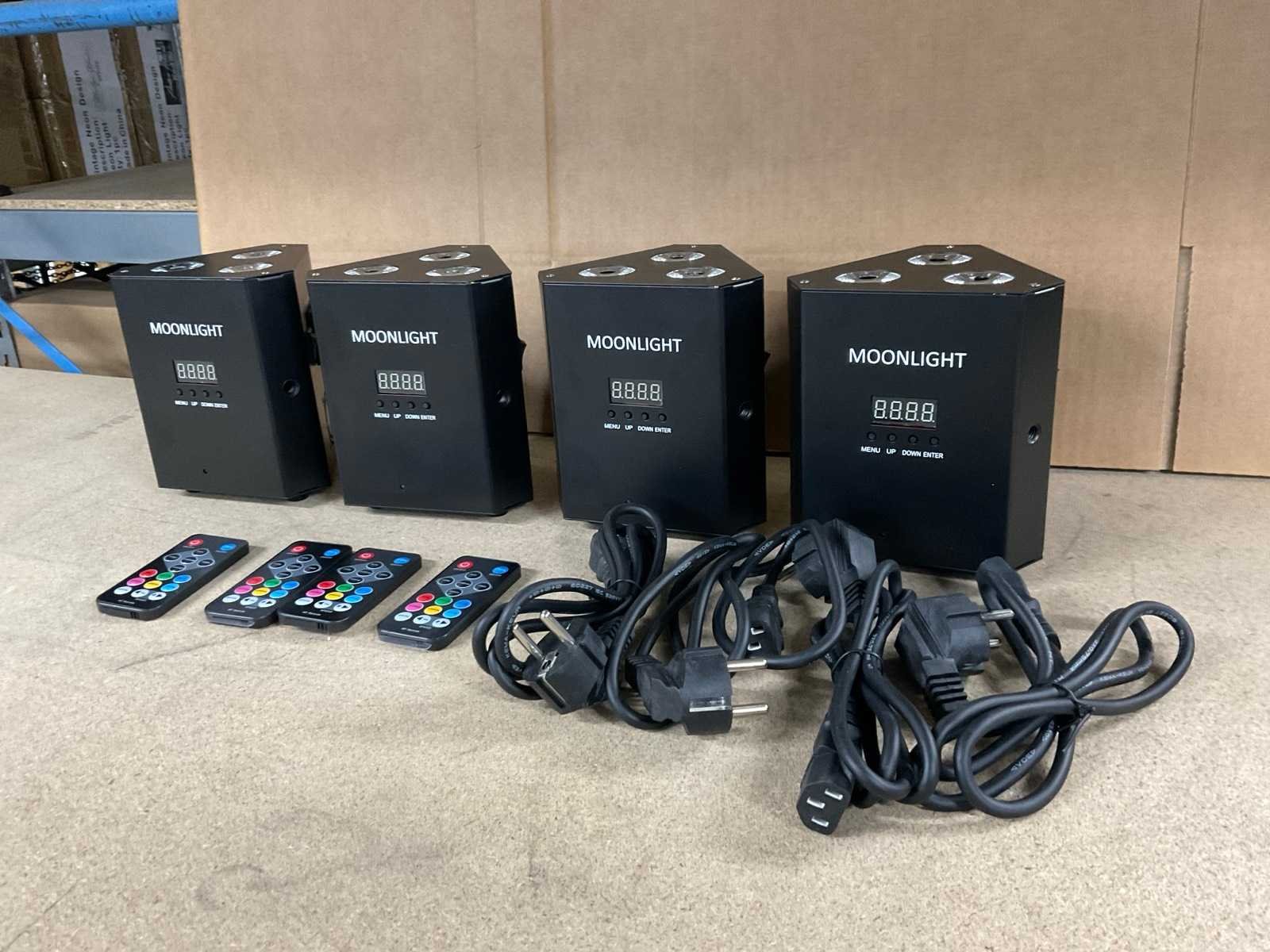 Accu, draadloze afstandsbediening, 3x 10 Watt. Merk: Moonlight RGB: true DMX: true Aansluiting: 230V Totale afmeting L: 140mm Totale afmeting Breedte: 140mm Totale afmeting Hoogte: 150mm