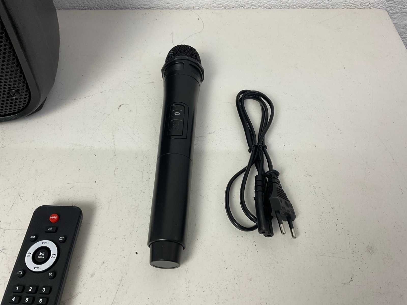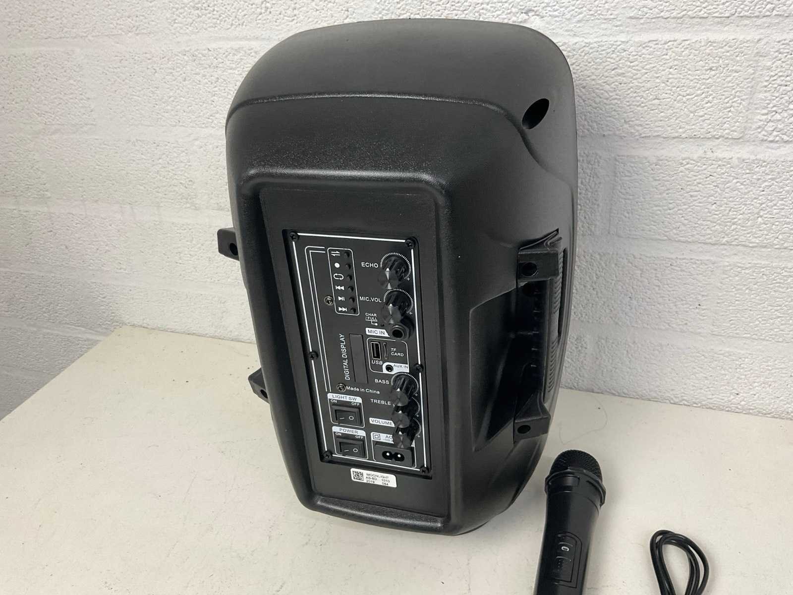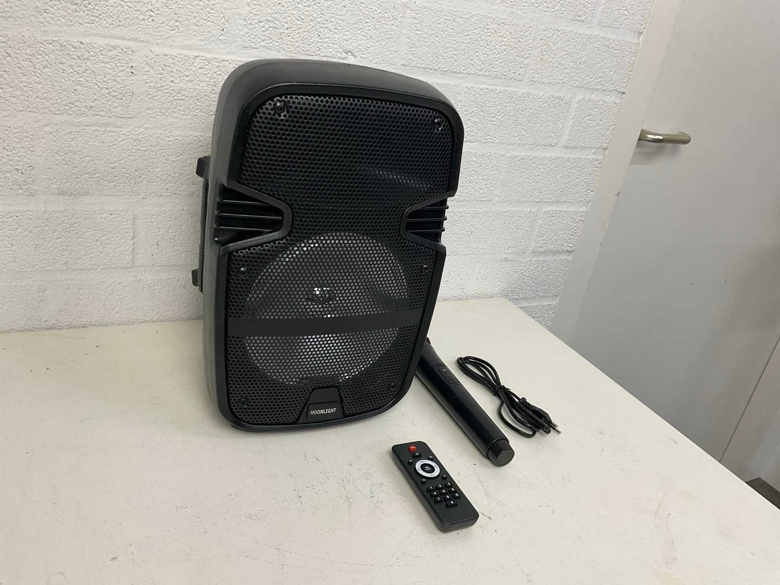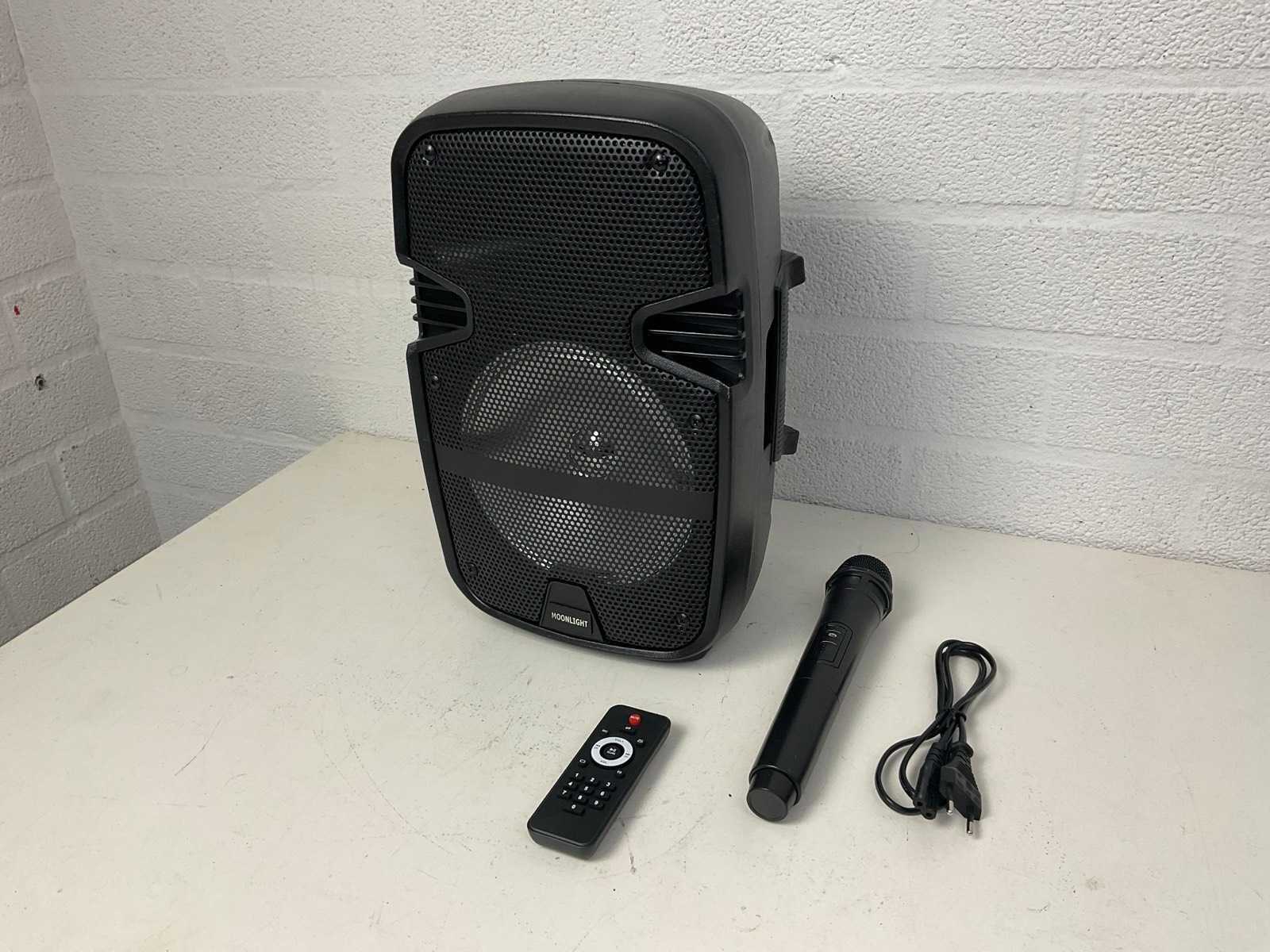 Inclusief draadloze microfoon, Bluetooth, USB, afstandsbediening Merk: Moonlight Actief: true Vermogen: 50W Aansluiting: 230V Totale afmeting L: 200mm Totale afmeting Breedte: 210mm Totale afmeting Hoogte: 380mm
