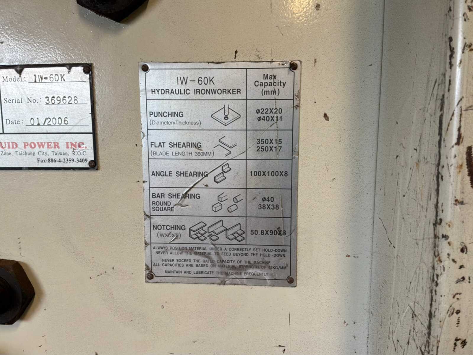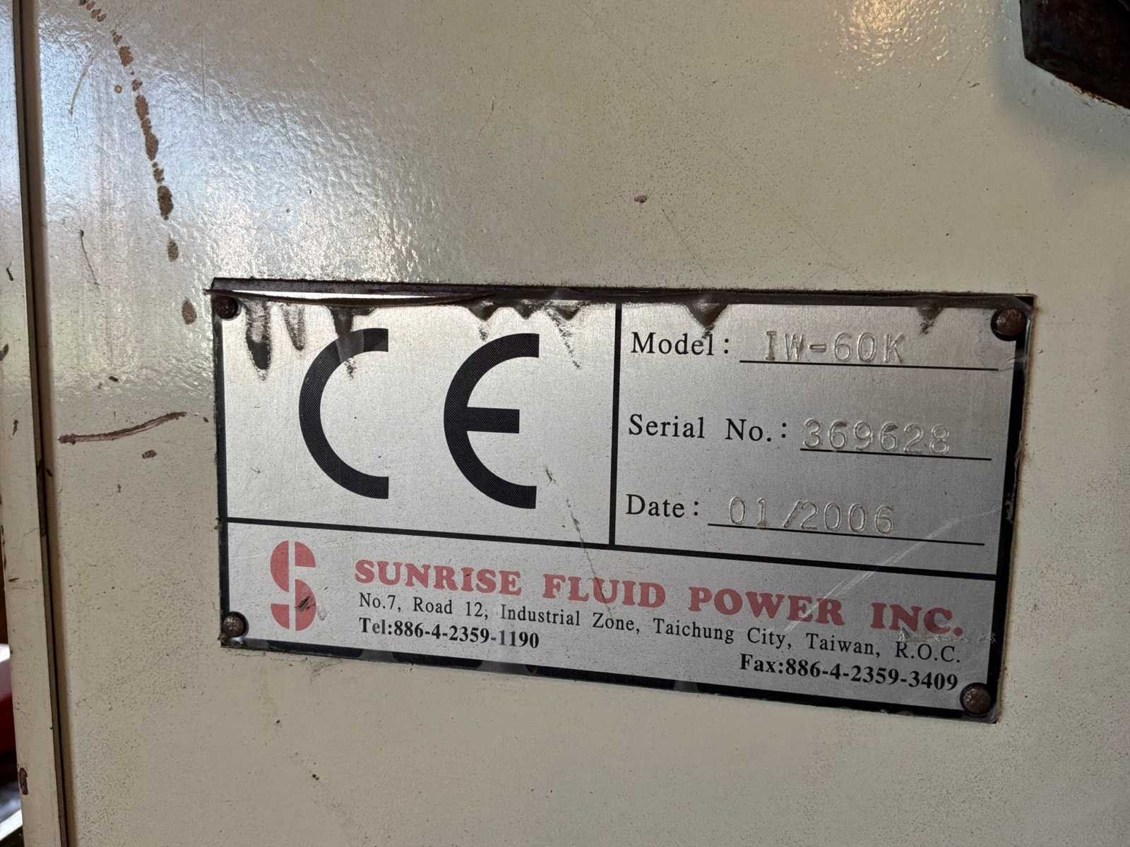 Voorzien van: handmatig bedienbare in hoogteverstelbare aanvoer rollenbaan, 1400x6000x1330mm, werkbank 1270x600x940mm, inhoud van de werbank inbegreoen Merk: Sunrise Type: IW-60K Bouwjaar: 2006 Serienummer: 369628 Capaciteit.: 60t Elektrisch aangedreven: true Handbediend: true Afmeting b: 1100mm Afmeting h: 1800mm Hamer afm. b: 650mm Max. plaat afm. l: 360mm Max. plaatdikte: 15mm Voetbediening: true Aansluiting: 400V