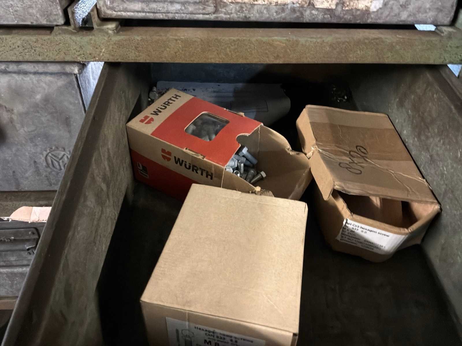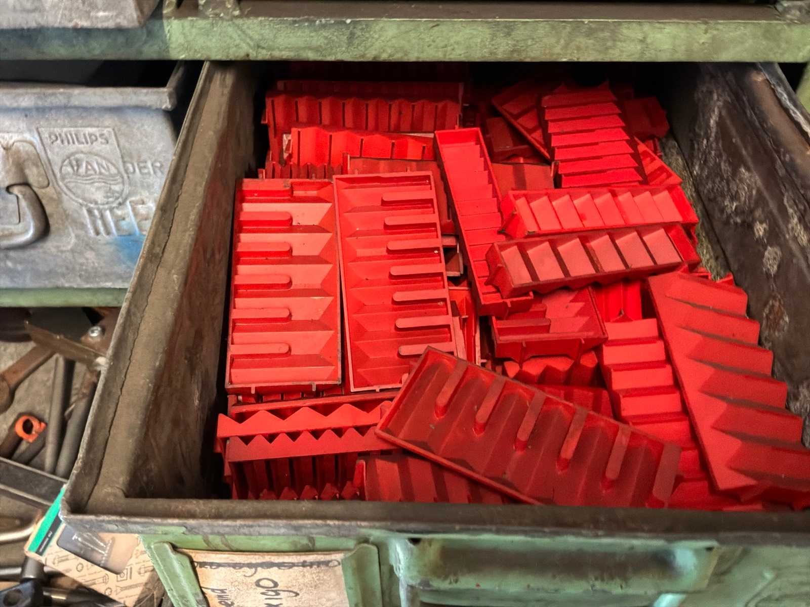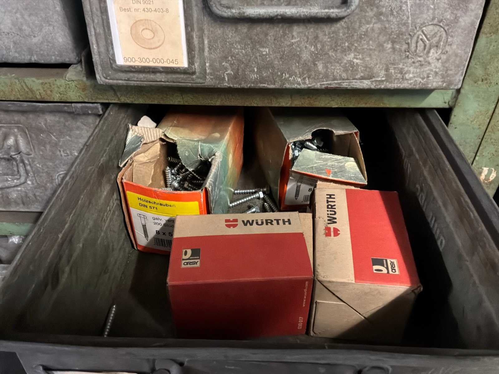 Waaronder: 5x metalen kast, 540x800x2130mm, met 20 metalen bakken. De inhoud van deze bakken (bevestigingsmateriaal) is bij het kavel inbegrepen. De foto’s van de inhoud van de bakken zijn ter illustratie.