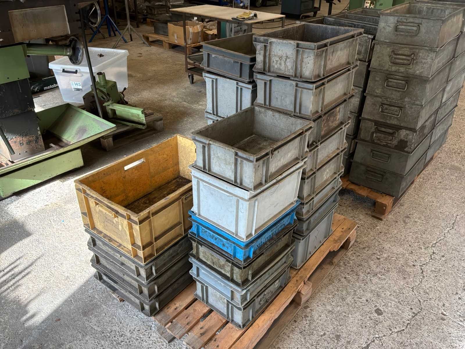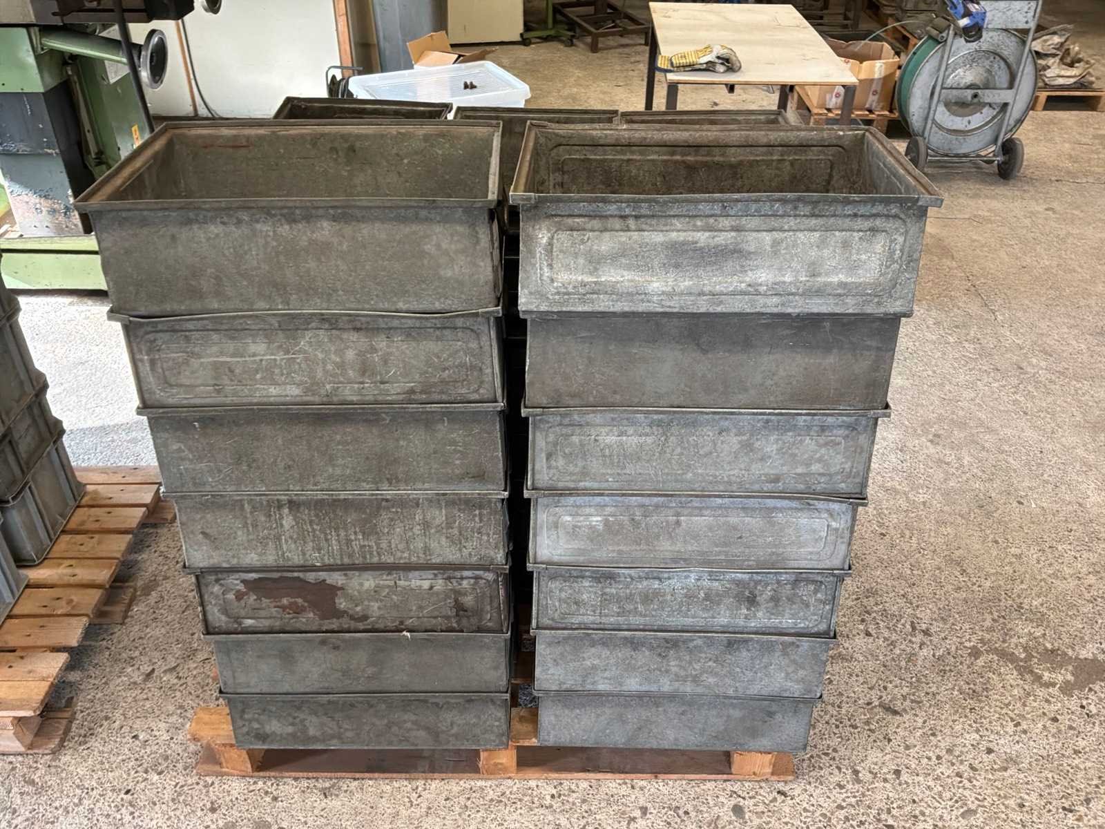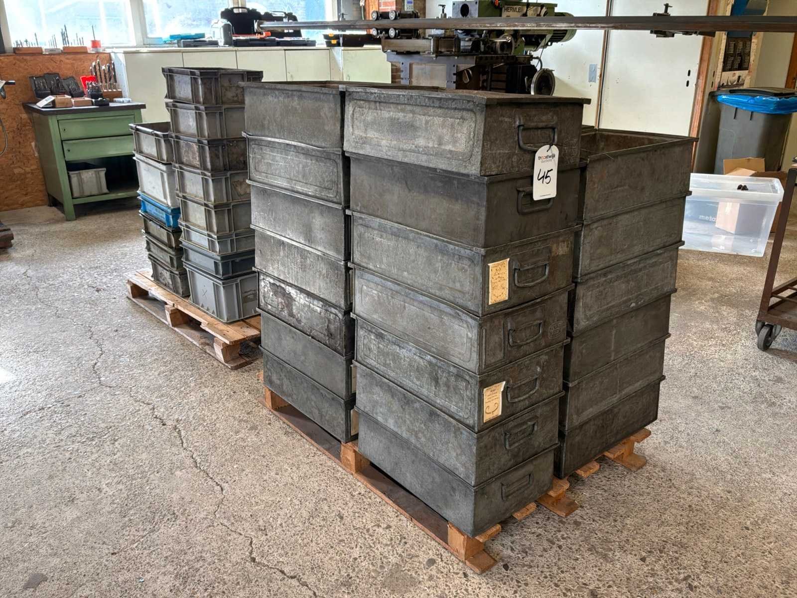 Waaronder: 37x metalen bak 530x340x170mm, 23x kunstofbakken in diverse formaten, op en inclusief pallet Staal: true Kunststof: true