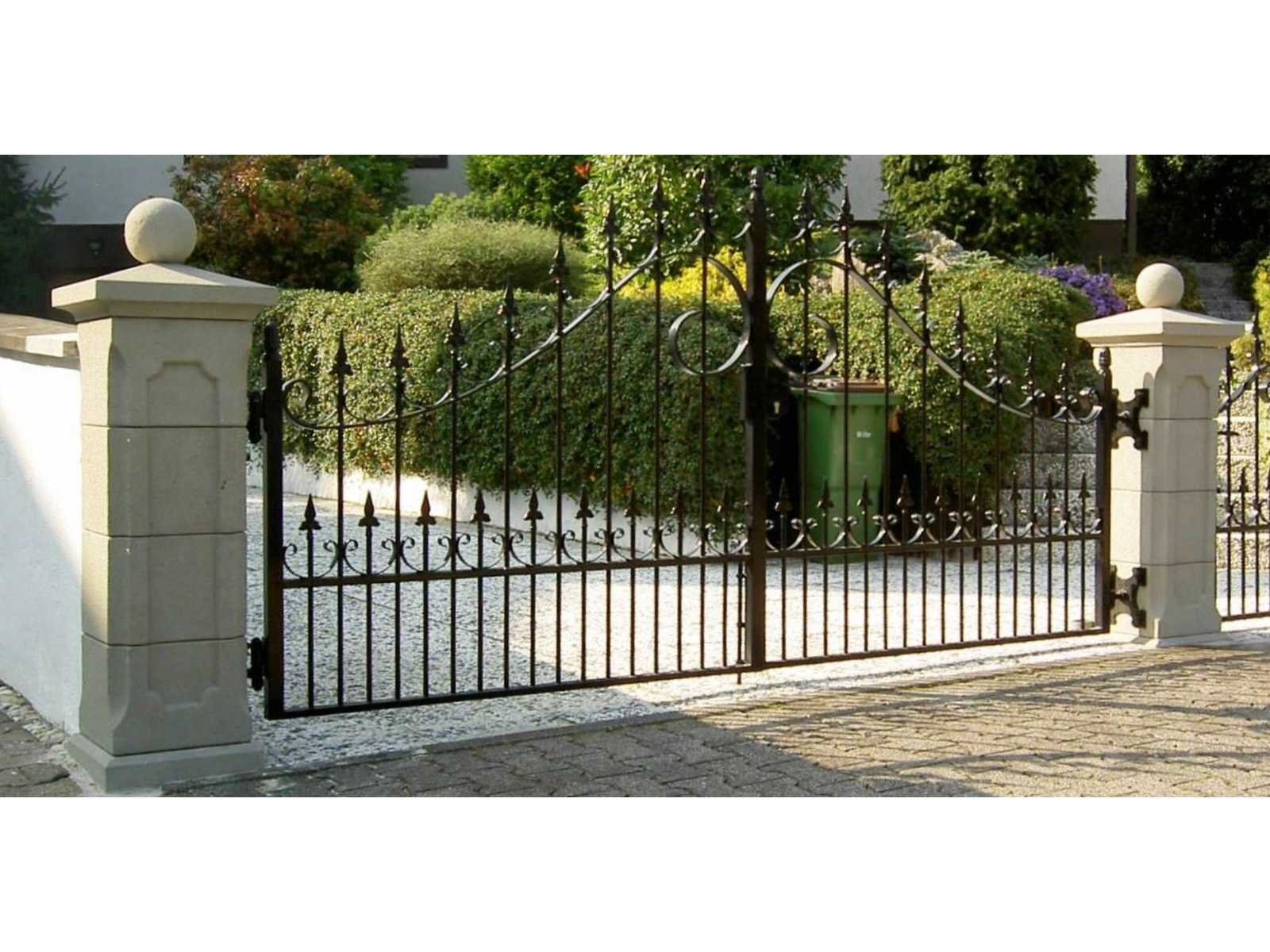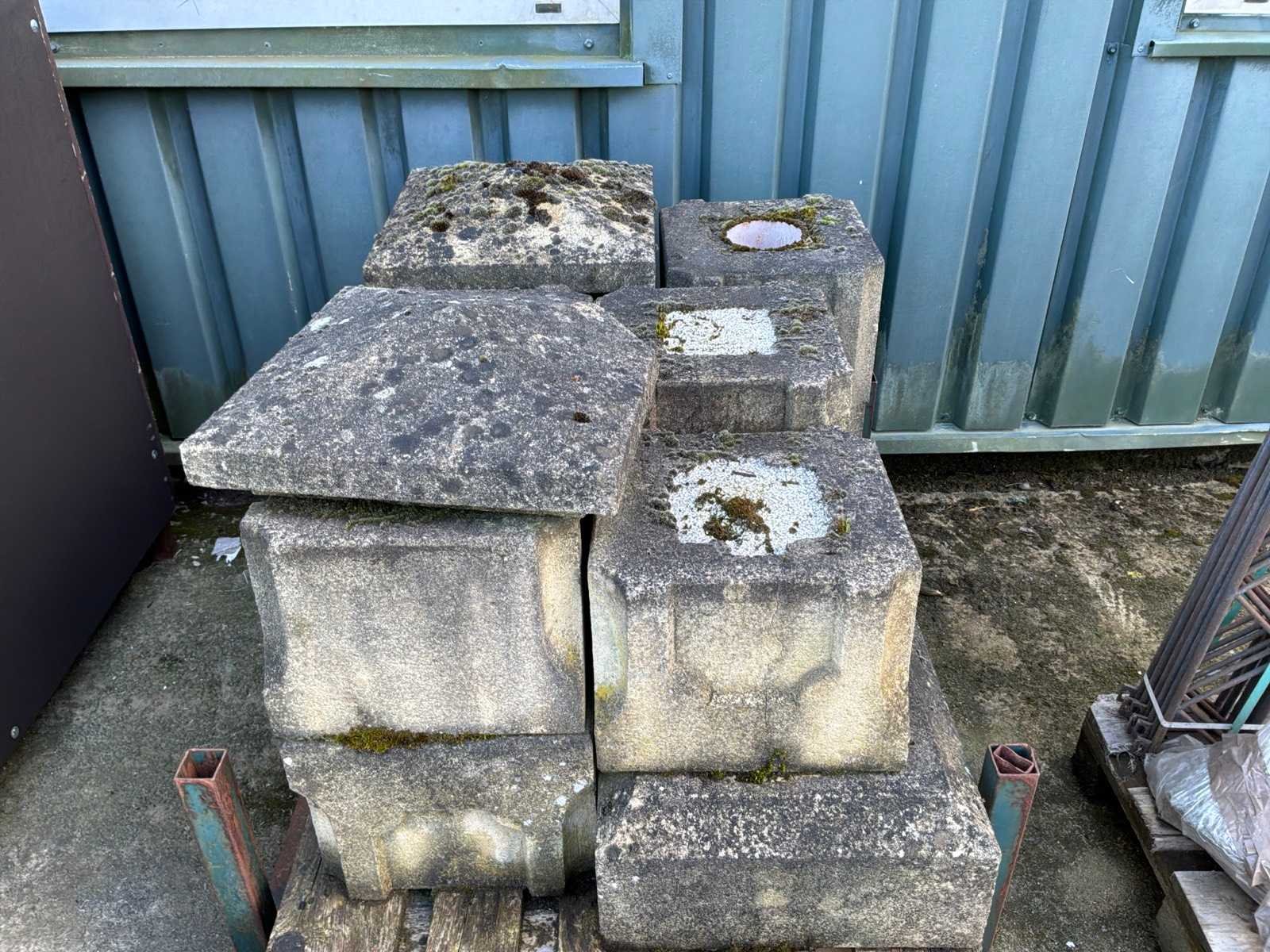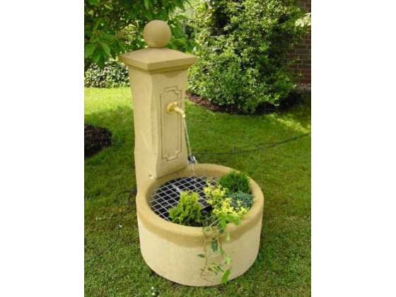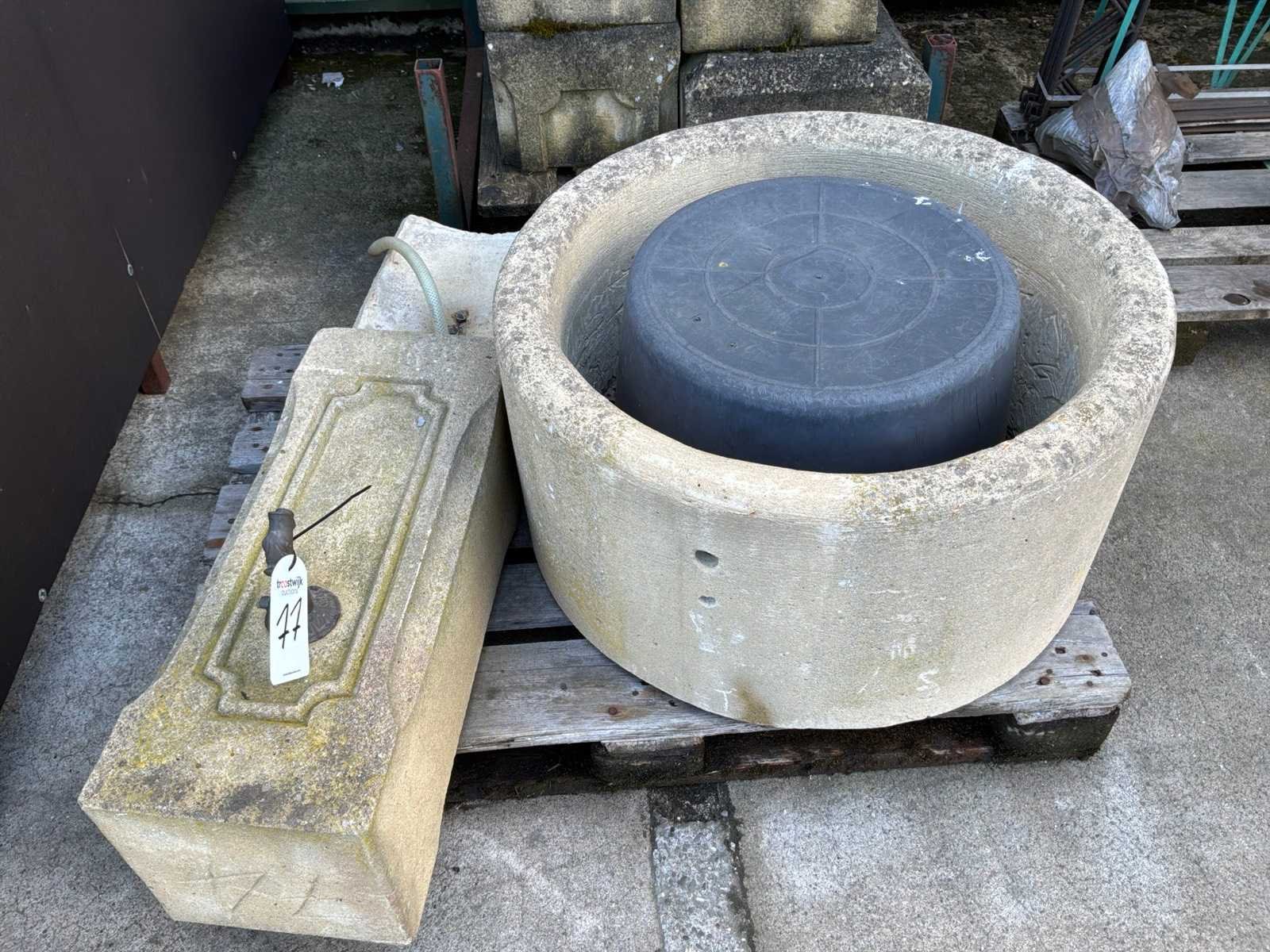 Bestaande uit: 2x zandsteen zuilen voor het bevestigen van poorten, 1x bron, op en inclusief pallet.