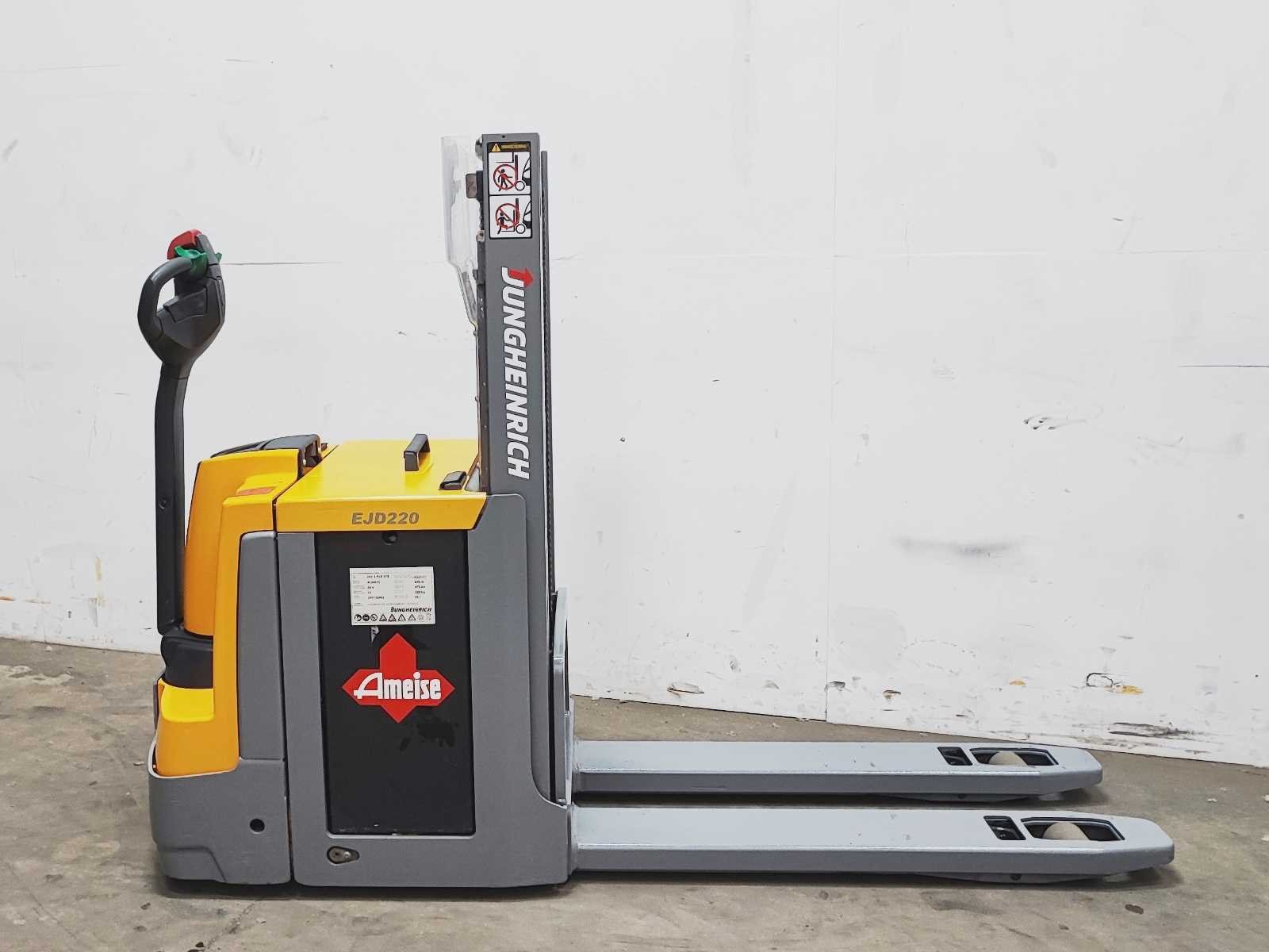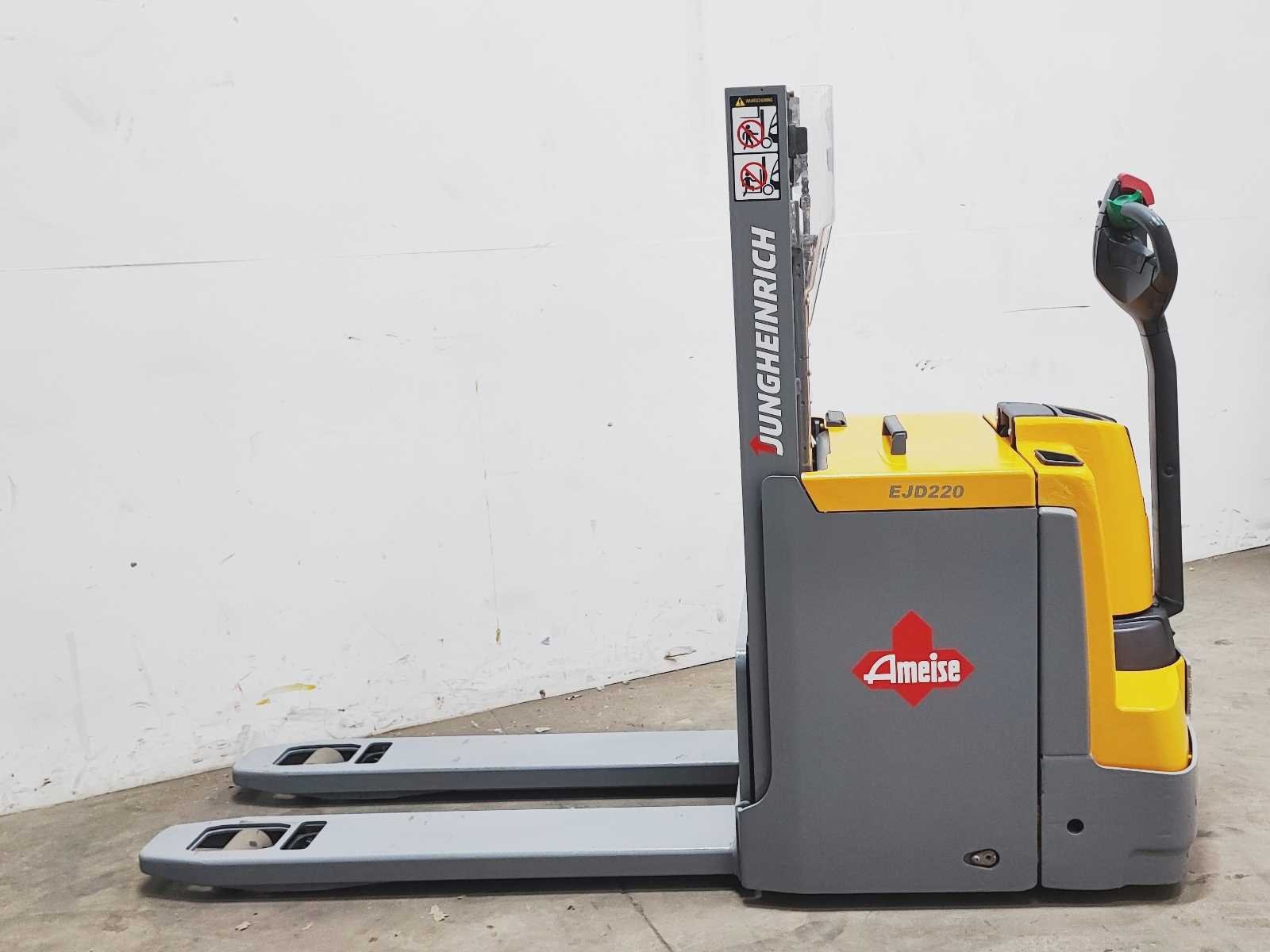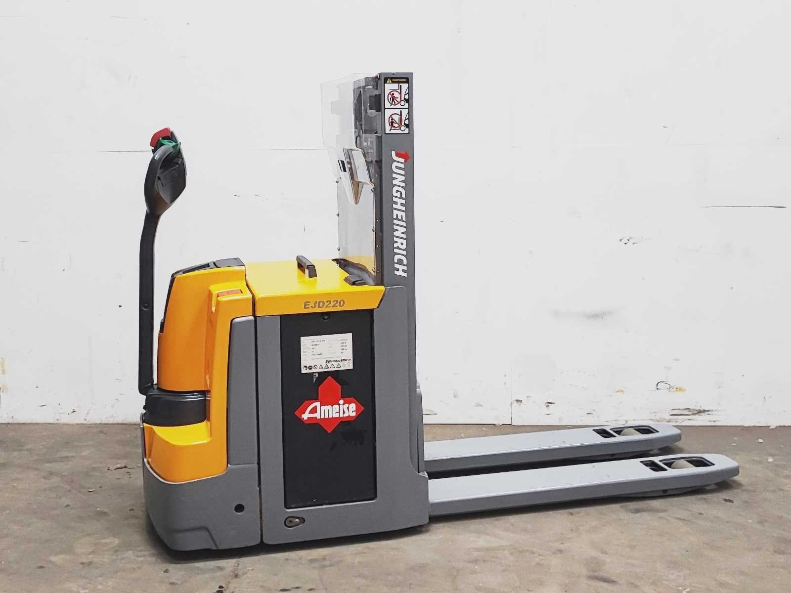 Jungheinrich EJD 220 elektro dubbelstock stapelaar v.v. duplo mast met dubbelstockfunctie, hefvermogen 2000 / 1000 kg, hefhoogte 210 / 2010 mm Merk: Jungheinrich Type: EJD 220 Bouwjaar: 2016 Serienummer: 90501837 Hefvermogen: 2000kg Hefhoogte: 2010mm Lepellengte: 1180mm Afgelezen urenstand: 4915 Eigen gewicht: 1050kg Minimale doorrijhoogte: 1480mm Totale afmeting L: 2200mm Totale afmeting Breedte: 750mm Totale afmeting Hoogte: 1480mm Accu lader: true