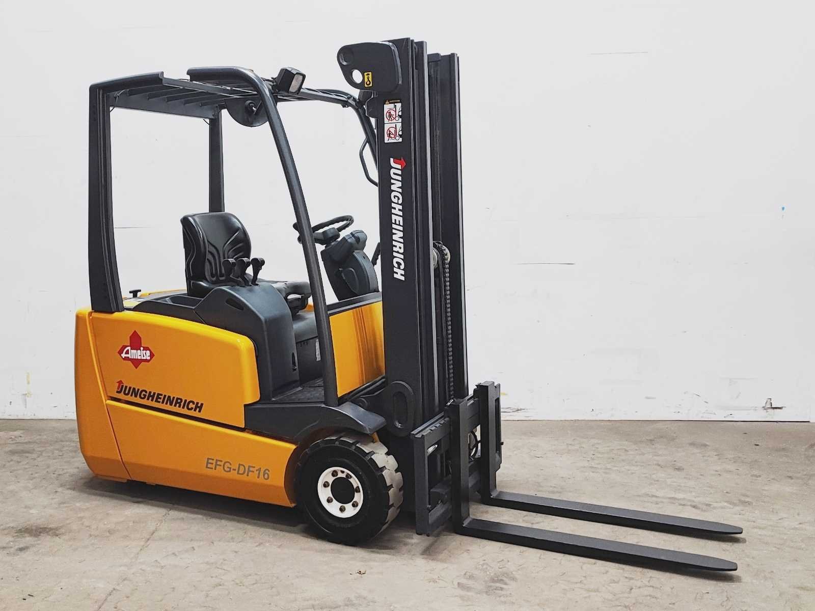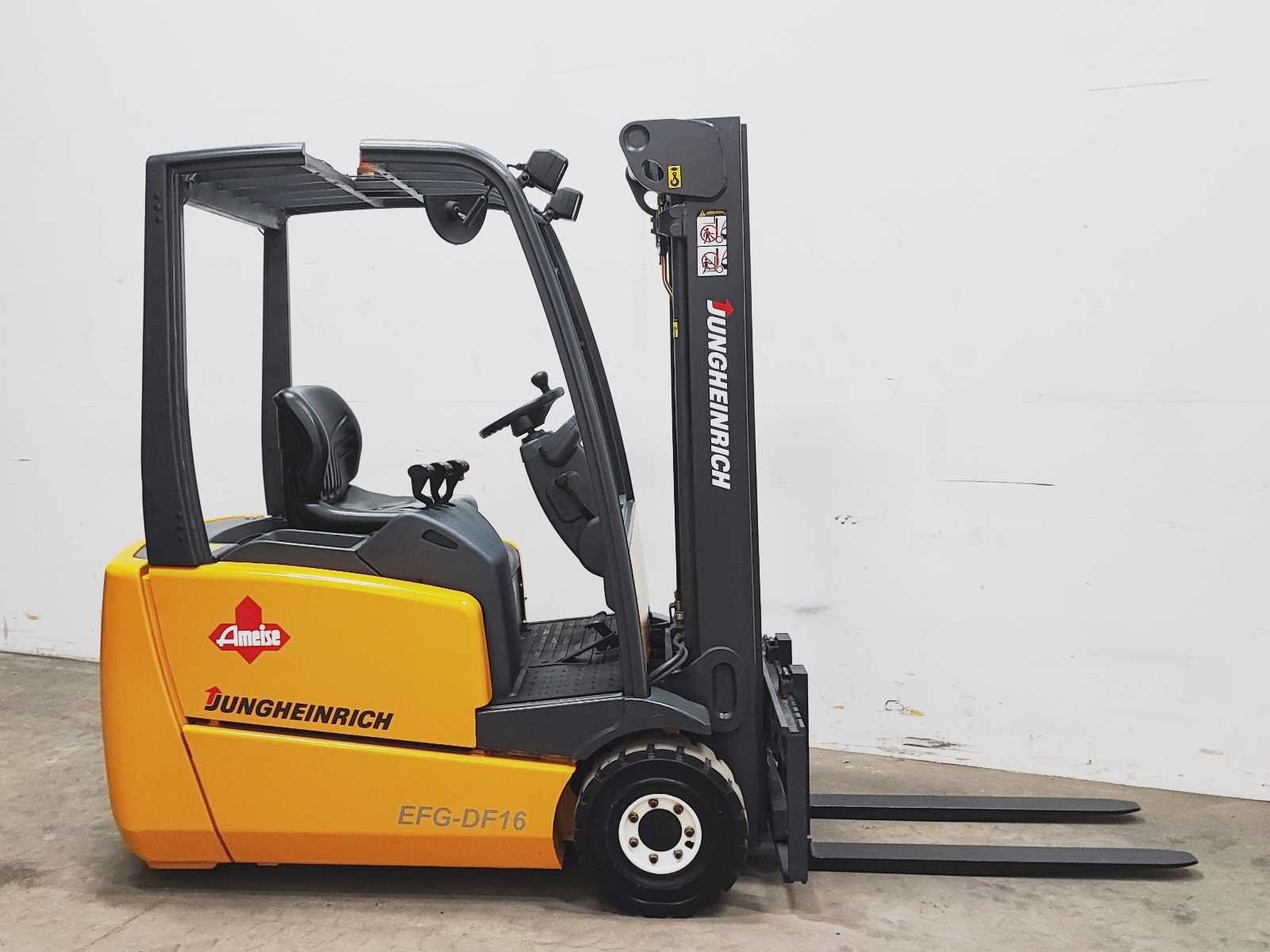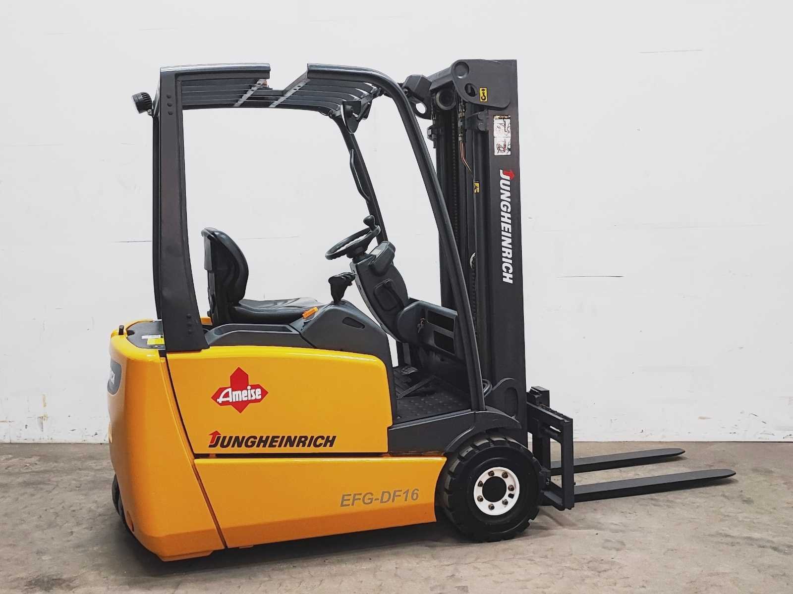 Merk: Jungheinrich Type: EFG-DF16 Bouwjaar: 2001 Serienummer: 89919122 Mast: Triplo freelift Aantal wielen: 3 Afgelezen urenstand: 15974 Accu lader: true Free-lift: true Side-shift: true Triple mast: true Eigen gewicht: 3200kg Hefvermogen: 1550kg Lepellengte: 1000mm Hefhoogte: 4500mm Vol rubber banden: true Minimale doorrijhoogte: 2010mm Totale afmeting L: 3000mm Totale afmeting Breedte: 1050mm Totale afmeting Hoogte: 2010mm