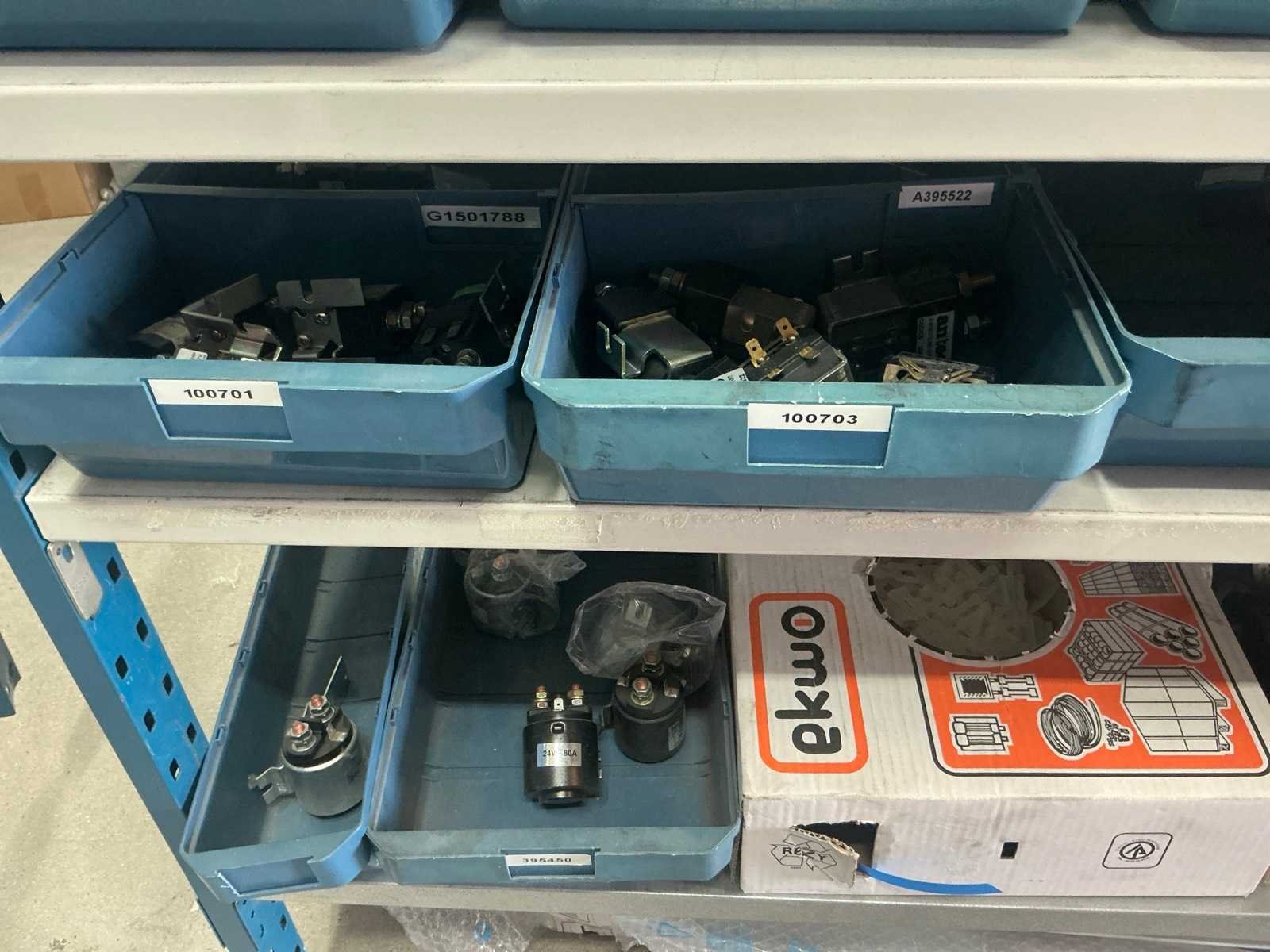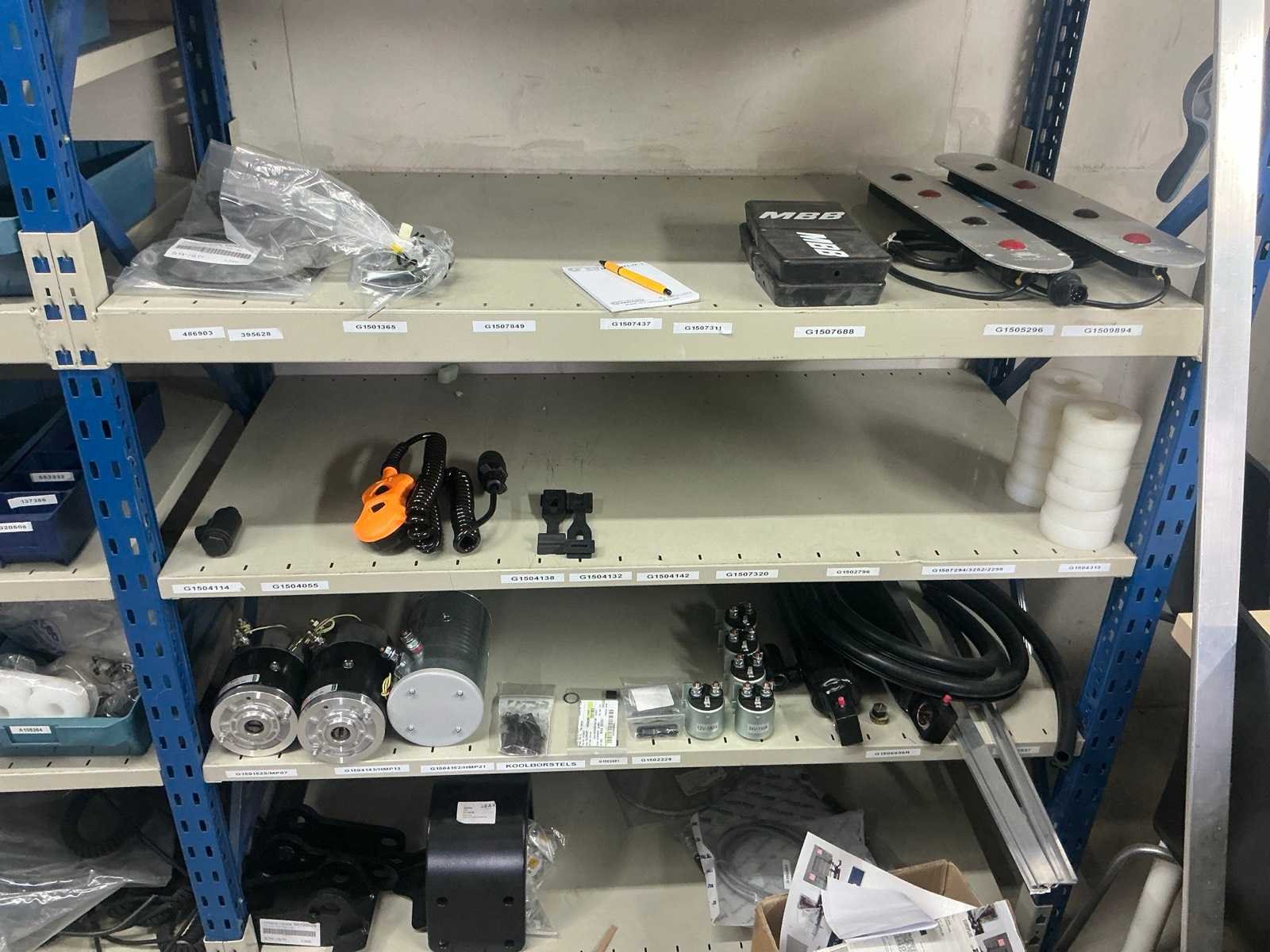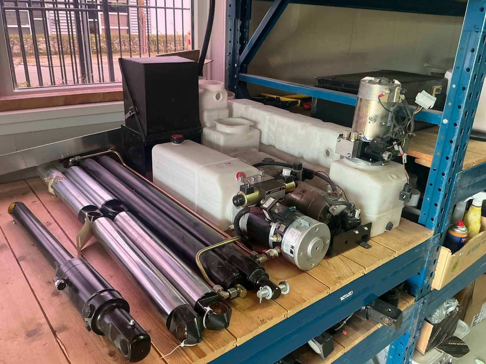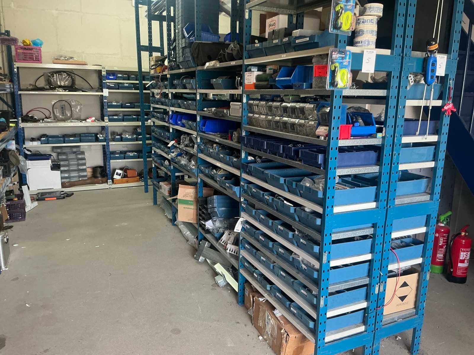 Inhoud van stellingen waaronder; diverse onderdelen voor laadklep, motoren en pompen, schakelaars en sturingen, ventielen, en kabels, verpakking materiaal, tafelbladen; let op! exclusief de motorheftafel en stelling