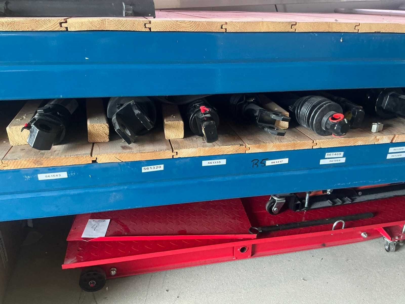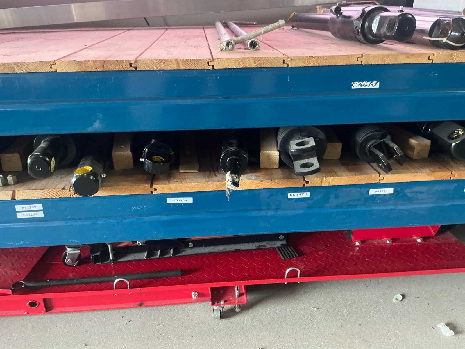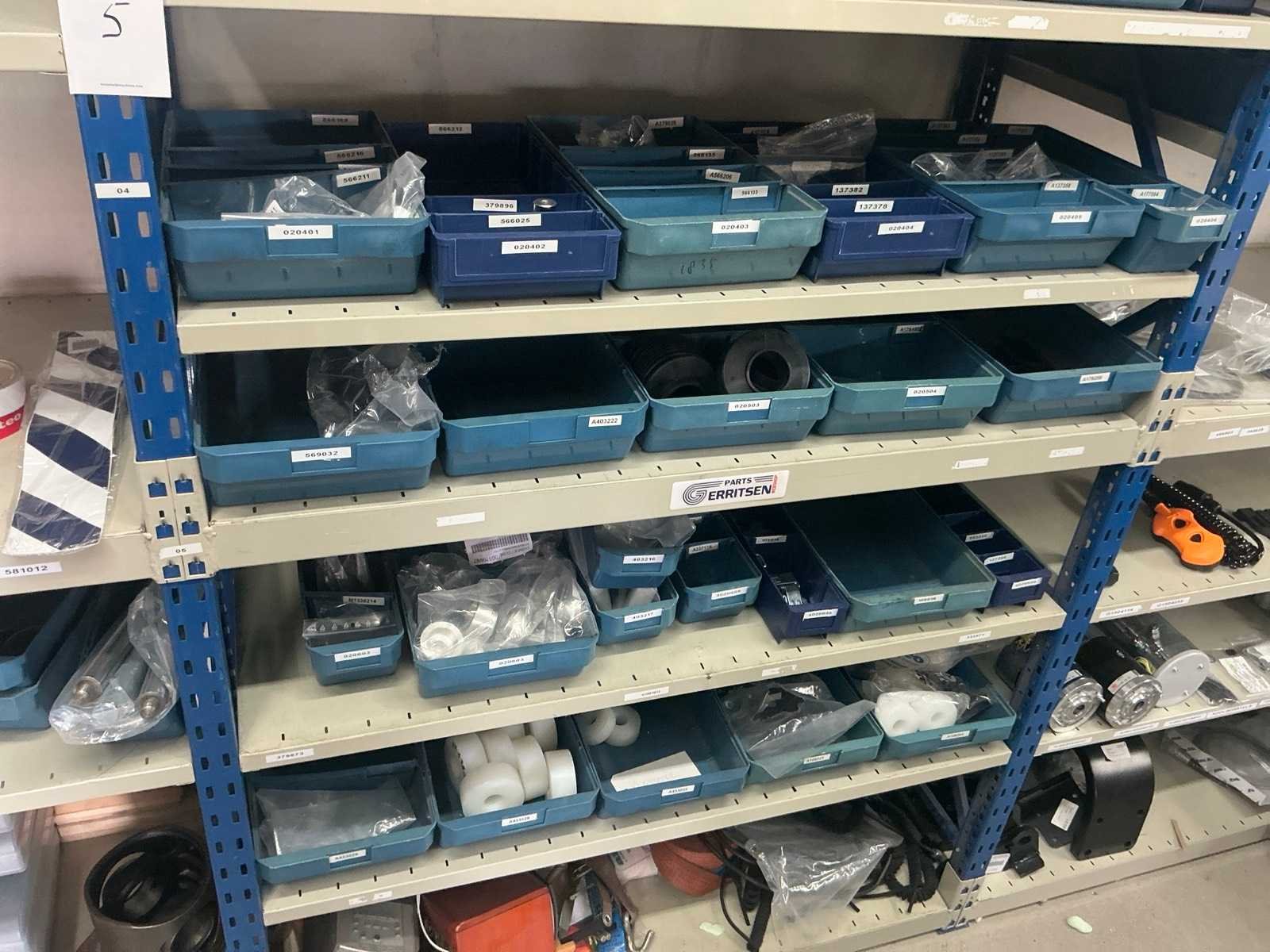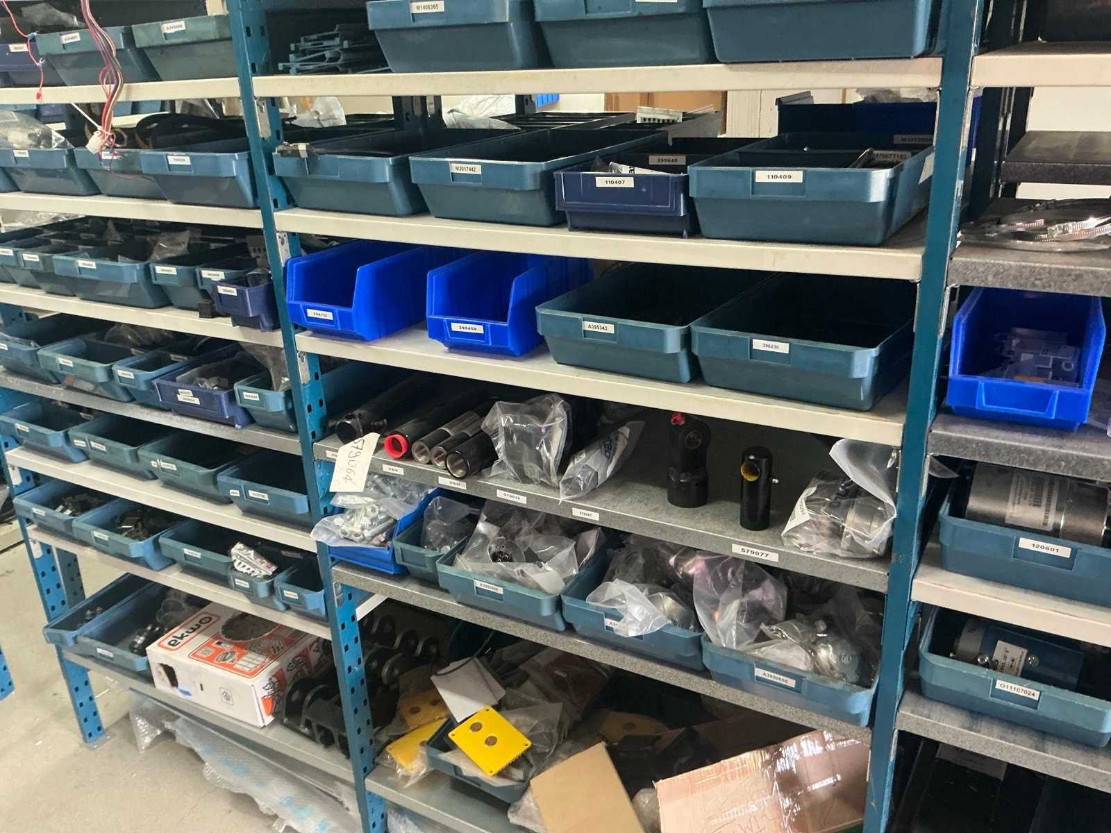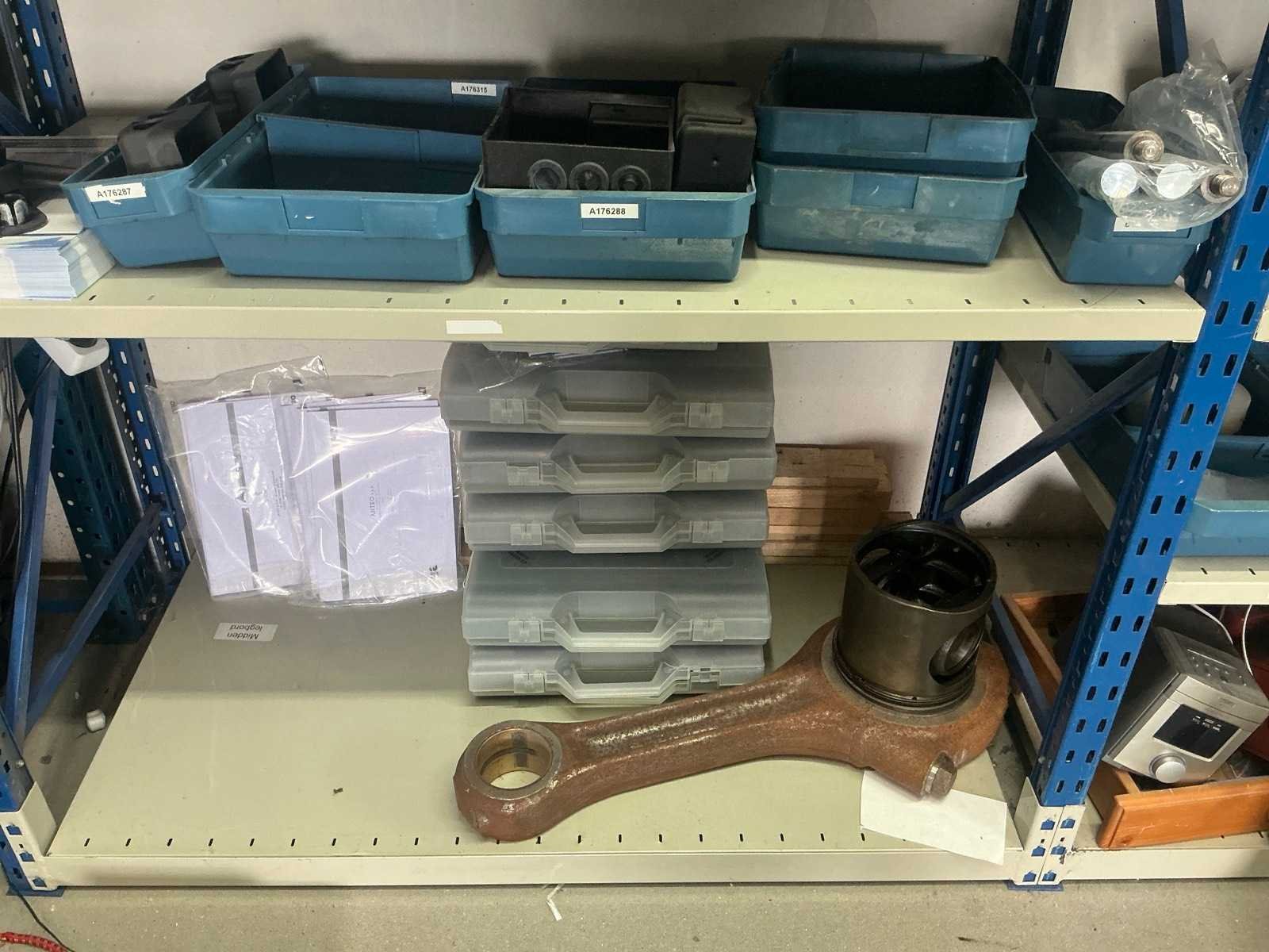 Inhoud van stellingen waaronder; diverse onderdelen voor laadklep, motoren en pompen, schakelaars en sturingen, ventielen, en kabels, verpakking materiaal, tafelbladen; let op! exclusief de motorheftafel en stelling