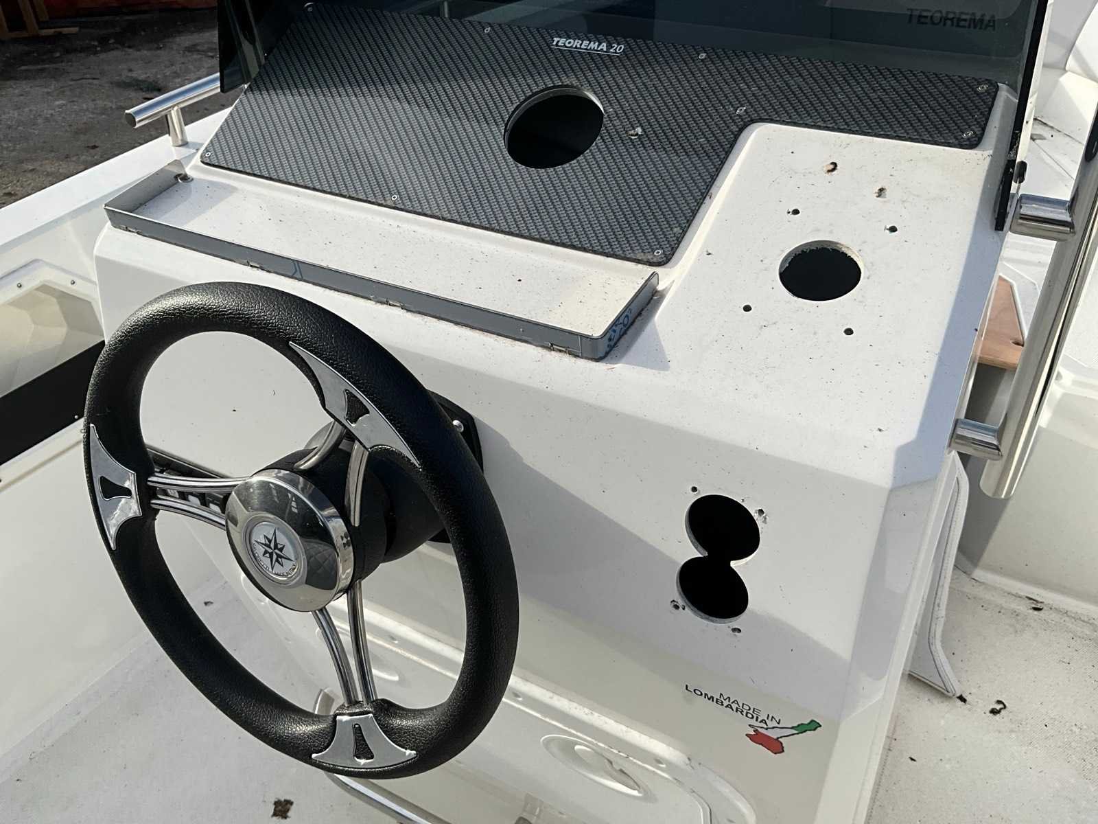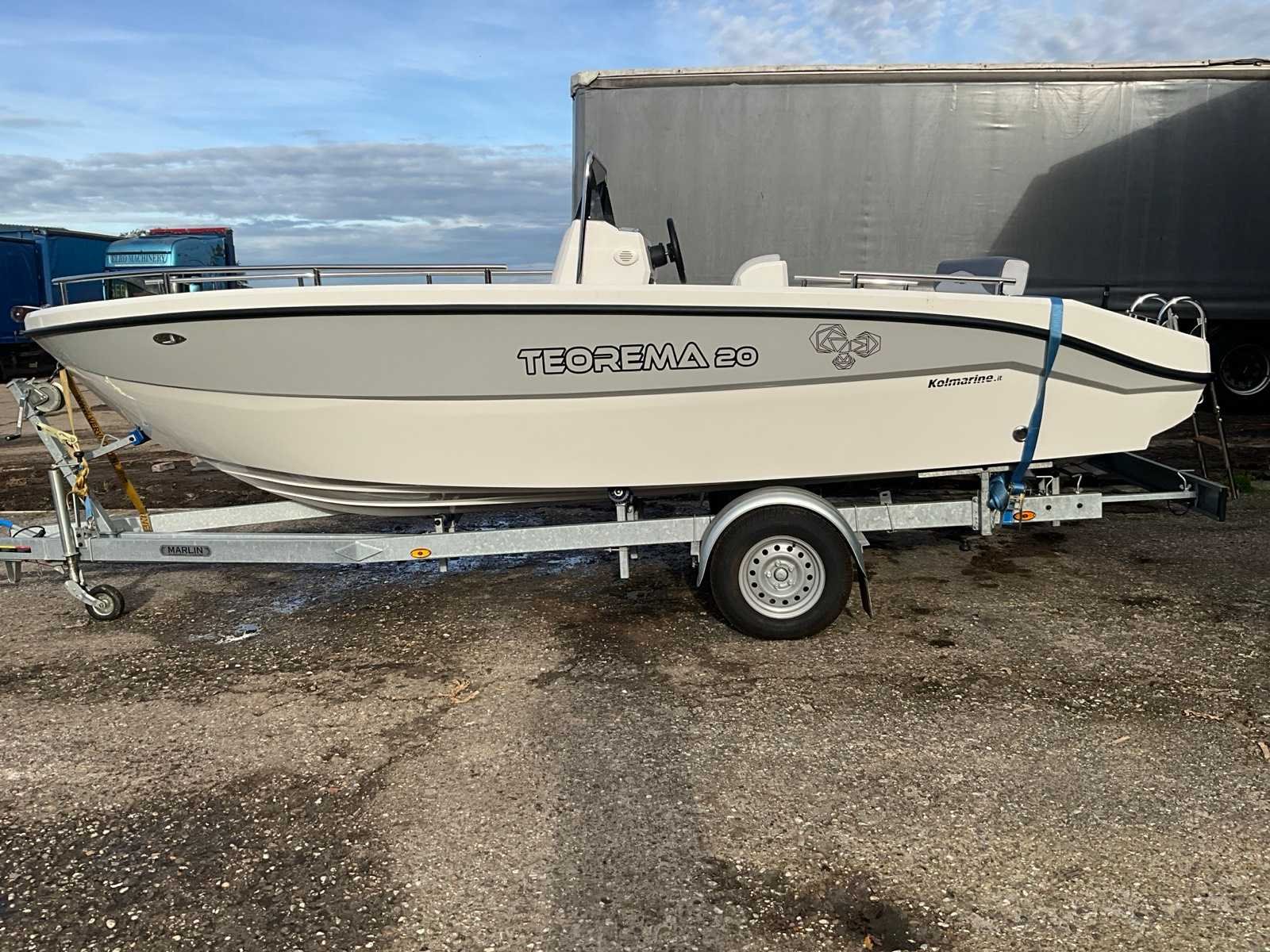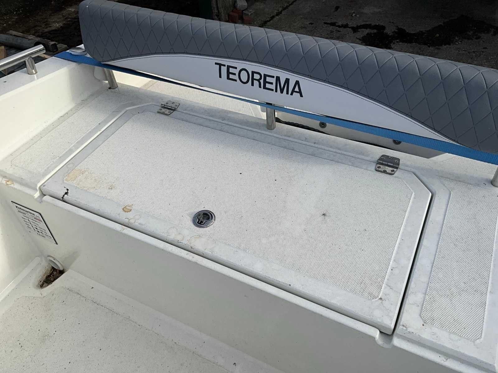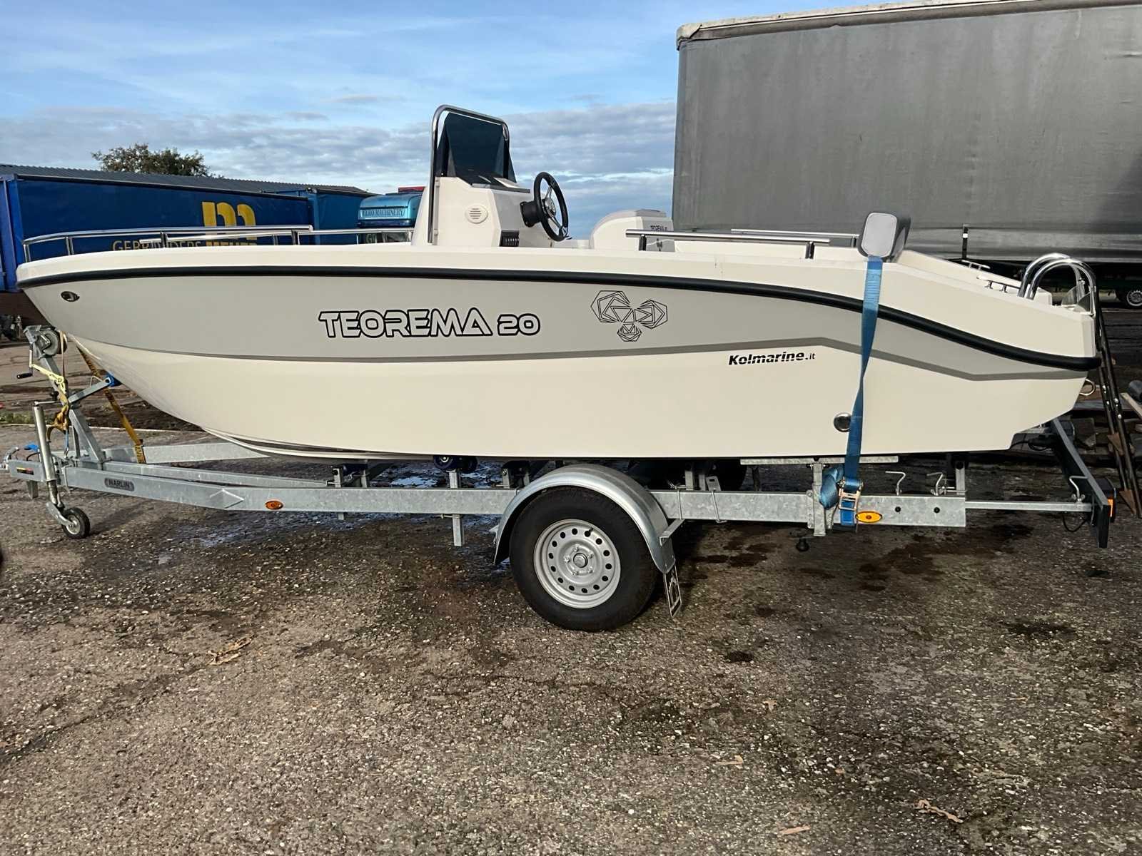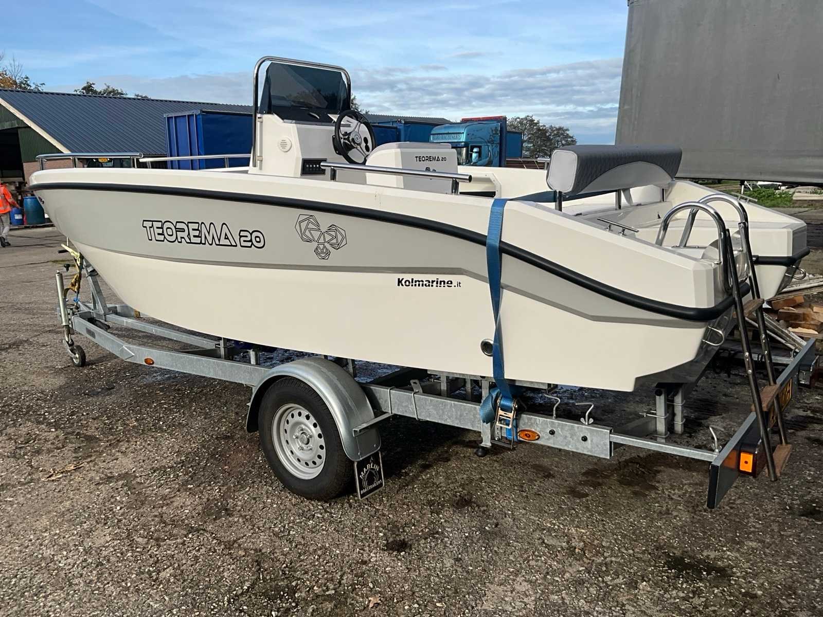 Teorema Sundeck Lengte: 5,92 m Breedte: 2,20 mtr. Maximaal vermogen: 140 pk Aantal passagiers: 7 tot 9 Hoogte binnenwand: 85 cm boeg, 65 cm achtersteven complete binnen- en buitenkussens, mechanisch stuurwiel met stuurwiel, lenspomp, navigatieverlichting, zwemtrap, 2 kajuit patrijspoorten, gekleurde fascia in de zijkant, boeg achtersteven, elektrisch paneel, complete set van roestvrij stalen leuningen, 4 bolders. Kan zonder vaarbewijs gemotoriseerd worden tot 140 pk. Let op!! excl. Trailer en excl. buitenboord motor Merk: Kolmarine Type: Teorema 20 Sundeck Rompmateriaal: Polyester Lengte: 5920 Breedte: 2200