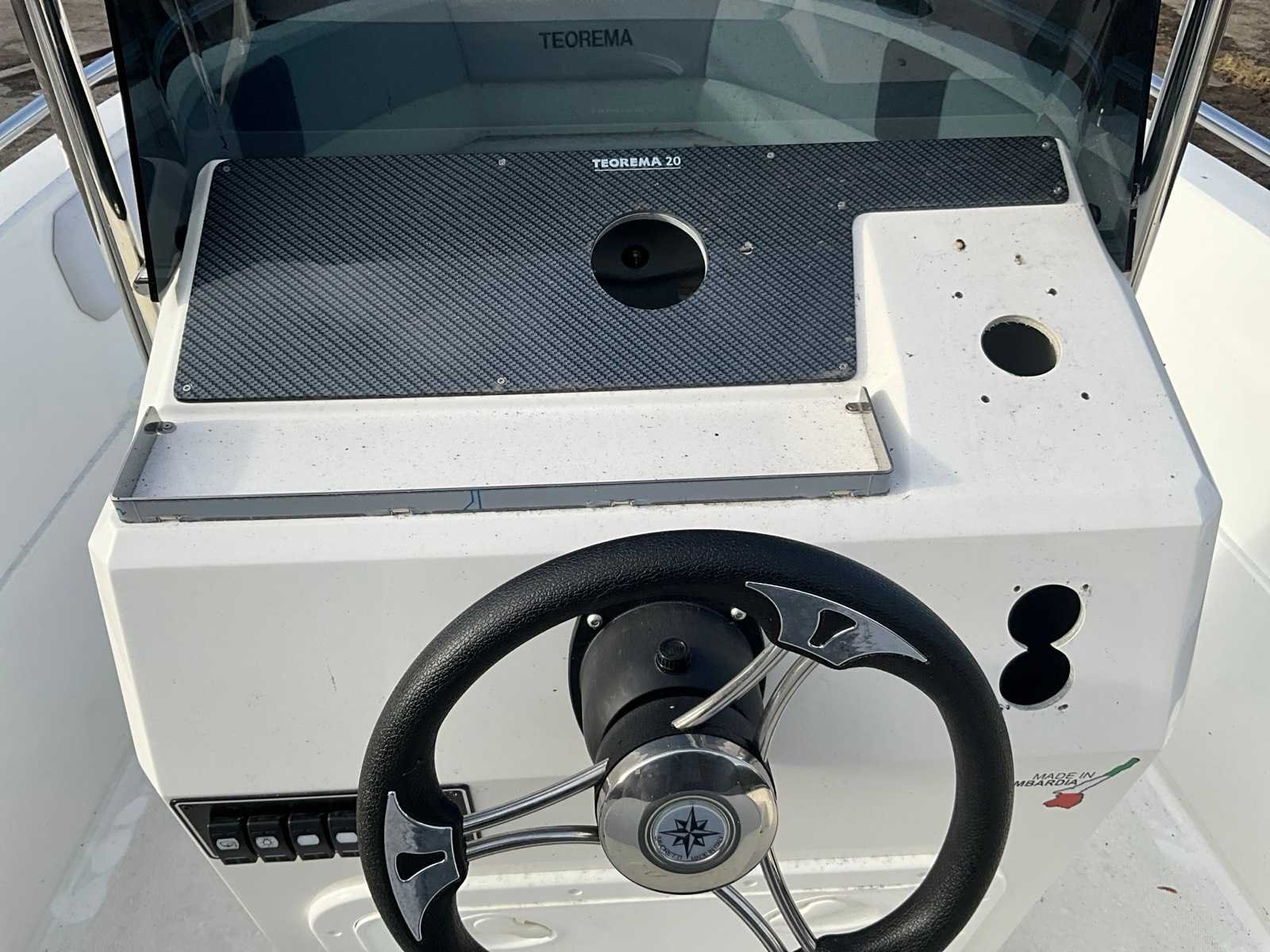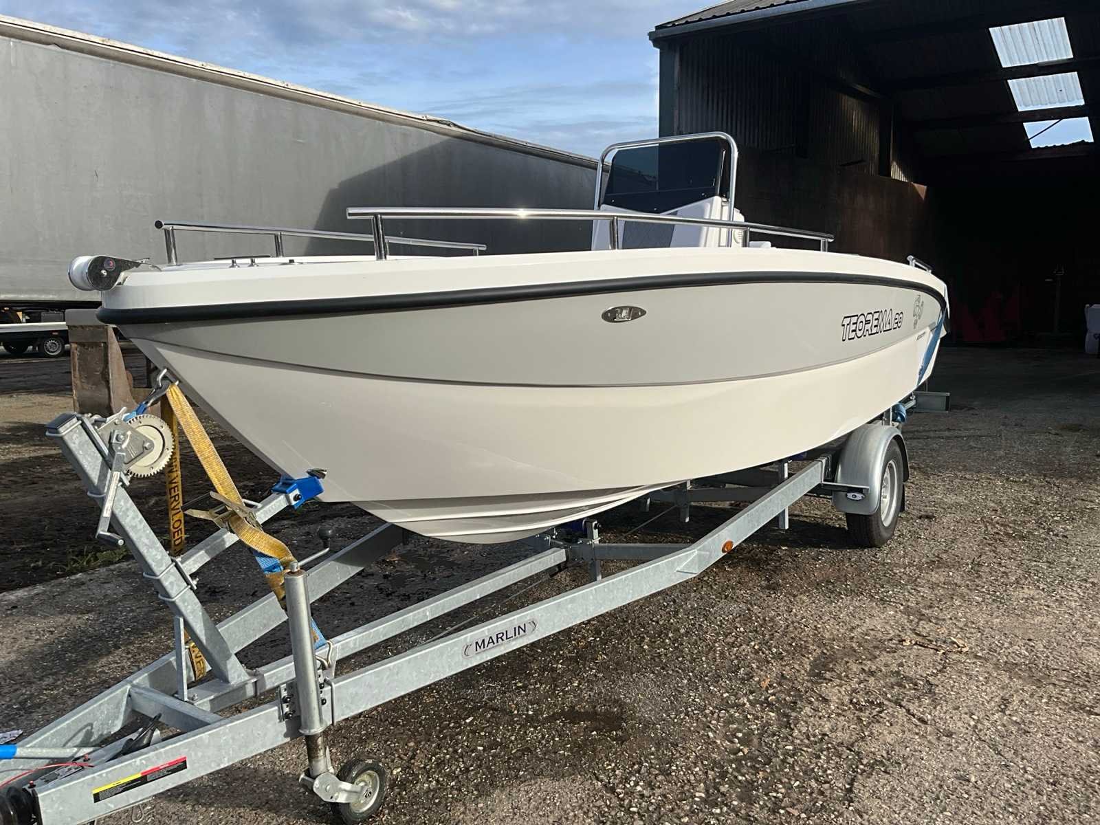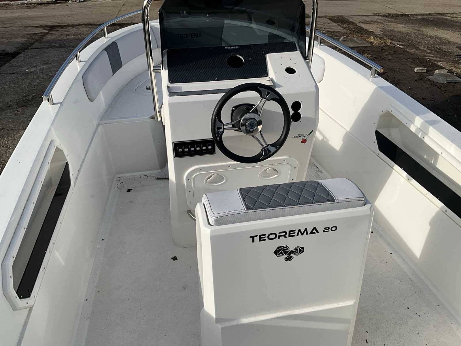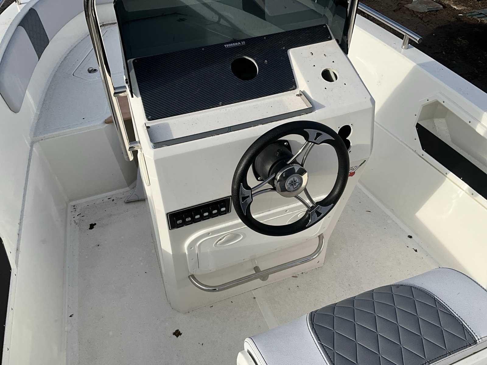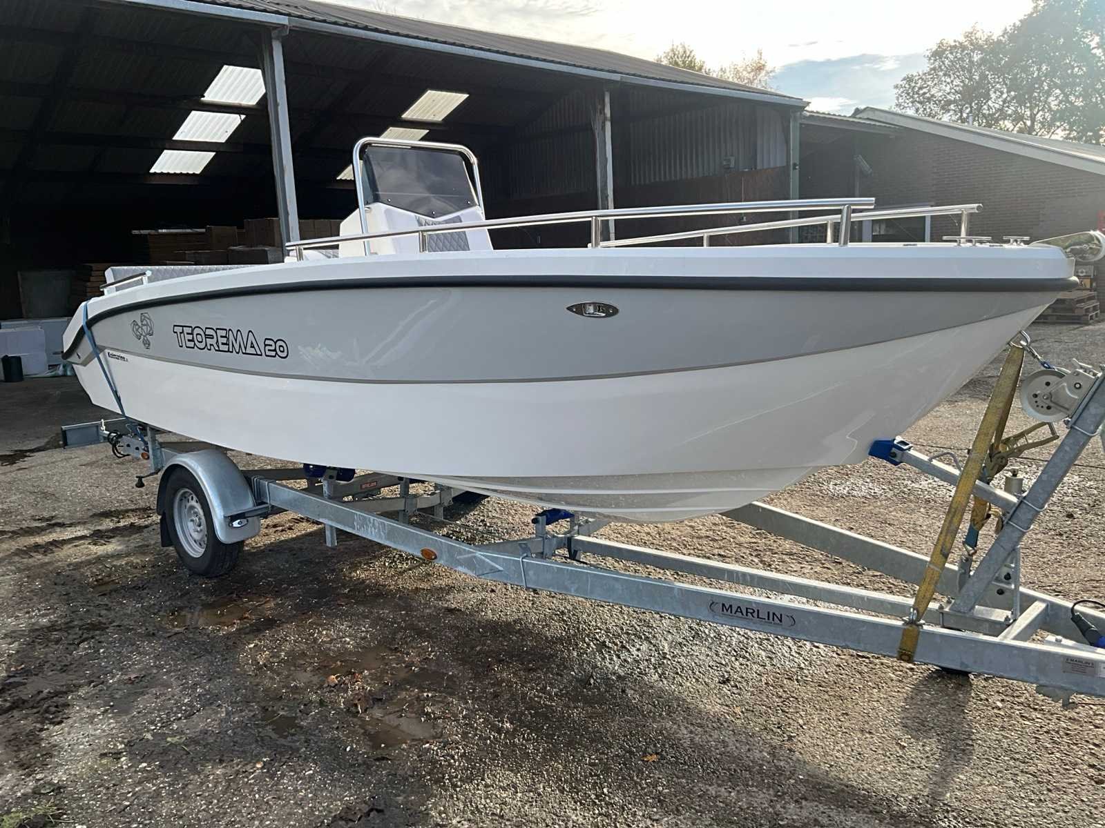 Teorema Sundeck Lengte: 5,92 m Breedte: 2,20 mtr. Maximaal vermogen: 140 pk Aantal passagiers: 7 tot 9 Hoogte binnenwand: 85 cm boeg, 65 cm achtersteven complete binnen- en buitenkussens, mechanisch stuurwiel met stuurwiel, lenspomp, navigatieverlichting, zwemtrap, 2 kajuit patrijspoorten, gekleurde fascia in de zijkant, boeg achtersteven, elektrisch paneel, complete set van roestvrij stalen leuningen, 4 bolders. Kan zonder vaarbewijs gemotoriseerd worden tot 140 pk. Let op!! excl. Trailer en excl. buitenboord motor Merk: Kolmarine Type: Teorema 20 Sundeck Rompmateriaal: Polyester Lengte: 5920 Breedte: 2200