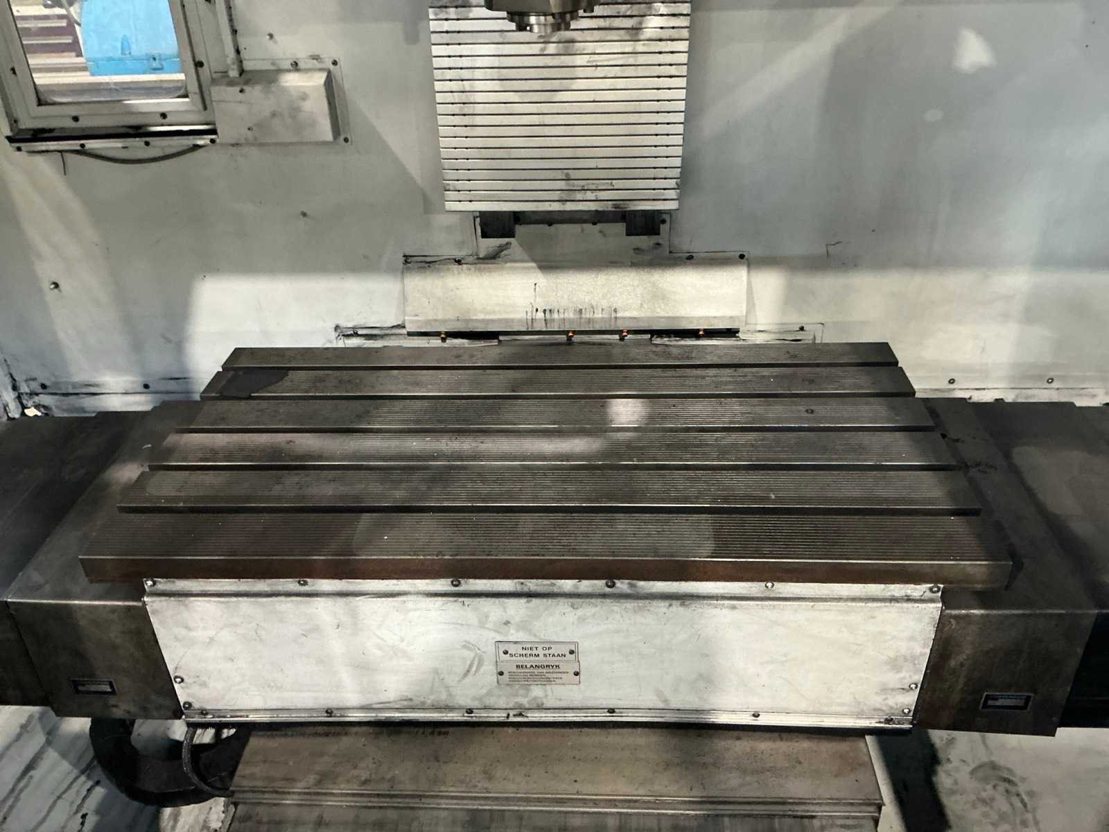 Gereedschapwisselstation aanwezig; arm ontbreekt Merk: Bridgeport Type: VMC 1000 XP Bouwjaar: 2001 Serienummer: 822608 Verplaatsing x-as: 1050mm Verplaatsing y-as: 610mm Verplaatsing z-as: 600mm Opname: SK40/ BT40 Snelheid tot n =: 8000rpm Tafel afmeting l: 1150mm Tafel afmeting b: 850mm CNC-besturing, merk, type: Heidenhain Aansluiting: 400V Machinegewicht: 4200kg Totale afmeting L: 3000mm Totale afmeting Breedte: 2400mm Totale afmeting Hoogte: 2800mm