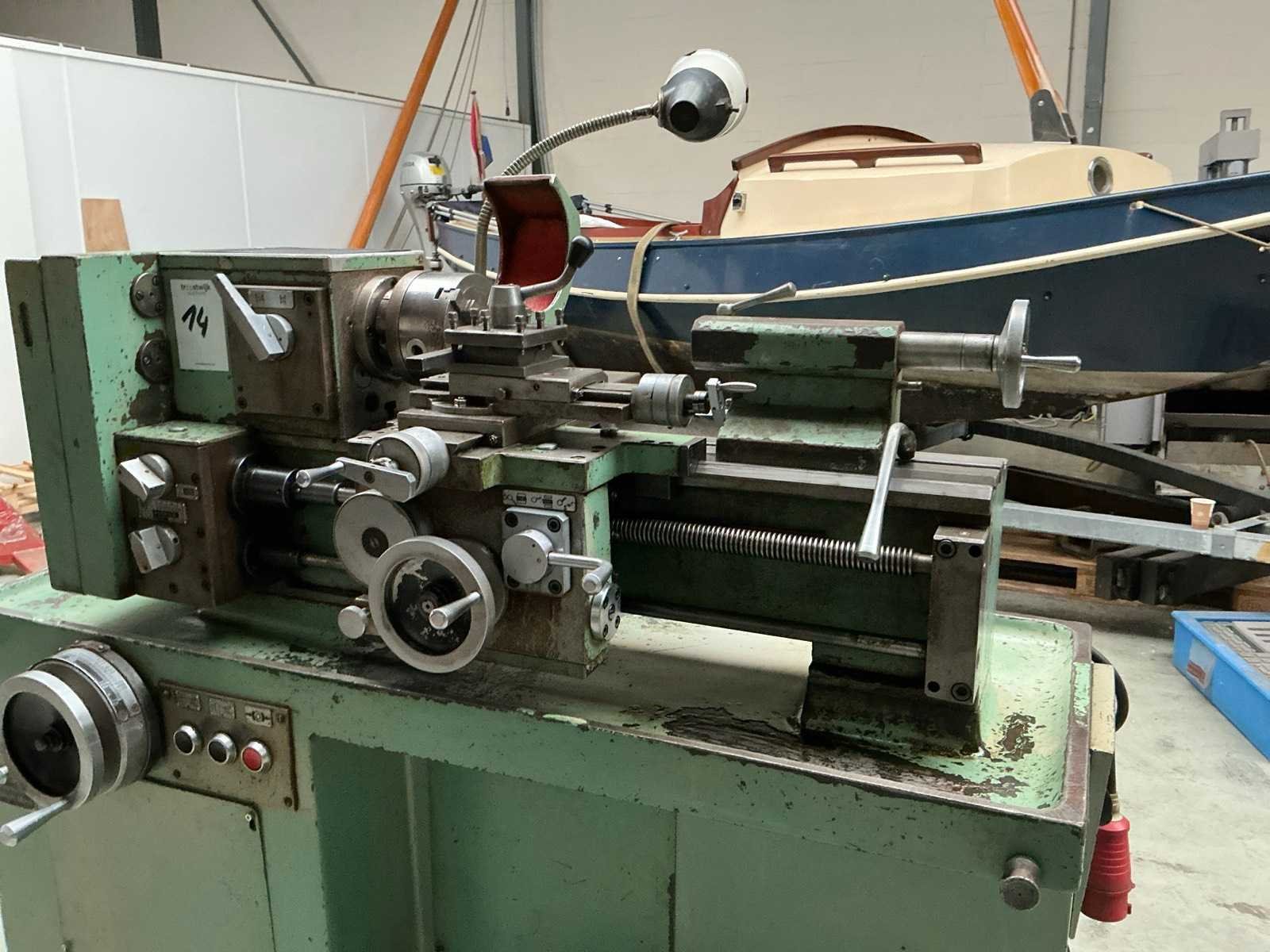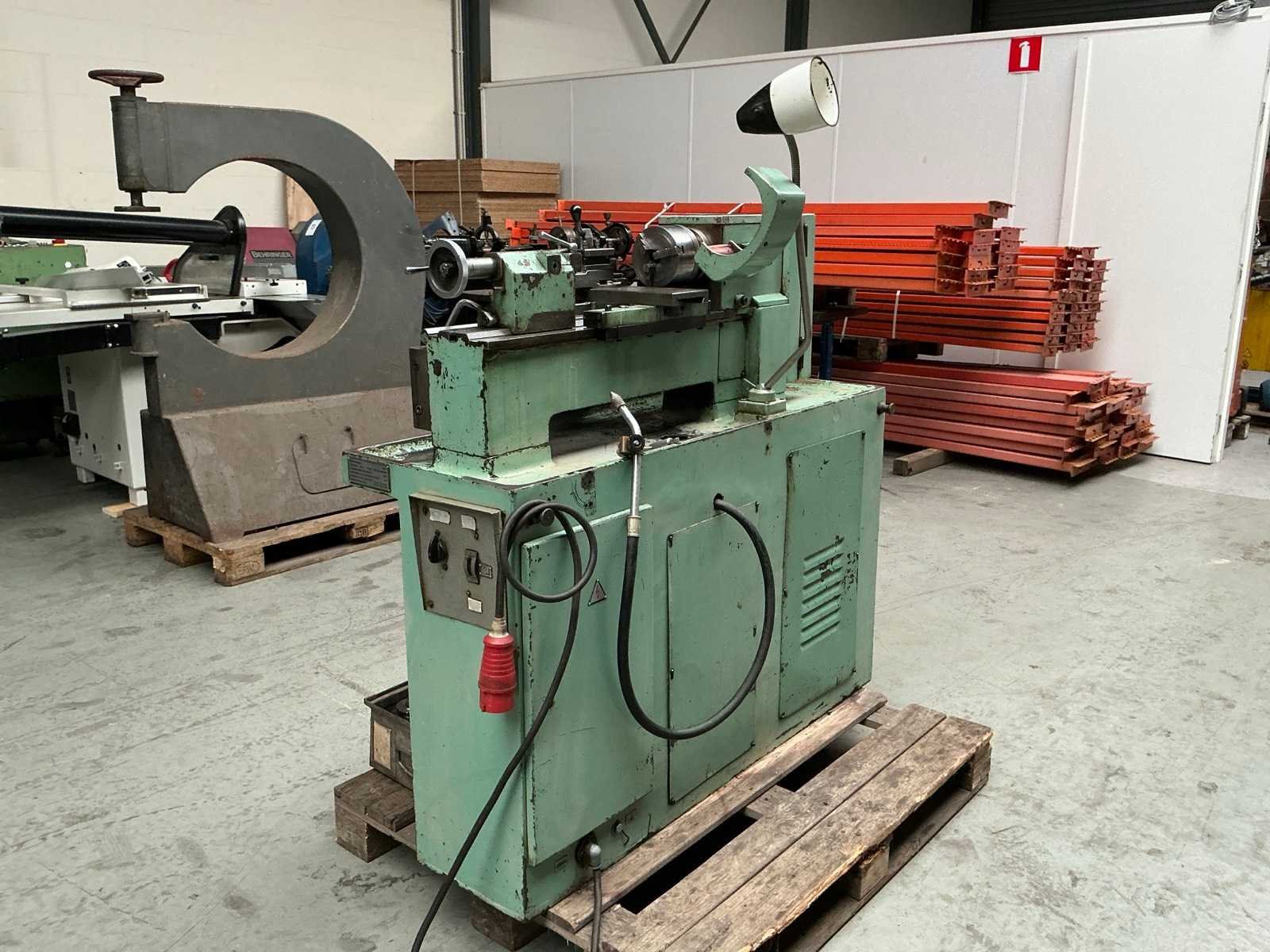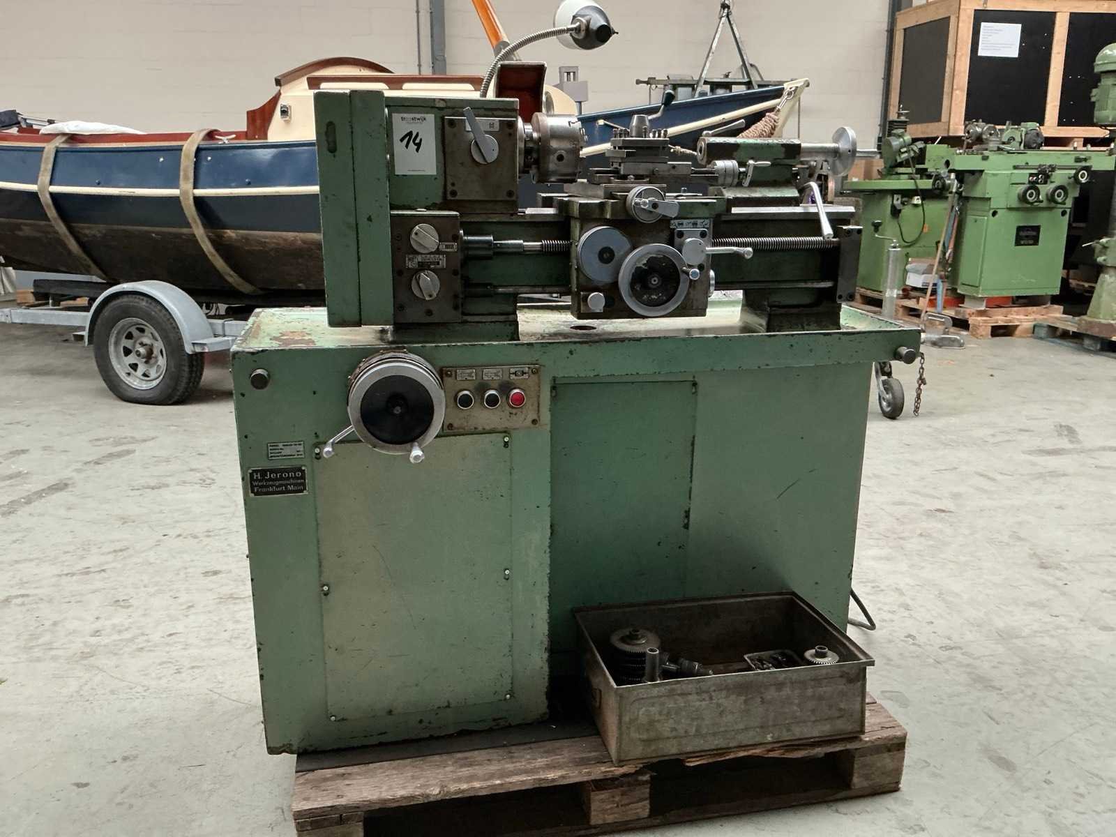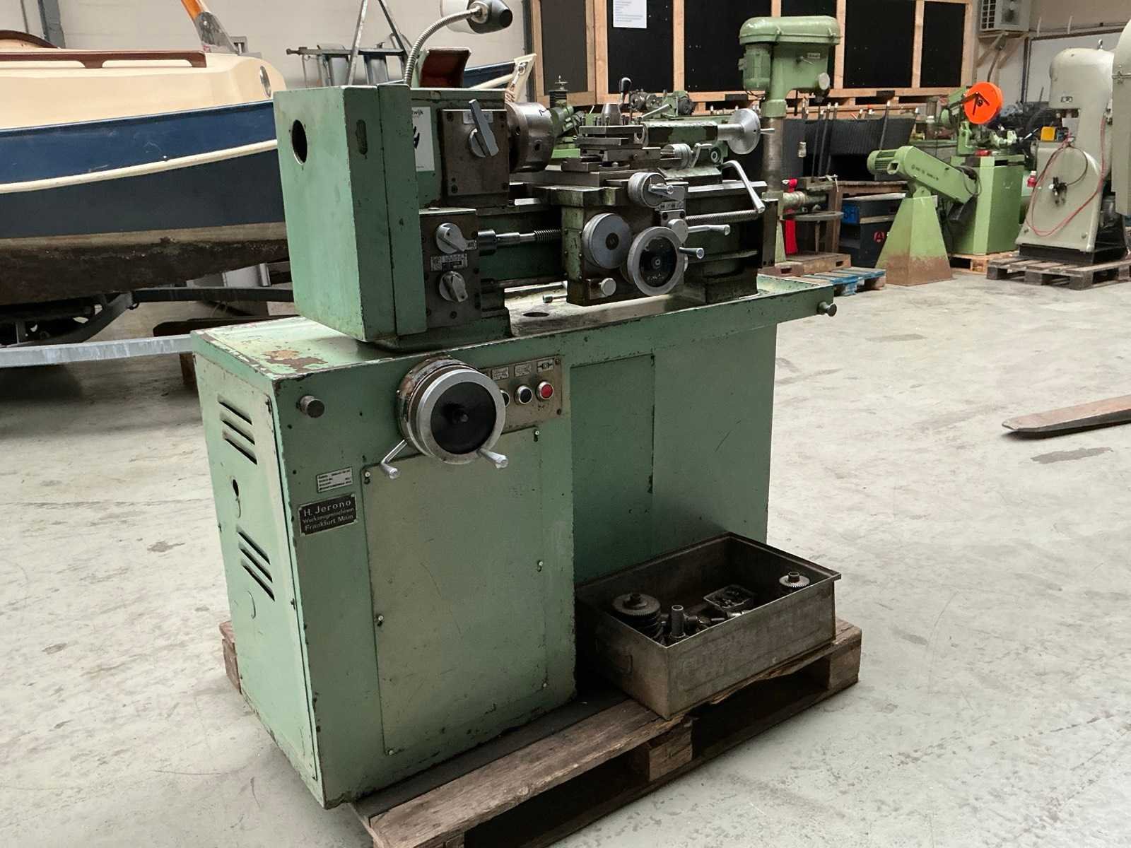 Snelheid traploos regelbaar; met diverse tandwielen; 2x boorkop; 2x centerpunt Merk: H. jerono Bouwjaar: 1976 Draailengte: 400mm Draai: 80mm Holle spil Ø: 20mm Snelheid van n =: 70rpm Snelheid tot n =: 3500rpm Koelmiddelpomp: true Aansluiting: 400V Afmeting l: 1350mm Afmeting b: 700mm Afmeting h: 1250mm