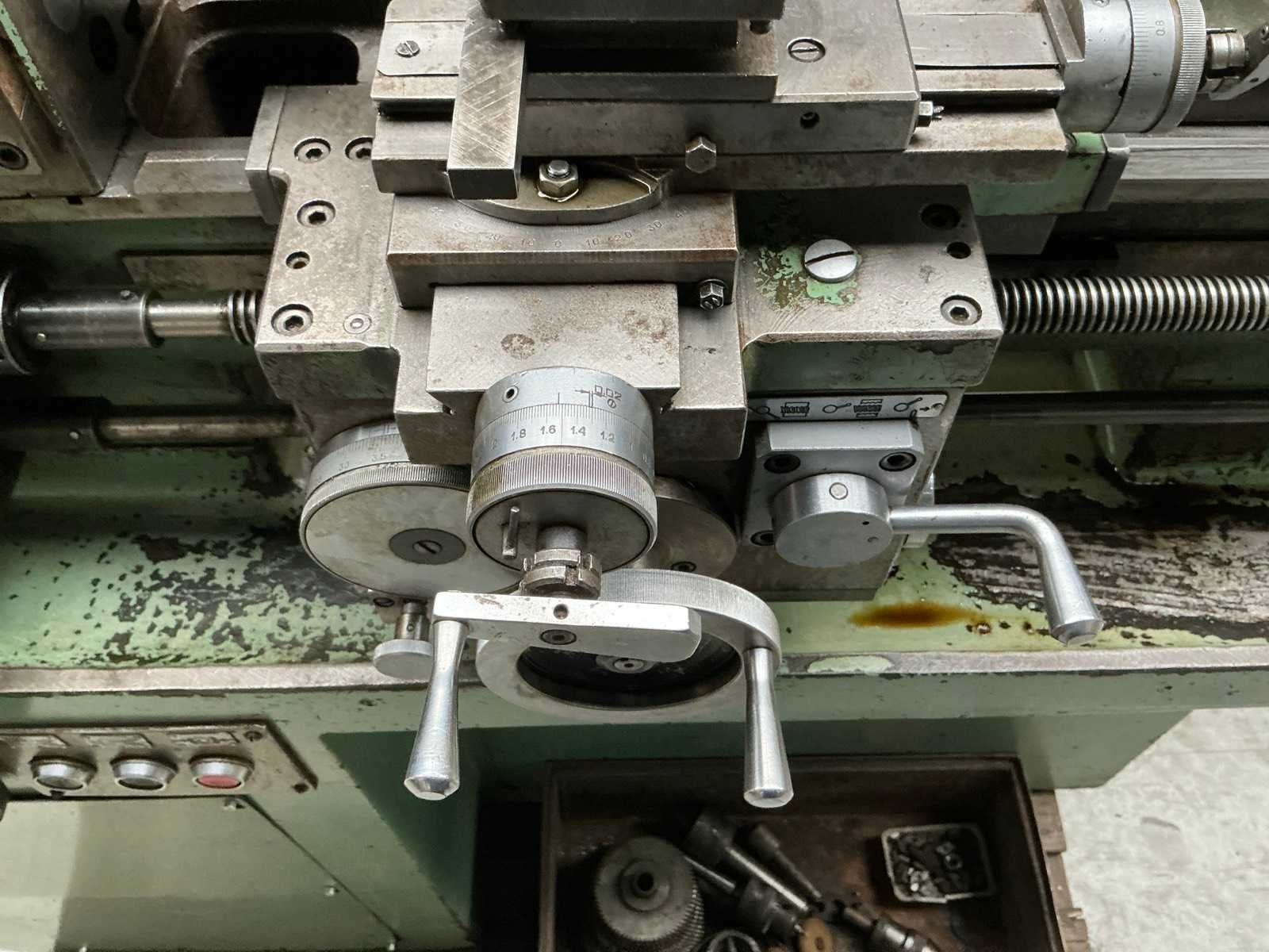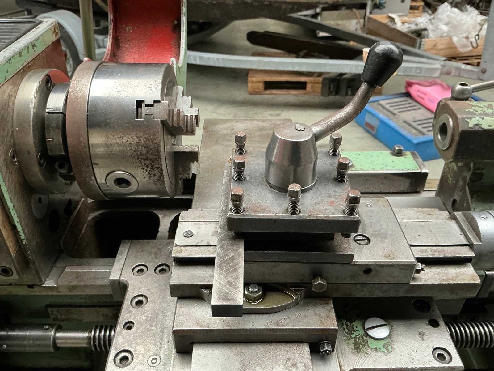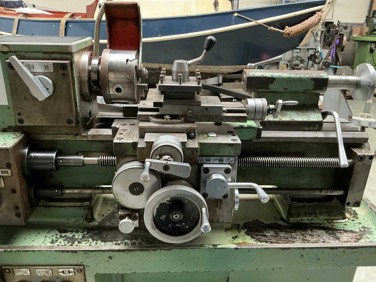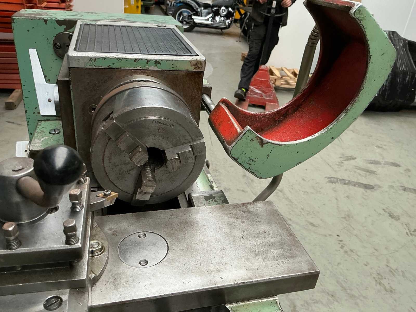 Snelheid traploos regelbaar; met diverse tandwielen; 2x boorkop; 2x centerpunt Merk: H. jerono Bouwjaar: 1976 Draailengte: 400mm Draai: 80mm Holle spil Ø: 20mm Snelheid van n =: 70rpm Snelheid tot n =: 3500rpm Koelmiddelpomp: true Aansluiting: 400V Afmeting l: 1350mm Afmeting b: 700mm Afmeting h: 1250mm