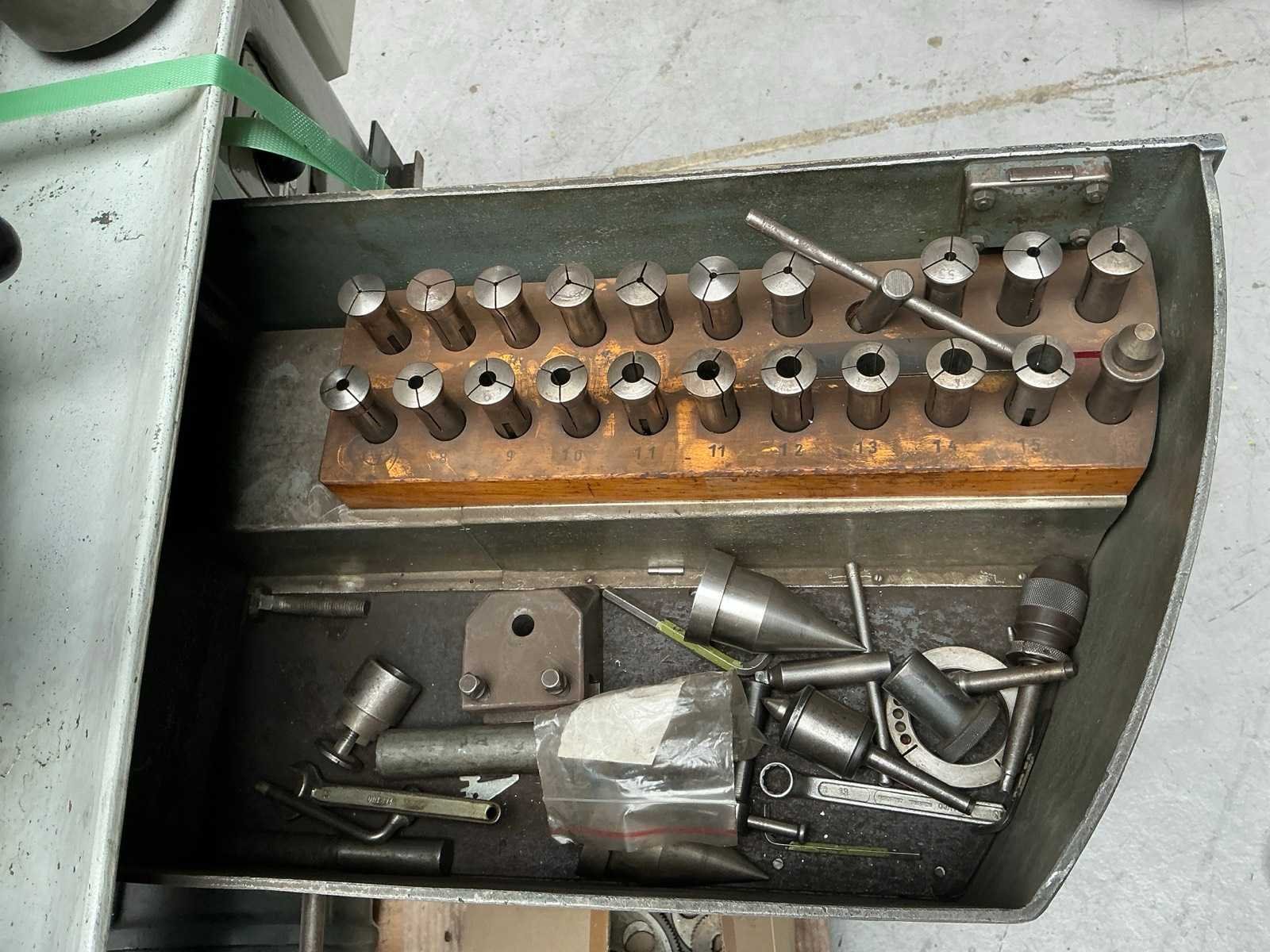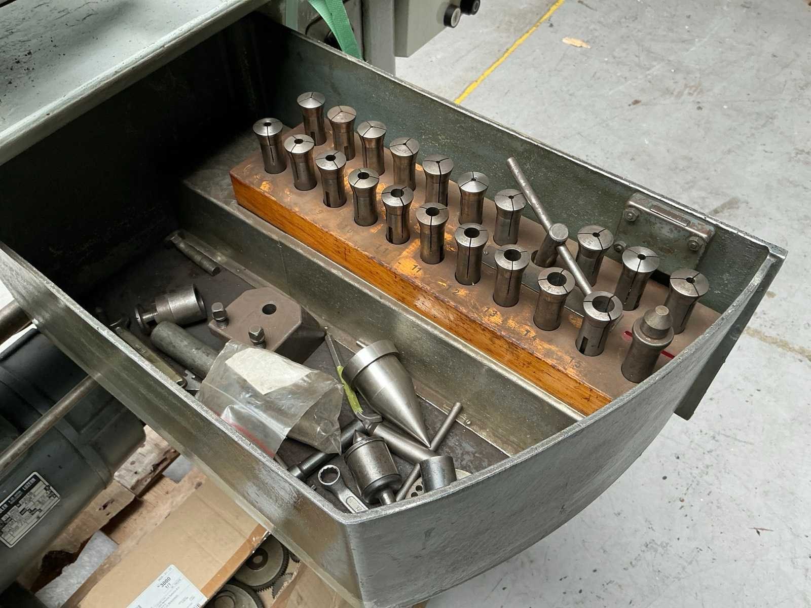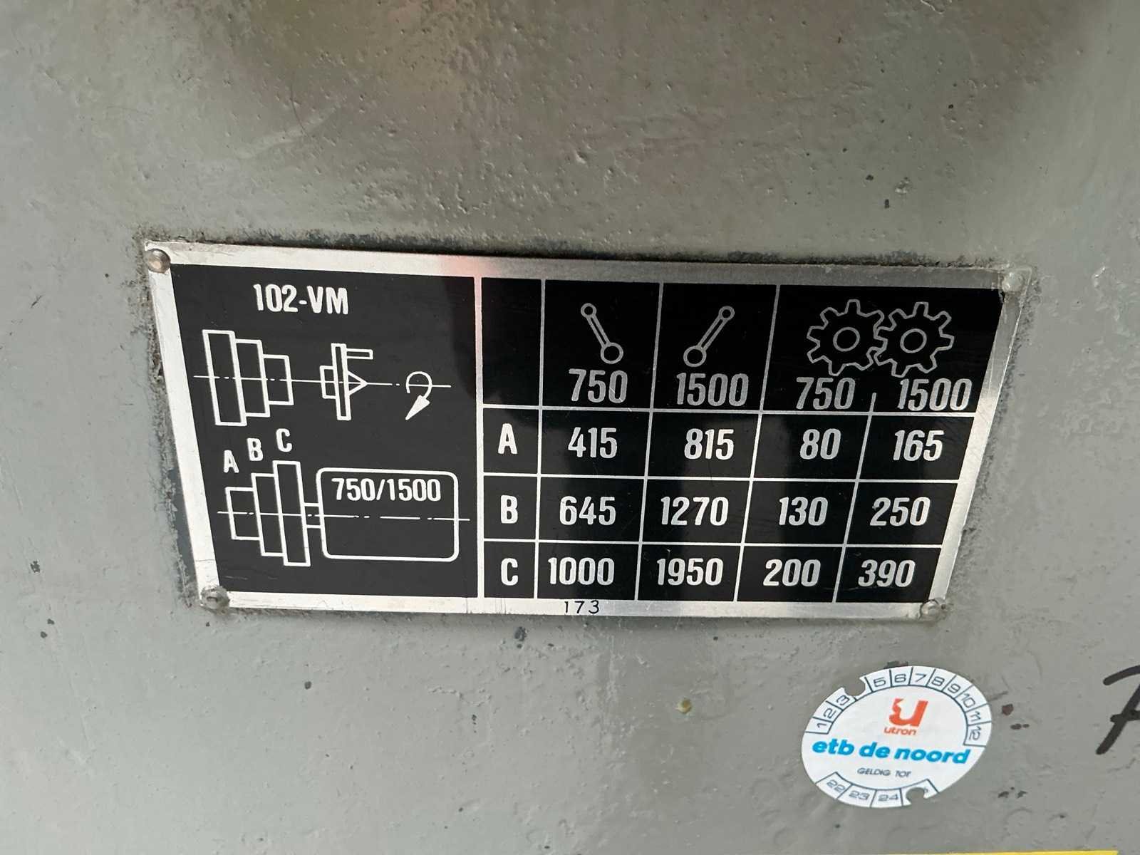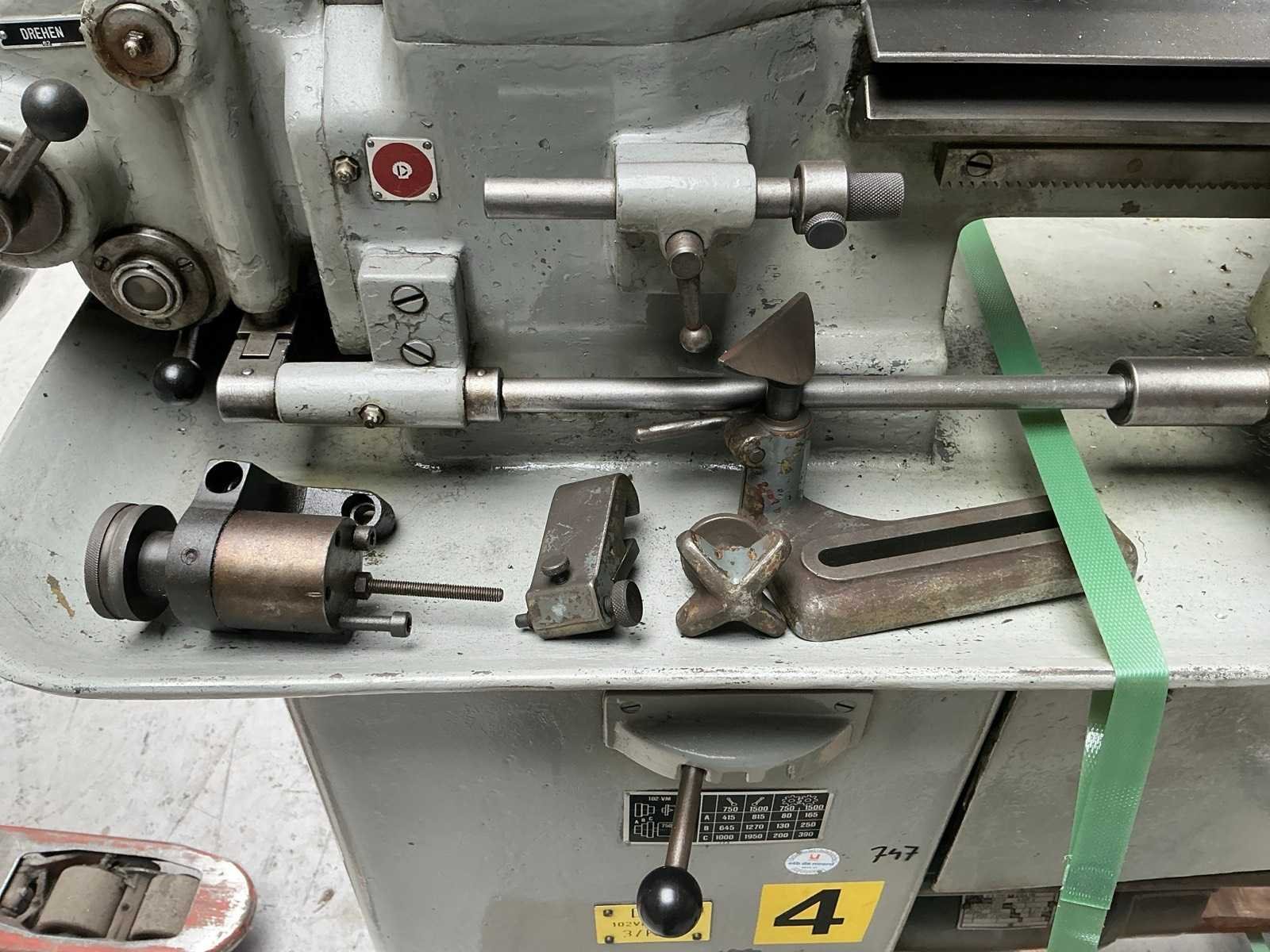 Kniebesturing; met diverse toebehoren Merk: Schaublin Type: 102 VM Bouwjaar: 1955 Serienummer: 85420 Draailengte: 550mm Aantal snelheden: 16 Snelheid van n =: 130rpm Snelheid tot n =: 1950rpm Aansluiting: 400V Afmeting l: 1600mm Afmeting b: 600mm Afmeting h: 1400mm
