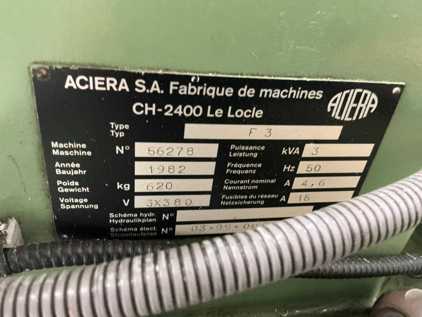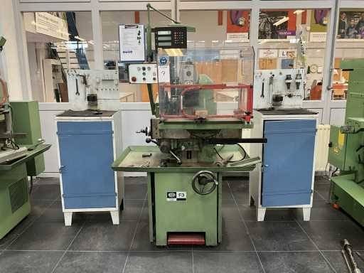Opspantafel kantelbaar; Heidehain digitale uitlezing op de 3 assen; Aciera opname Merk: Aciera Type: F3 Bouwjaar: 1982 Serienummer: 56278 Verplaatsing x-as: 240mm Verplaatsing y-as: 170mm Verplaatsing z-as: 230mm Aantal snelheden: 8 Snelheid van n =: 100rpm Snelheid tot n =: 2000rpm T-gleuf opspantafelafmeting L: 700mm T-gleuf opspantafelafmeting B: 190mm Koelmiddelpomp: true Aansluiting: 400V Machinegewicht: 620kg Afmeting l: 1300mm Afmeting b: 1150mm Afmeting h: 1800mm
