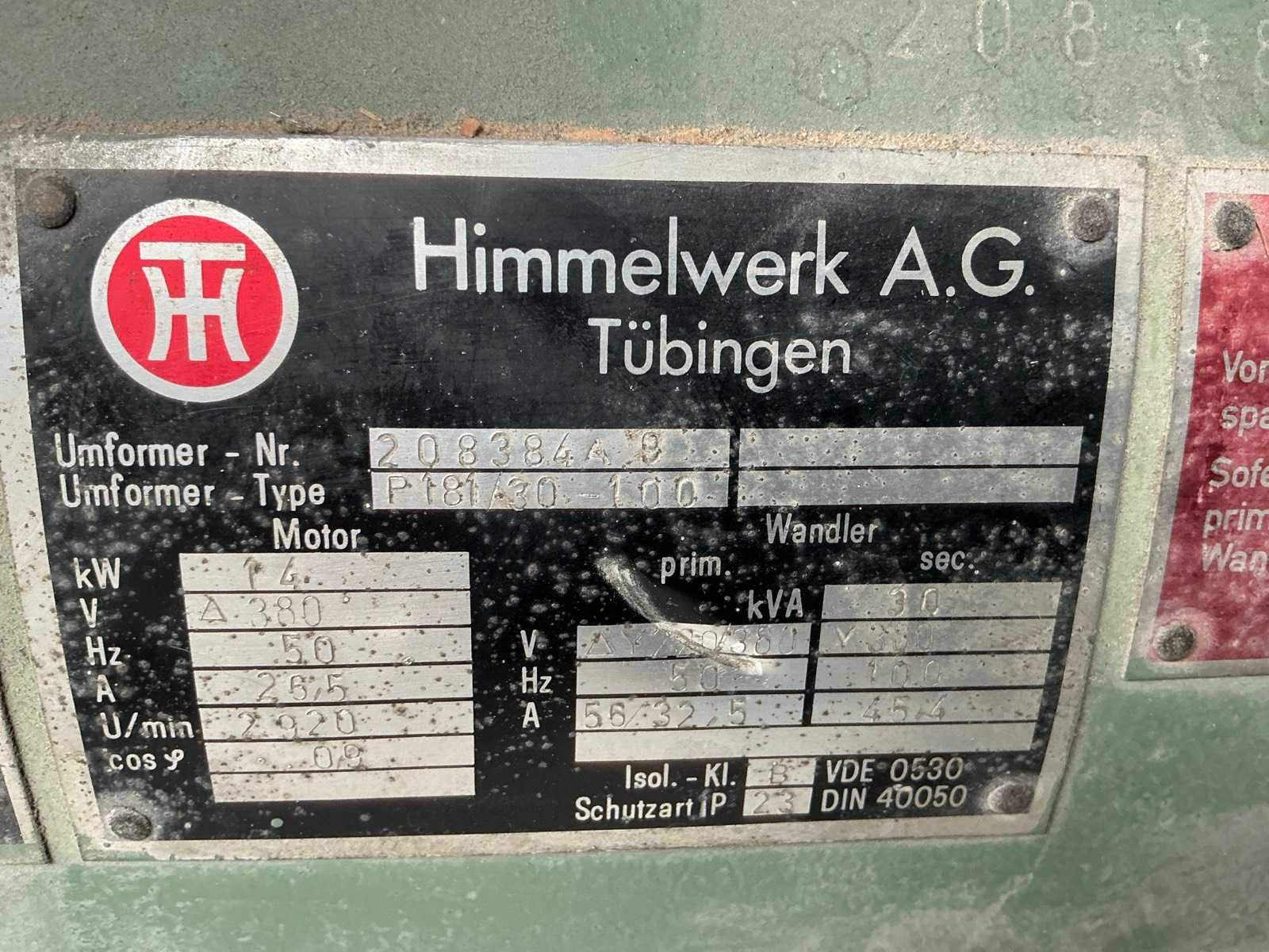 Input 380 Volt 50 HZ; output 380 Volt 100 HZ; 30 kVA Merk: Himmelwerk Type: P181/30-100 Totale afmeting L: 1070mm Totale afmeting Breedte: 390mm Totale afmeting Hoogte: 470mm