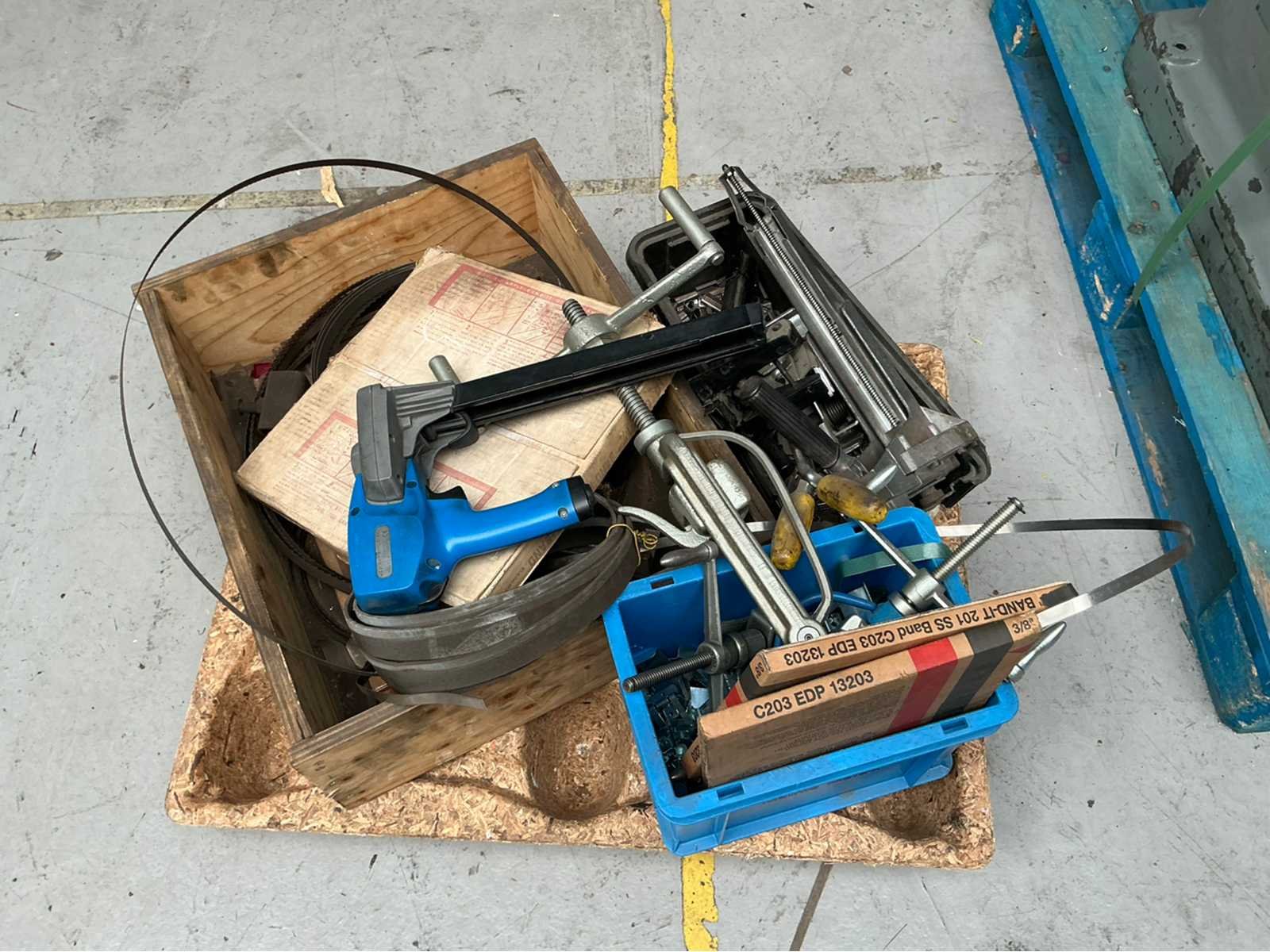 3x diverse staalband aanspantangen; 1x pneumatische tacker; staalband restant